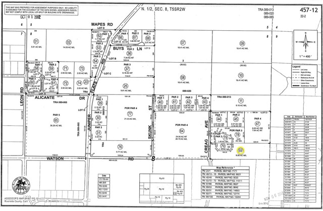 8.06± ACRES OF VACANT LAND IN HOMELAND/JUNIPER FLATS – SOUTHWESTERN RIVERSIDE COUNTY, CA. Seize this rare opportunity to own 8.06± acres in the rapidly growing community of Homeland. This expansive parcel has 331’± of frontage on Creag and extends 860’± along the southern boundary, offering ample space for your custom home, ranch, or private retreat. Located in a propane and septic tank area, utilities are serviced by Southern California Edison (SCE) and Eastern Municipal Water District (EMWD). WATER in street. The water line runs along the frontage on Creag Ave. The water Main is on the Southwest corner of property. EMWD owns a water tank easement that is 1.10+- acres, located on the Northern boundary, approximately 110'+- from frontage. The chain-linked fenced area is parcel -070 and is one-half of the water tanks easement, while the adjacent lot to the North accommodates the other one-half. Sewer is approximately 1,300'+- to the South on Creag Ave. With NO HOA, you have the freedom to bring your RV, camper, trailer, or 5th wheel and start enjoying your land while planning your future build. This huge property features rolling terrain, native shrubs, breathtaking rock outcroppings, and wide-open spaces—ideal for those looking to escape the hustle and embrace a rural lifestyle. Whether you envision a horse ranch, farm, orchard, vineyard, or a self-sustaining homestead, there’s plenty of room for stables, barns, garages, sheds, patios, and gardens. Outdoor enthusiasts will love the ATV-friendly roads, hiking trails, and endless exploration opportunities in the surrounding hills. Meanwhile, the property remains conveniently minutes from local schools, parks, churches, post office, convenience stores, and essential services. Perfectly positioned in the heart of Riverside County, this land offers easy access to major highways including I-215, I-15, Hwy 74, Hwy 79, and the 10, 60 & 91 freeways, making it a smooth commute to Los Angeles, Orange, San Bernardino, and San Diego Counties. Plus, enjoy proximity to shopping centers, malls, casinos, lakes, mountains, and desert recreation. OWNER MAY CARRY! Don’t miss out on this incredible opportunity to invest in Southern California land with endless potential!
