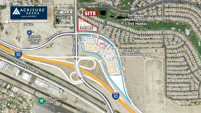 Potential for 10 to 12 acres to be entitled for Multi-Family up to 20 units/acre. Located at the NEC Varner Rd. and Jefferson signalized intersection. Approved site plan for retail. This is the main freeway exit for the Coachella & Stagecoach Music Festivals. 3 Miles to the new Coachella Valley Stadium/Arena, scheduled to open November 2022. Within 1 mile from Shadow Hills High School, Desert Ridge Middle School and a new elementary school coming soon. Indio is one of the fastest-growing cities in the Coachella Valley. Known as the City of Festivals, it welcomes more than 1 million visitors each year. This area is experiencing explosive new growth. We cannot guarantee the accuracy or square footage, lot size or other information concerning the condition or features of property provided by the Seller or obtained from public records or other sources. The Buyer is advised to independently verify the accuracy of all information through personal and professional inspections.