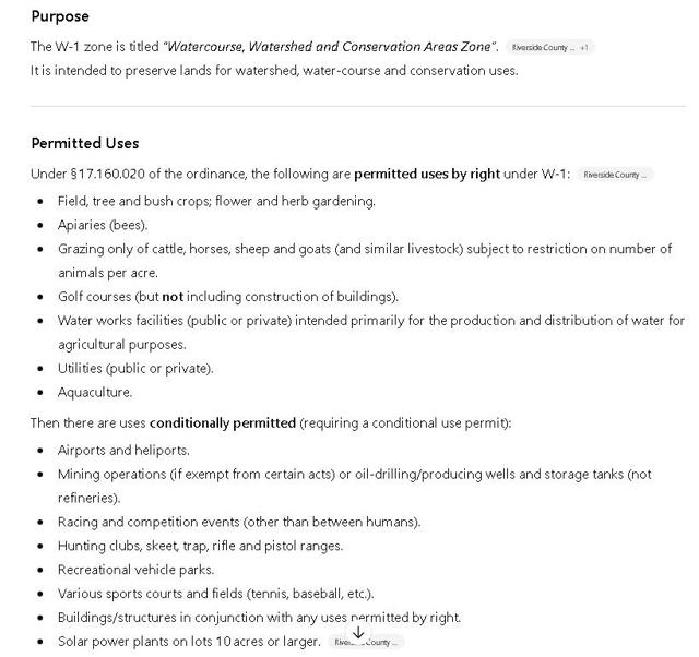 5 Acres lot for sale!Zoned W-1 Riverside County zoningW-1 Zone: This designation in Riverside County is for Watercourse, Watershed, and Conservation Areas.Purpose: The goal is to protect the ecological and scenic values of natural waterways and prevent development that would harm them.Permitted uses: Allowed uses include things like certain agricultural activities, grazing, golf courses, and water works facilities, as detailed in the Riverside County zoning code. HVAC systemW1: In a multi-stage HVAC system, 'W1' is the terminal on a thermostat that controls the first stage of the heating system.Zoned system: A zoned system uses multiple thermostats to control different areas of a building. A single-zone system is one area with one thermostat, while a multi-stage system has multiple heating stages (W1, W2, W3) that turn on as needed to save energy