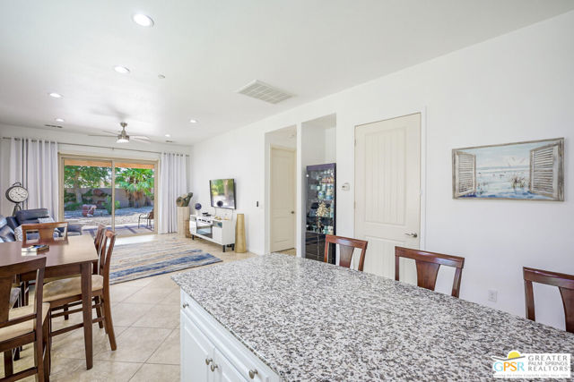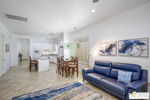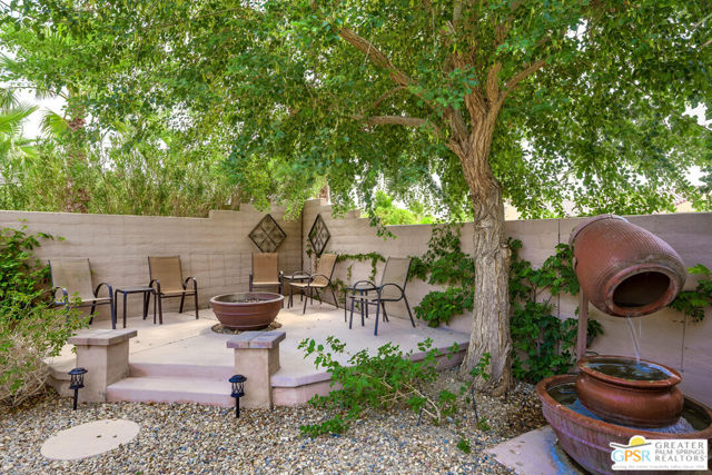 Seller is offering seller financing on this Beautifully Upgraded Hideaway Plan in Sun City Shadow Hills. Room for Pool! Built in 2012, this highly upgraded Phase 3 Hideaway plan offers 1,512 sq. ft. of open-concept living in one of the newest areas of Sun City Shadow Hills, Indio's premier 55+ active adult community. Featuring 2 bedrooms, 2 baths, plus a versatile den that can easily be a third bedroom or home office, this home checks all the boxes. The modern front elevation is enhanced by easy-care desert landscaping and a large, pool-sized lot. Inside, 24x24 diagonal-set modern tile flows through the main living spaces, complemented by plantation shutters throughout. The chef's kitchen boasts crisp white cabinetry, granite countertops, a stool-height prep island, dining area, and great room perfect for entertaining. The spacious primary suite includes patio access through a glass slider and features a barn-style door leading to the luxurious bath with dual vanities, walk-in shower, and a generous walk-in closet. Guest bedroom and primary closets have upgraded diagonal patterned carpet. The extended garage includes an insulated overhead door, anchored storage cabinets, and side door access to a walkway connecting to the driveway. Outdoor living shines here with an extended concrete patio, Alumawood cover, fire pit, tranquil water feature, raised garden beds, and gorgeous sunset skies.Enjoy resort-style living in Sun City Shadow Hills, with championship golf, pickleball, tennis, fitness center, pools, clubhouses, and endless activities. This move-in ready home offers comfort, upgrades, and space to design your dream desert lifestyle.
