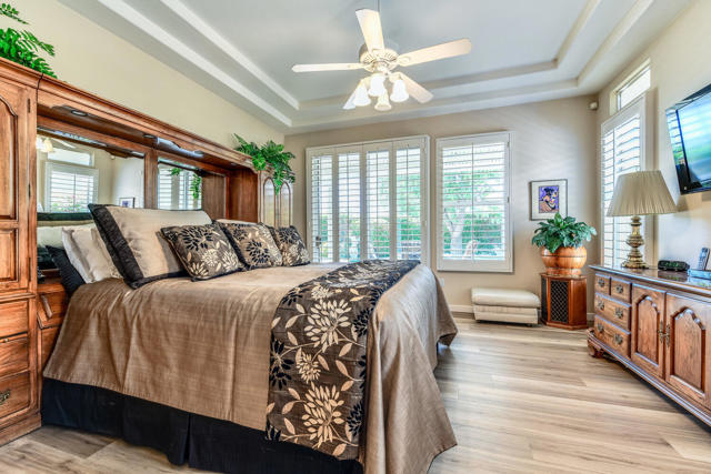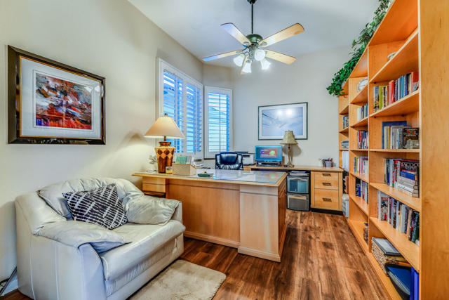 Welcome to this meticulously maintained Prestwick Model, offering 2,200 sq ft of well-designed living space. This 3-bedroom, 2-bathroom home includes a versatile den and blends comfort, style, and function throughout.Step into the elegant formal living and dining areas--ideal for hosting guests--while the expansive great room with a cozy fireplace provides the perfect space to relax and unwind. The chef-inspired kitchen features an oversized island, ample cabinetry, generous counter space, and a charming dining nook for casual meals. Luxury vinyl and tile flooring flow seamlessly through the main living areas, while plush carpeting in the bedrooms adds warmth and comfort. Custom window treatments, including silhouettes and shutters, enhance the home's timeless appeal. The spacious primary suite is a private retreat, featuring large walk-in closet, and a spa-like bath with a soaking tub and walk-in shower. Two well-appointed guest bedrooms are served by an updated bathroom with a stylish walk-in shower. Additional features include a newer water heater, AC/furnace and ceiling fans throughout. The two-car garage is air-conditioned, adding comfort and functionality. Enjoy beautifully landscaped front and back yards with low-maintenance desert landscaping and artificial turf, a private gated front patio, and pavers on the driveway, as well as the front and back patios. The backyard is a serene escape--complete with a private spa, a partially covered patio, and plenty of space to relax or entertain. Located in the sought-after Heritage Palms Country Club, residents enjoy access to resort-style amenities including an 18-hole championship golf course, indoor and outdoor pools, a fitness center, tennis and pickleball courts, and a clubhouse with dining and year-round social activities. All this just minutes from top shopping, dining, and entertainment in the heart of the Coachella Valley. Don't miss your chance to live in one of the area's premier 55+ communities--schedule your private showing today!