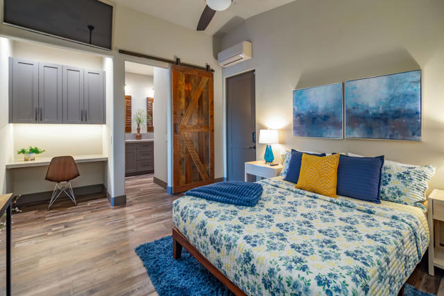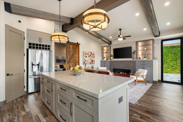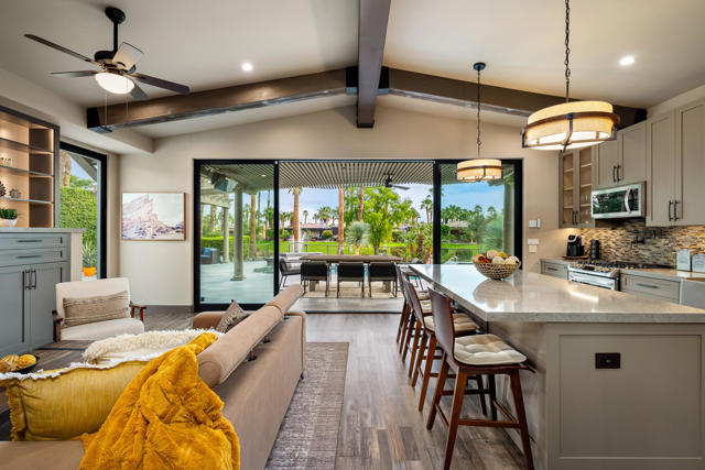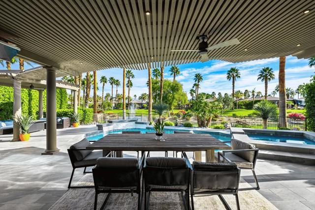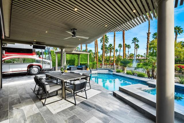 #63 DESERT SHORES RESORT Discover unparalleled luxury in the prestigious Desert Shores Motorcoach Resort. This meticulously renovated property blends modern elegance with serene lakeside living, offering breathtaking eastern exposure with views of the lake, fountain, and Shadow Hills. Designed for relaxation and entertainment, this move-in-ready lot delivers the ultimate motorcoach lifestyle. Step into your private oasis, where a beautifully refinished pool & spa feature cascading spillways, updated tile, pebble plaster, and modern equipment. Expansive porcelain tile decking extends across the patio and driveway, creating a seamless outdoor living space. The primary covered patio is equipped with a waterproof cover, electric heaters, recessed lighting, and a ceiling fan, while a secondary covered patio and portable BBQ station enhance your entertainment options. A smooth stucco exterior, metal Bahama awnings, wrought iron fencing, and low-maintenance desert landscaping--highlighted by majestic 15+ ft. date palms--elevate the property's curb appeal. Inside, every detail exudes sophistication. The gourmet kitchen features shaker cabinets, quartz countertops, a designer backsplash, farmhouse sink, stainless steel appliances, and a spacious walk-in pantry. The great room showcases luxury vinyl plank flooring, faux wood beams, a linear fireplace flanked by custom cabinetry, crown molding, and an 18-ft. stacking slider glass door for seamless indoor-outdoor flow. The en suite retreat boasts dual vanities, an oversized shower, private water closet, and a walk-in closet with built-in organizers. A separate den with a recessed workspace adds versatility for work or relaxation. Designed with state-of-the-art technology, this property includes upgraded plumbing with an on-demand tankless water heater, LED lighting, Lutron smart controls, and a 10-camera security system with remote access. Additional features include 8-ft. solid core doors, custom barn doors, smooth drywall finishes, and quartz countertops throughout. The climate-controlled garage offers split-system AC/heating, epoxy flooring, and washer/dryer space for ultimate convenience. With 1,210 sq. ft. of total living space (810 sq. ft. enclosed), this fully furnished, turn-key property is move-in ready. HOA dues cover landscaping, lake maintenance, 24-hour security, lawn care, high-speed internet, and community amenities. Desert Shores is a Class A Motorcoach Resort for 36'-45' motor