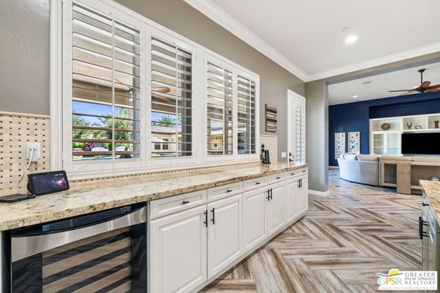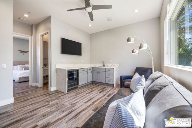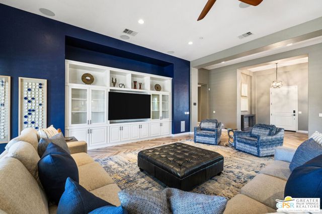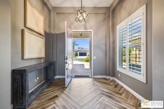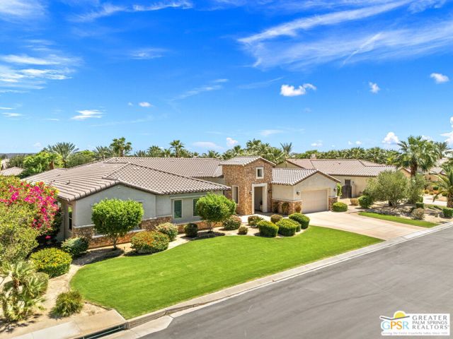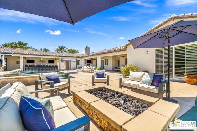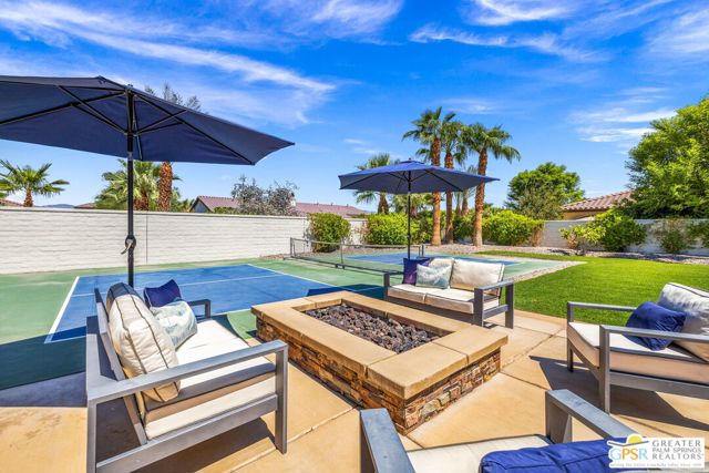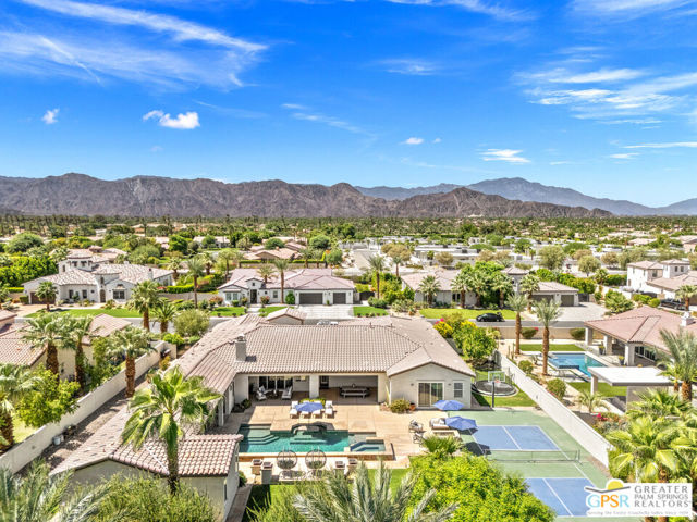 MADISON ESTATES luxury living! This impressive 5-bedroom, 5.5-bath residence spanning over 5,000 square feet offers 5 ensuite bedrooms with a detached 2-room casita in the mix. Open concept living with tall ceilings blends seamlessly to an expansive outdoor entertaining space designed for year-round enjoyment. A fabulous covered patio with fireplace, sparkling pool and spa, outdoor shower, and multiple dining and lounging areas are complemented by a huge outdoor kitchen with large island with built-in fire pit and dual TVs framing the space. Additional fire features frame the pool, misters keep things cool, and the view at night is spectacular. A private pickleball court completes the resort-style setting. Inside, the kitchen is the heart of the home, anchored by a substantial island with impressive seating capacity for gathering and entertaining. Custom cabinetry, a 5-burner gas cooktop, dual ovens, and refined finishes set the tone. The living area off the kitchen flows beautifully for entertaining, complemented by a formal dining room. Ensuite bedrooms enjoy a nice separation, with two lining each wing of the home, and the casita offering even more flexibility. Herringbone tile, custom woodwork, tall ceilings, and lovely finishes throughout add sophistication. The primary retreat opens to the pool area and features a private sitting area, spa-like bath with soaking tub and walk-in shower, and an impressive walk-in closet. Separate garages accommodate three cars in total. Madison Estates is a private gated enclave of just 55 homes on half-acre lots. Residents enjoy privacy, scale, and prestige along with proximity to the Empire Polo Club, PGA West, The Madison Club, and the valley's world-class golf, dining, and entertainment, all with low HOA fees and land you own. Enjoy it all!
