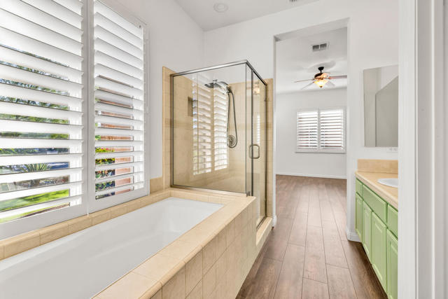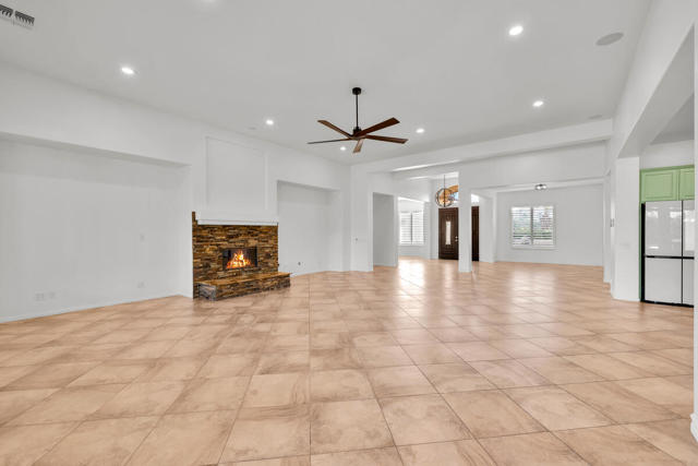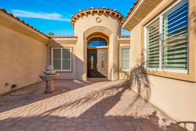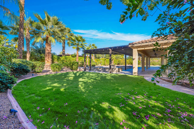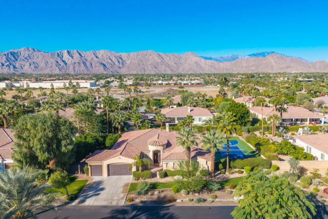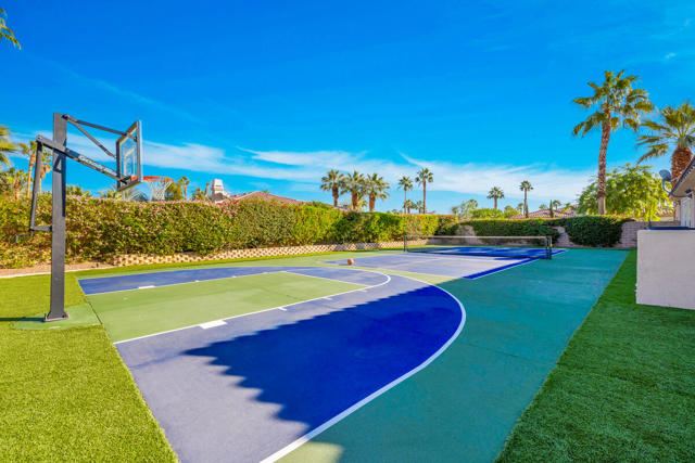 Welcome to Desert River Estates--an exceptional luxury retreat offering the ultimate in desert living. Situated on over half an acre. This impressive 4,056 sq. ft. smart home estate features 4 bedrooms, 4 bathrooms, an office, and an expansive open floor plan designed for both comfort and sophistication. The resort-style backyard is an entertainer's dream with a sparkling pool and swim-up bar, professional-length pickleball court, half-court basketball setup with NBA-rated glass backboard, sunken fire pit lounge, BBQ area, and extended covered patio. Inside, soaring ceilings and abundant natural light highlight the seamless flow between the chef's kitchen, great room, and formal dining area. The luxurious primary suite includes a spacious walk-in closet and spa-inspired bath, while the private en suite casita provides ideal guest accommodations. 4 car garage. Side area great for RV Parking. Recent upgrades include new interior paint, Phillips Hue Smart Lighting throughout the home, refinished cabinetry, designer flooring, smart pool and lighting systems, variable-speed HVAC with hospital-grade filtration, epoxy garage floors, two EV chargers, and upgraded smart toilets. The grounds feature an enhanced irrigation system and multiple mature fruit-bearing trees, including citrus and stone fruit varieties. Located in the gated enclave of Desert River Estates near 49th and Jefferson--just moments from the Empire Polo Grounds, home of Coachella and Stagecoach--this residence rests on one of the community's largest lots. A true desert sanctuary blending elegance, privacy, and resort-style luxury.