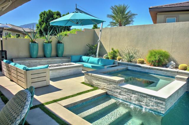 A true desert oasis! This home is in the ''all ages'' section of the community that's a short distance from the clubhouse and community amenities. The Refresh Model has 1937SF with open concept living spaces that includes a chef inspired kitchen with GE Monogram appliances, a wine refrigerator, upgraded cabinets, and oversized quartz island. The lounge area features a contemporary gas fireplace. The den can be used as a home office or library. Upgrades include recessed lighting, contemporary dining area lighting, ceiling fans, and custom window treatments. Access the patio, rear and side yard through a large rolling wall of glass. The backyard features mountain views, a private pool/spa, firepit, and outdoor kitchen complete with grill, pizza oven and more. The garage includes epoxy floors and mini split AC. Optional Buyer paid club membership transfer fee = $1,875 (vs. $12,500 if not a member). Monthly Club Fee $210.00. Club amenities include tennis/pickleball courts, fitness center, resort/lap/fitness pools & spa, poker/billiards room & artisan studio. Community also features putting green, bocce ball court, large chess game area, and walking trails.