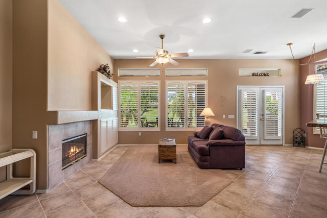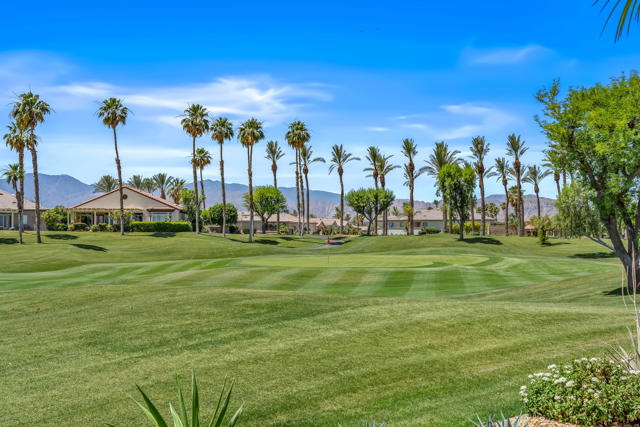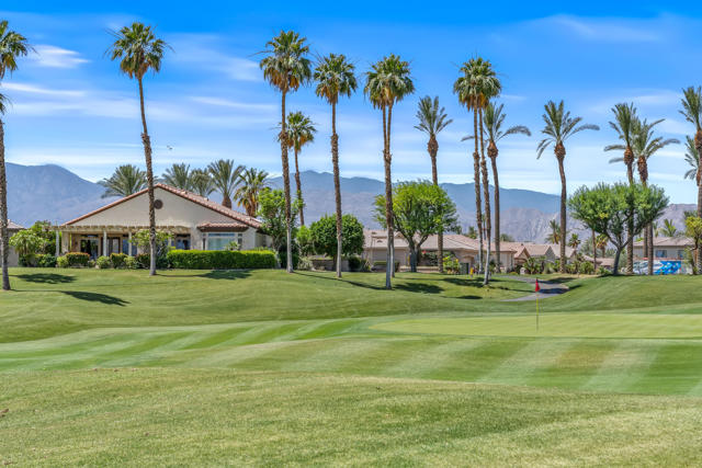 SOUTH VIEWS of the 15th green, fairway and beautiful local mountains. Located just a short stroll to the clubhouse, this lovely 1827 sq.ft. 2 bedroom 2 bath home has never been on the market prior. Featuring an open great room design, beautiful slab granite kitchen counters, refinished cabinetry, SolaTube above kitchen sink for loads of natural light, Plantation shutters, extra deep garage to accommodate a golf cart and French doors in lieu of sliders. The roomy primary suite has dual closets, split vanities and custom tiled large shower and soaking tub. Additional upgrades include three bay windows, Fireplace, built-in BBQ, surround sound, artificial turf and entry courtyard. Located near the 15th green, the extended and covered SOUTH facing rear patio is a wonderful place to relax and take in the peaceful desert lifestyle. Heritage Palms is a premier adult community featuring an 18 hole championship golf course, indoor & outdoor pools, pickleball & tennis courts, fitness center, grill room, card rooms, billiards room, social clubs and more.