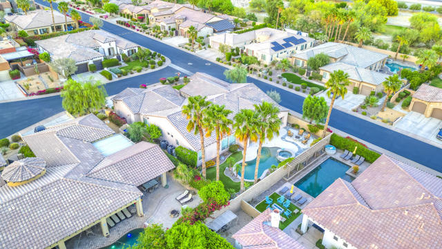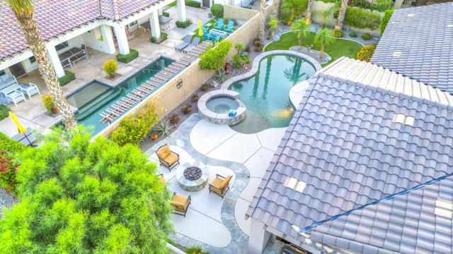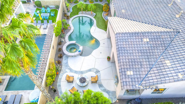 Tuscan-inspired resort home in Montage Santa Rosa, an STR-friendly gated community just minutes from world-class events. A gated courtyard opens to a grand foyer with soaring vaulted ceilings and statement chandeliers. The 4BD/3.5BA layout (plus den/office) balances elegance and function: formal dining with butler's pantry, and a chef's kitchen with double ovens, granite counters, walk-in pantry, and a generous breakfast nook flowing to a light-filled family room with 9' ceilings. Quality finishes include appliances/fixtures from Pacific Sales and tile/quartz selections from Arizona Tile. The south-facing backyard is an entertainer's dream with saltwater PebbleTec pool/spa and a large covered patio. Retreat-style primary suite offers two oversized walk-in closets, soaking tub, and walk-in shower. Major upgrades: dual Rheem 5-ton 16 SEER ACs & furnaces (2022), water heater (2024), pool heater/pump/control system (2017). Three-car garage with potential to convert one bay to an attached casita for added flexibility and income potential (buyer to verify). A compelling option for full-time living, a vacation retreat, or a high-performing STR.