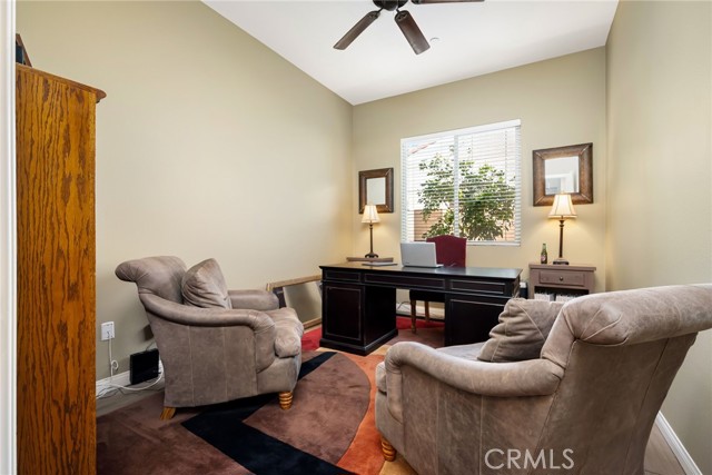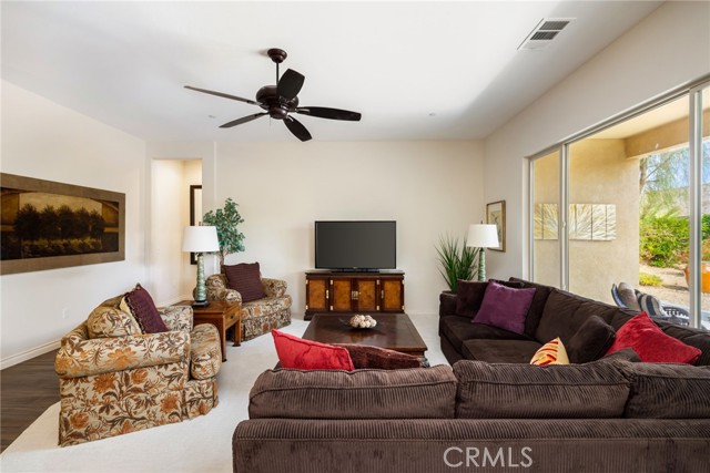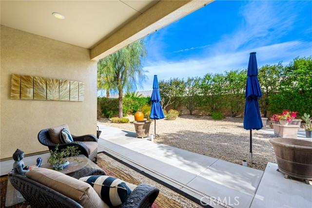 Desert Elegance Meets Modern Comfort in Sun City Shadow Hills Experience refined desert living in this meticulously maintained 2-bedroom, 2.5-bath plus office, RETREAT floor plan home, ideally located within the vibrant 55+ active adult community of Sun City Shadow Hills. With 1,950 sq ft of thoughtfully designed space, this residence blends upscale design, practical functionality, and a relaxed resort-style lifestyle. Step inside to discover porcelain plank wood-look tile flooring throughout the main living areas, adding warmth and durability, complemented by high-end plush carpeting in both the primary and guest suites for added comfort. The home’s layout offers a spacious primary suite and guest room with en suite bath, a generously sized flex den or office (potential third bedroom), and a conveniently located powder room for guests. Unique design details include a designer sculpted pattern inset in the living room and ample storage throughout, including a well-appointed laundry room. The gourmet kitchen is a chef’s dream, featuring a KitchenAid stainless steel appliance package, solid hardwood cabinet doors, a custom oversized island with dramatic granite countertops, and a bespoke sidebar cabinet with stone surface, ideal for entertaining or as a stylish bar setup. Soft-close drawers and doors complete this elevated culinary space. Outdoors, enjoy the covered back patio with a built-in mister system, perfect for warm summer days. The spacious north facing back yard is private and low maintenance The 2-car + golf cart garage is equally impressive, boasting insulated doors, overhead storage, and a mini-split A/C system ideal for year-round comfort whether you're working on projects or storing gear. This exceptional home combines quality upgrades with the comfort and convenience that make desert living truly extraordinary.