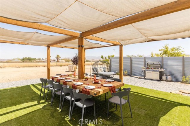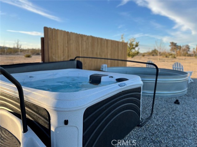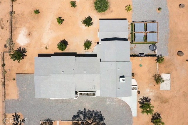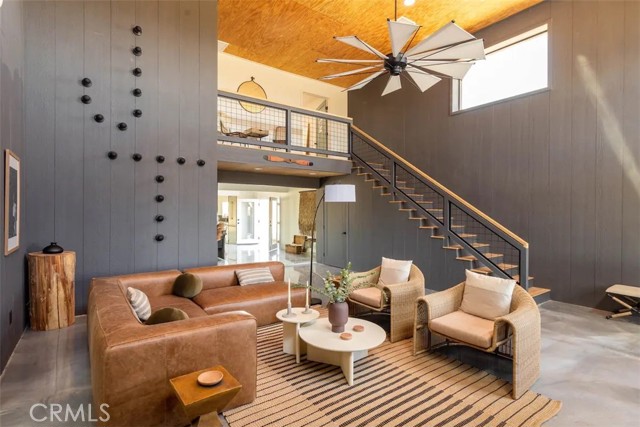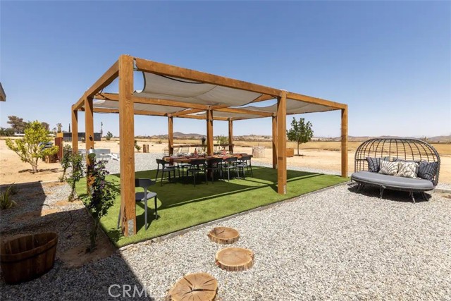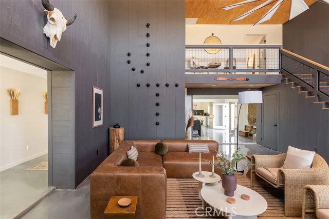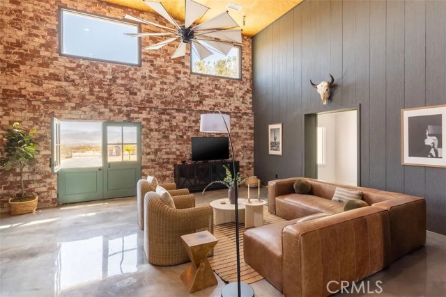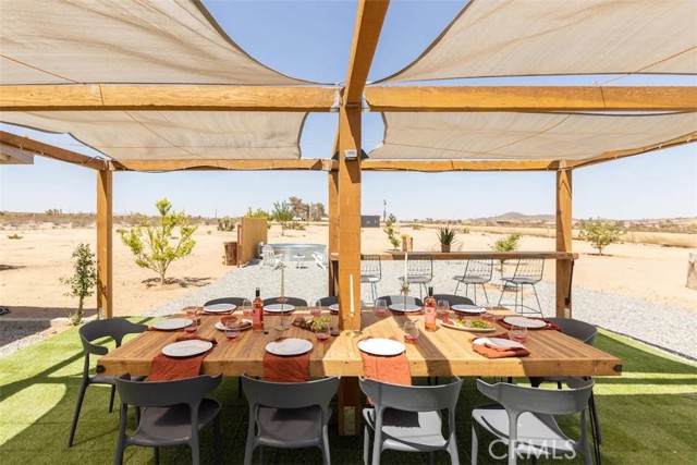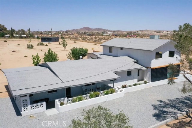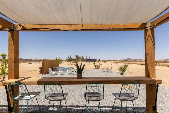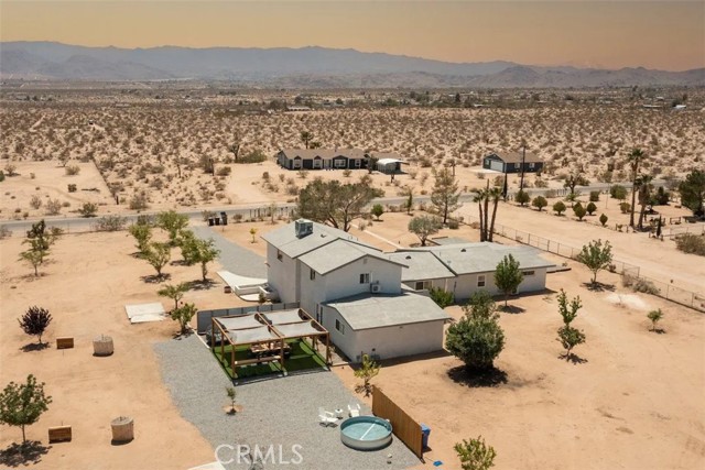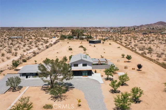 Prepare to be amazed by this extraordinary creation! Expertly designed and meticulously crafted, this unique Joshua Tree retreat is situated in a dream desert location. Nestled on nearly 5 acres land, fully fenced acres, this stunning estate offers breathtaking desert views and sunsets. It features 4 bedrooms, 5 bathrooms, and an oversized media room, plus a separate detached guest or creative space. As you enter the main living area, you are greeted by soaring ceilings and top-of-the-line, custom-crafted designs and accents in every direction. The phenomenal layout maximizes privacy while creating an entertainer's paradise. The home comes fully furnished with designer-selected new and vintage pieces included in the sale, exuding Joshua Tree's artistic and quirky culture throughout. The primary suite occupies the entire upper level, featuring a lavish penthouse-like ensuite, walk-in closet, and romantic desert views. Each bedroom has its own custom-designed ensuite bathroom. The grand open-concept kitchen is a chef's dream, with handcrafted doors, a live-edge wood custom-built island, and direct access to multiple lounge areas, including a covered dining area with built-in water misters and bar seating. The outdoor space is a true playground for all ages. Enjoy a refreshing dip in the oversized outdoor cowboy pool, entertain friends at the horseshoe ring, or host an unforgettable gathering in the resort-like private setting. The separate retreat is perfect for guests, parties, or creative endeavors such as a future recording studio, artist retreat, or in-law quarters. The sleek U-shaped driveway offers ample parking, including an EV charger. Conveniently located on a paved road near downtown Joshua Tree, Joshua Tree National Park, and nearby art and music festivals, this property is ideal for those seeking a profitable vacation rental investment or a dream desert home. This rare gem is sure to impress!