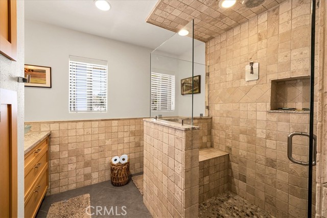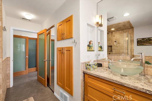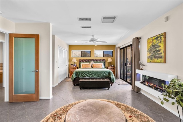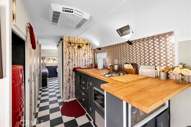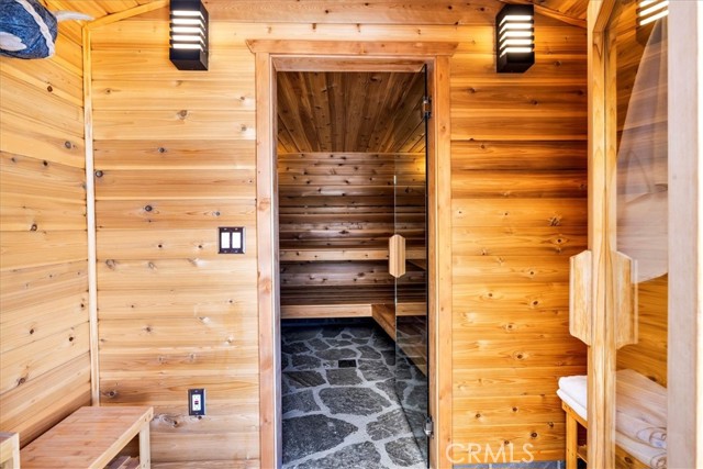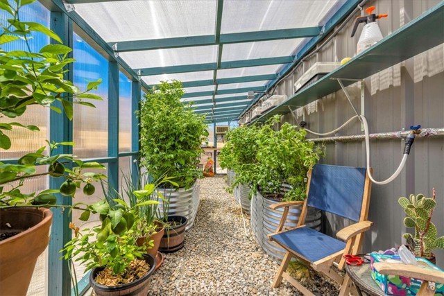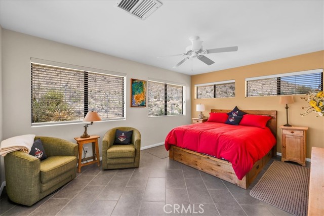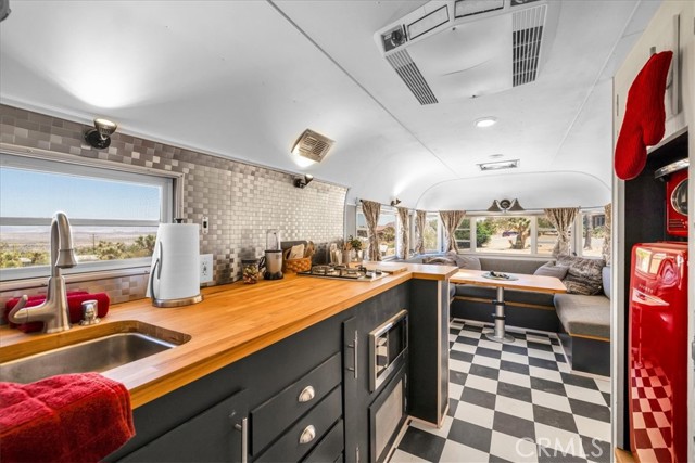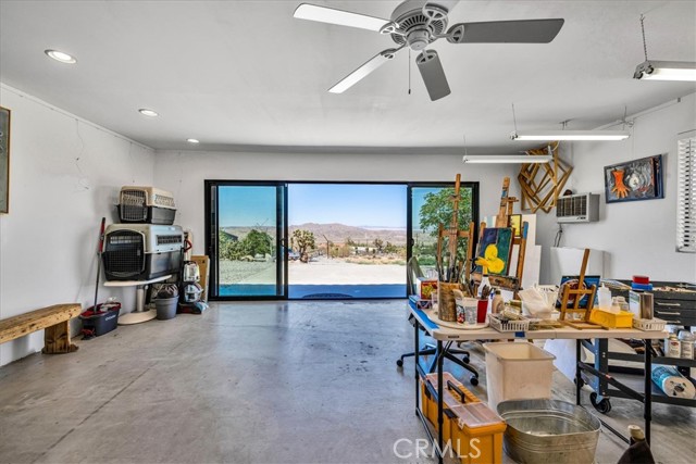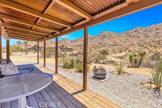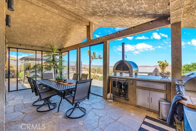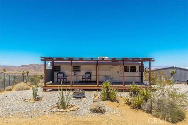 7880 Wesley Road, located in the Friendly Hills neighborhood of Joshua Tree, is a thoughtfully designed desert retreat set on 2.7 acres with sweeping 180-degree views of the Morongo Basin and beyond, and features an 1,800-SQUARE-FOOT CLIMATE-CONTROLLED STEEL SHOP THAT IS AN ARTIST OR MUSICIAN’S DELIGHT, COMPLETE WITH A BATHROOM AND A COZY LOUNGE AREA. This remarkable property blends peaceful desert living with artistic inspiration and practical amenities—all supported in part by an owned 11kW solar system and just minutes from downtown Joshua Tree and the entrance to Joshua Tree National Park. Approximately two acres of the property are fully fenced, offering privacy and ample space for pets or gardening. The main house offers approximately 2,300 square feet of living space and features four bedrooms, including a spacious primary suite created by combining two bedrooms, a large office converted from a fourth bedroom, and a guest bedroom with an ensuite bathroom featuring an oversized shower. A climate-controlled greenhouse adjoins the steel shop for added versatility. In total, the home includes three bathrooms: a full bath with a soaking tub adjoining the primary bedroom, a second ensuite bathroom, and a third with a pedestal sink near the office. Inside, you’ll find porcelain tile flooring throughout, extra-wide hallways, and large closets in both the bedrooms and hallways for generous storage. The living room offers a wood-burning fireplace and a custom-built wall unit with a large TV and integrated network cabling. The open kitchen features granite counters, recessed lighting, and a large pantry, while the separate laundry room provides additional storage and includes a washer and dryer. Outdoor living is exceptional, centered around a full outdoor kitchen with granite counters, built-in BBQ, smoker, sink, and wood-burning pizza oven adjoining a partially enclosed outdoor dining area. Additional amenities include a cedar-planked sauna with a dressing room, an outdoor shower, and a spa. A fully refurbished 30-foot Silver Streak trailer serves as a charming guest house with its own covered redwood deck overlooking the canyon.