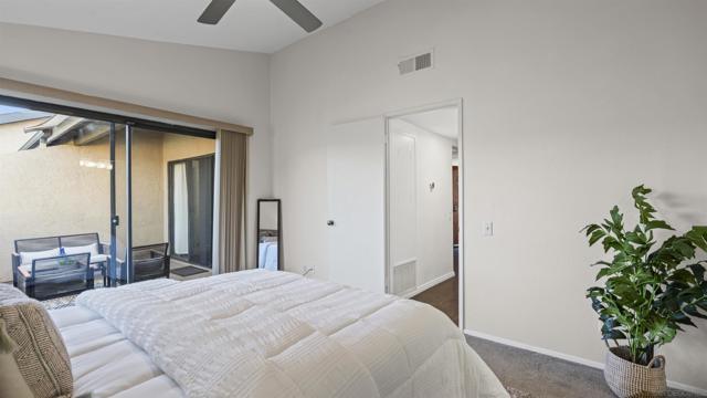 Welcome to Avocado Village Ct # 140. Situated in a serene community - this top level corner condo offers privacy and scenic hillside views. Features include vaulted ceilings, fireplace, in unit laundry, A/C, updated flooring and new recessed lighting. The kitchen offers modern appliances that were updated this year. Enjoy the private patio with stunning views and large glass slideres from both the primary bedroom and living room. Just a few steps away from your 1 car garage with ample storage and shelves. And an additional dedicated parking spot located near the unit. Enjoy the well maintained walking paths and community pool & spa. Located near parks, shopping, dining and major freeways. HOA covers water and trash.