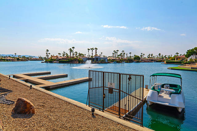 Discover the rare magic of lakefront living surrounded by desert beauty. This 3-bedroom, 3-bath custom home is one of 110 homes on the lake in the gated community of Lake La Quinta perfectly blends elegance, comfort, and resort-style relaxation.Step through a custom entryway and into a bright, open great room framing breathtaking views of a 26-acre private lake and its glistening water feature. The high ceilings and indirect lighting create a luminous, airy atmosphere throughout the home.Designed for both entertaining and everyday luxury, the chef's kitchen features slab granite countertops, travertine flooring and an adjacent wet bar--ideal for hosting friends and family. The seamless indoor-outdoor flow extends to an infinity pool with brilliant blue accent spa. Interlocking pavers connect to lakeside sitting areas where you can unwind, dine al fresco, or wave to neighbors who may pass by on their electric boats for a sunset cruise.The spacious primary suite offers direct access to the pool, spa, and private dock--a serene retreat with a soaking tub, double-sink vanity, separate shower, and a large walk-in closet. Each guest bedroom includes its own private bath, ensuring comfort and privacy for all.Beyond your home, enjoy exclusive community amenities--tennis, pickleball, bocce ball, a scenic park, BBQ pavilion, and a heated pool--all within a 24-hour guard-gated neighborhood offering unmatched peace of mind. A three-car garage with generous storage completes this stunning desert oasis. The 3rd car garage may be converted to an attached casita.Lakefront luxury. Desert serenity. Resort living every day. Make this extraordinary home your next chapter--schedule your private tour today!