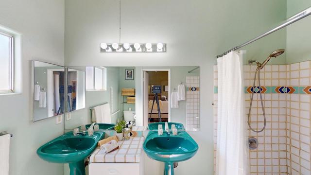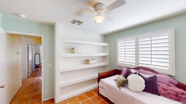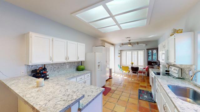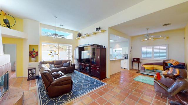 Experience desert living at its finest in this charming Santa Fe-style home nestled in the coveted La Quinta Cove. Surrounded by breathtaking mountain views, this single-story residence features 3 bedrooms, 2 baths, and 1,494 sq. ft. of open living space designed for comfort and style. The light-filled interior showcases high ceilings, clerestory windows, and beautiful terracotta tile flooring throughout. The spacious living area includes a cozy fireplace and direct access to the private backyard retreat. The kitchen offers granite countertops, white cabinetry, a breakfast bar, and a cheerful dining area with plantation shutters. Step outside to your own private oasis featuring a sparkling pool, sun patio, and covered pergola perfect for dining or entertaining under the desert sky. Additional highlights include an attached two-car garage, central HVAC, and a serene setting just minutes from Old Town La Quinta's shops, dining, and hiking trails. Ideal as a primary residence, seasonal getaway, or investment property, this home combines warmth, character, and the relaxed elegance of desert living.
