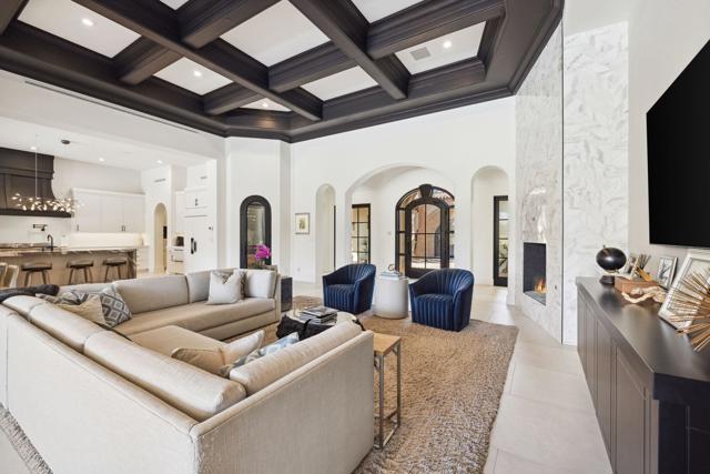 Welcome to one of the most remarkable properties in the prestigious Hideaway community of South La Quinta. Perhaps one of the largest and most private residences in the entire community, this 20K sq ft lot expands into acres of unobstructed southwest facing mountain views. With no other homes in sight from the interior view, this residence provides what is unparalleled privacy that is unique and will remain forever. The property has been transformed by the current owners over the last 12 years, expanding the initial lot through a land purchase from the club in 2014 and then subsequent work over the years has resulted in what can only be described as exposing a previous diamond in the rough. Positioned on the 16th hole of the Clive Clark course, this home is perfectly positioned at the end of a rare single lined cul-de-sac. This 5-bedroom, 5 1/2-bathroom residence all on one floor, features dual master suites, a fully enclosed courtyard entry that sets the tone for the refined living within. The interior showcases timeless architectural details including arched doorways and a modern wood coffered ceiling in the great room. A recent complete re-model blends classic Hideaway style with a modern flare, the result is a true turnkey opportunity for those looking for something special. Wall-to-wall pocket doors seamlessly connect indoor and outdoor living, leading to a sprawling covered patio with a built-in outdoor grill, firepit, and fireplace. The resort-style backyard is a true desert paradise, featuring a 40 ft pool with an elevated spa and baja shelf that leads to a perfect setting with a special view. The updated rear of the property is accentuated with fire features both at the pool's edge and an elevated outdoor entertaining area with firepit. Adjacent to the firepit is your own lighted bocce ball court. The property has a professionally designed outdoor sound system encompassing buried subwoofers and 16 speakers for an unparalleled and private listening experience. 53731 Via Mallorca, a rare and refined offering in one of the desert's most exclusive enclaves--this is Hideaway living at its finest.