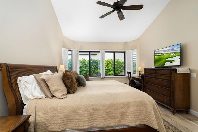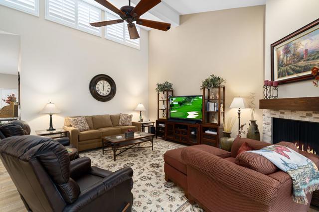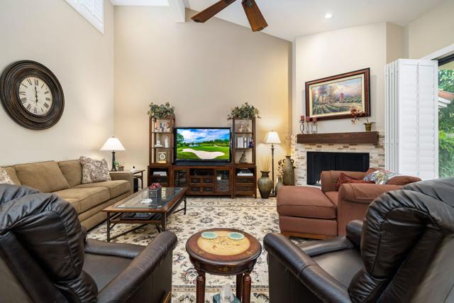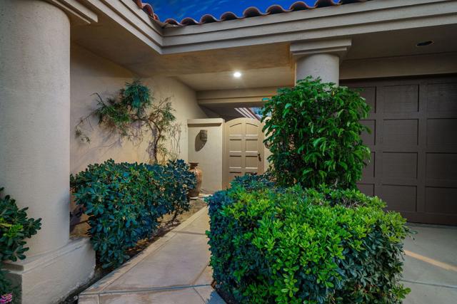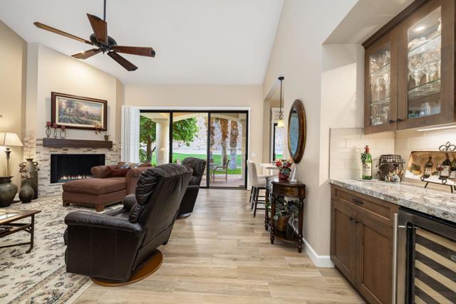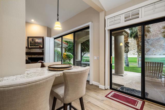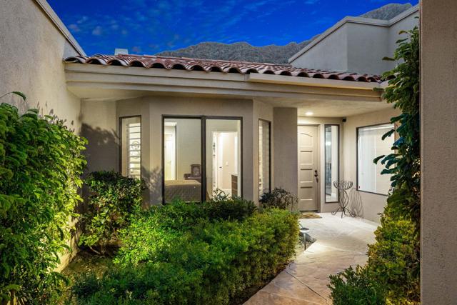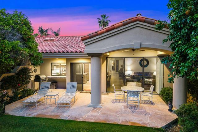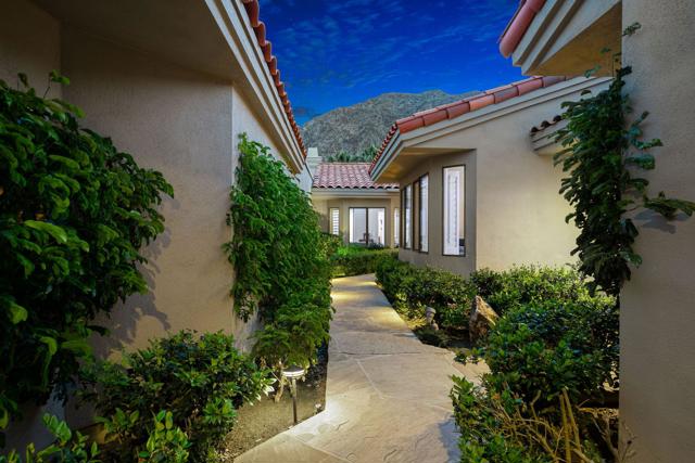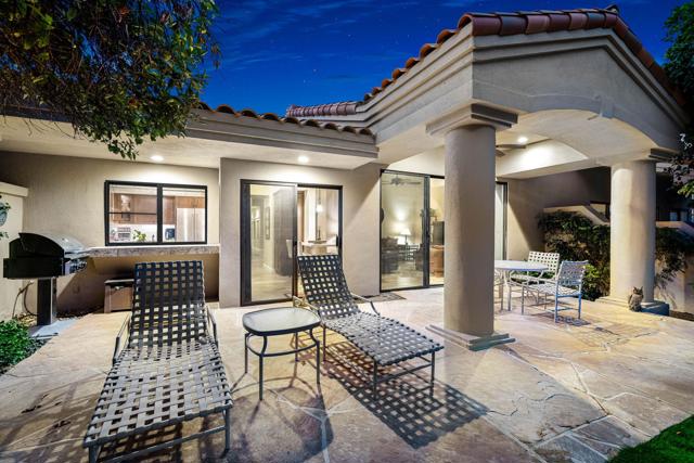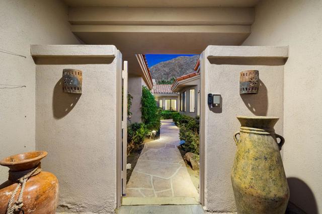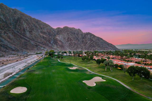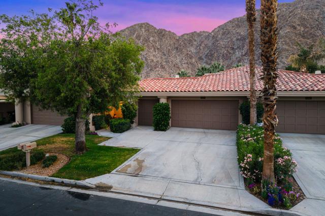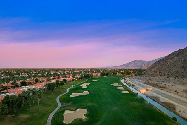 LOCATION, LOCATION, LOCATION! Western panoramic views of PGA West Palmer Private Golf Course #14 with no houses between you and night-lit Santa Rosa Mountains. Enter through the private courtyard gate and enjoy the lush landscaping and the flagstone walkway to this popular Legend 10 floor plan that features 2272 sq. ft of living space with three en-suite bedrooms, two with dual vanities, a powder room for your guests, an open living area with a Bar and stacked stone fireplace for those cool mornings/evenings. The remodeled kitchen features newer cabinetry, granite slab countertops, an island, stainless appliances, and a five-burner gas cooktop. The wall between the kitchen and living area has been moved back for an open feeling, and a breakfast bar has been installed. This condo needs no updating with the recently installed wood-looking tile flooring throughout and granite/tile in all four baths. The rear patio features spectacular views during those peaceful mornings and evenings, plenty of seating on the flagstone surface, and a gas-built-in BBQ. The spacious 2-car plus golf cart garage features cabinetry allowing plenty of storage. Offered furnished per the written inventory. PGA West features 3 Private and 3 Public courses, tennis, pickleball, three clubhouses, restaurants, and more. HOAs include building maintenance, complete landscaping, irrigation water/equipment, exterior paint, roof, cable, internet, trash, and 24-hour guarded gated security