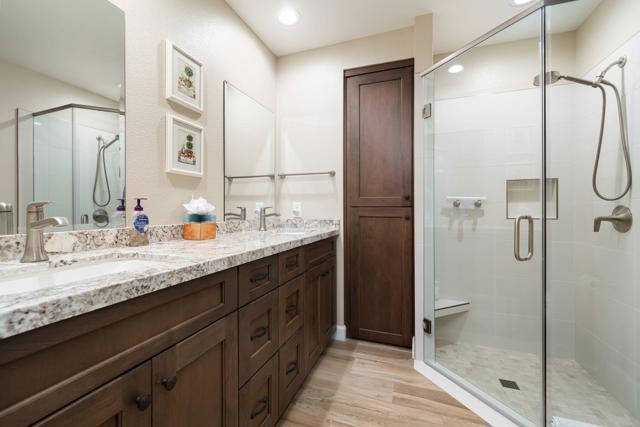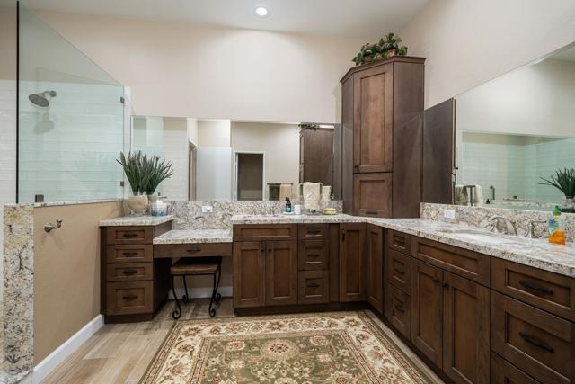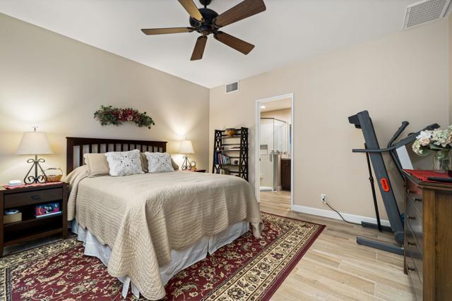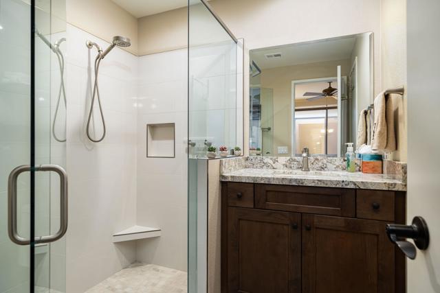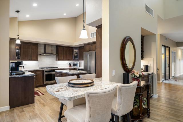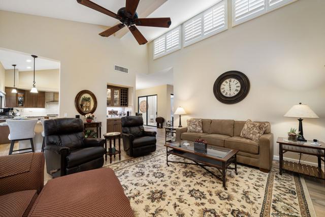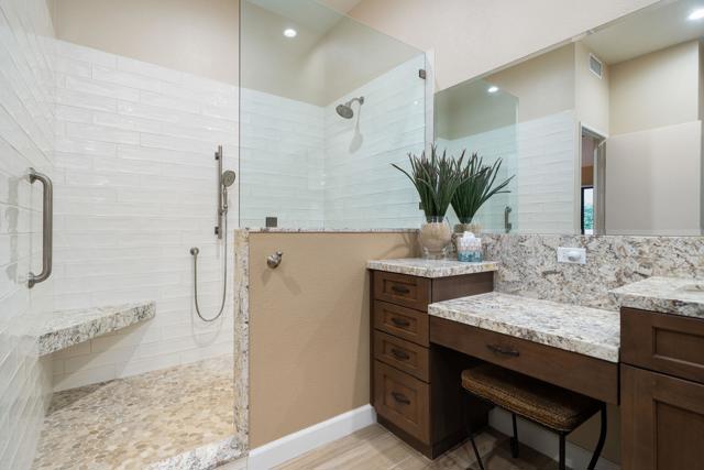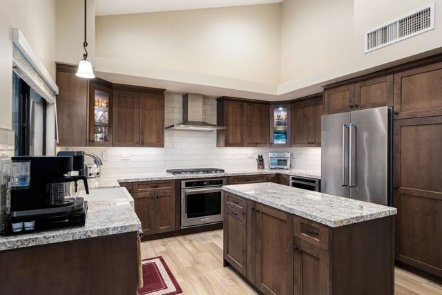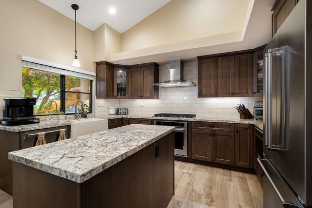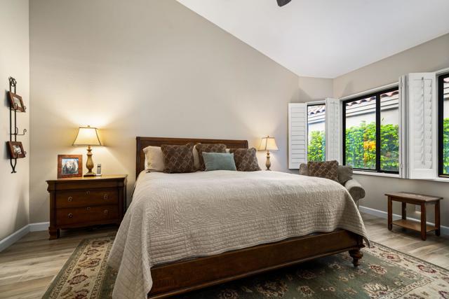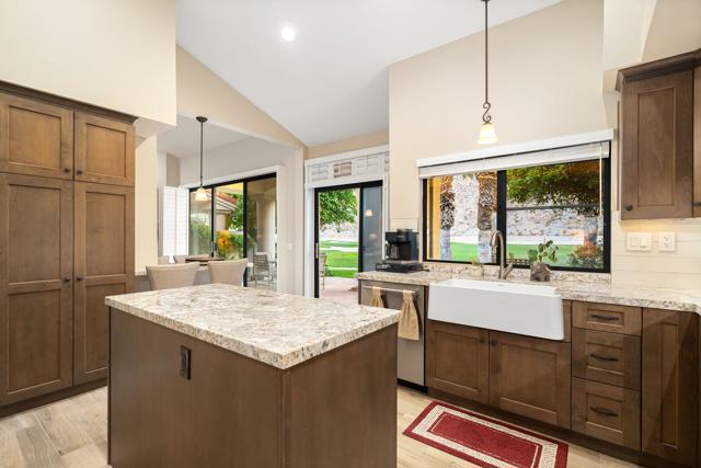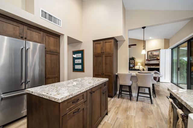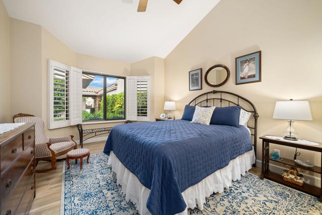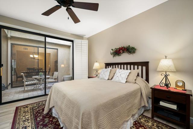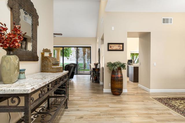 LOCATION, LOCATION, LOCATION! Western panoramic views of PGA West Palmer Private Golf Course #14 with no houses between you and night-lit Santa Rosa Mountains. Enter through the private courtyard gate and enjoy the lush landscaping and the flagstone walkway to this popular Legend 10 floor plan that features 2272 sq. ft of living space with three en-suite bedrooms, two with dual vanities, a powder room for your guests, an open living area with a Bar and stacked stone fireplace for those cool mornings/evenings. The remodeled kitchen features newer cabinetry, granite slab countertops, an island, stainless appliances, and a five-burner gas cooktop. The wall between the kitchen and living area has been moved back for an open feeling, and a breakfast bar has been installed. This condo needs no updating with the recently installed wood-looking tile flooring throughout and granite/tile in all four baths. The rear patio features spectacular views during those peaceful mornings and evenings, plenty of seating on the flagstone surface, and a gas-built-in BBQ. The spacious 2-car plus golf cart garage features cabinetry allowing plenty of storage. Offered furnished per the written inventory. PGA West features 3 Private and 3 Public courses, tennis, pickleball, three clubhouses, restaurants, and more. HOAs include building maintenance, complete landscaping, irrigation water/equipment, exterior paint, roof, cable, internet, trash, and 24-hour guarded gated security