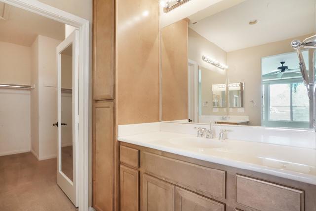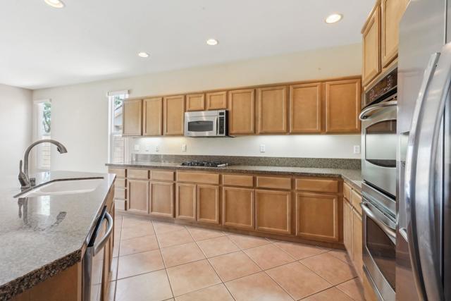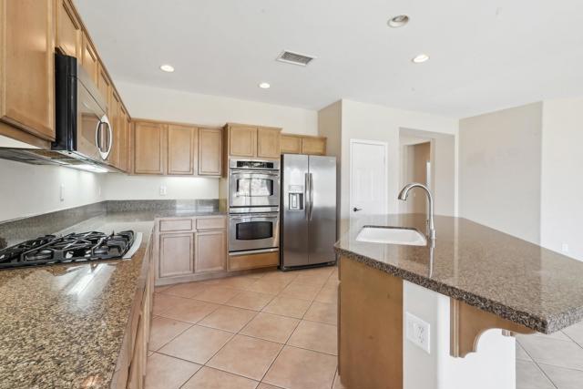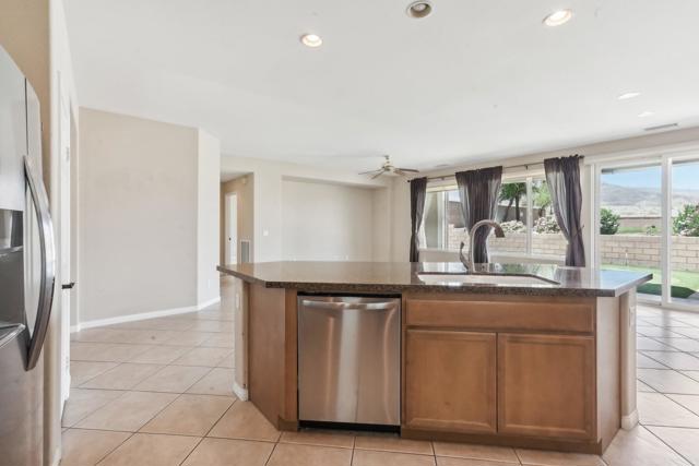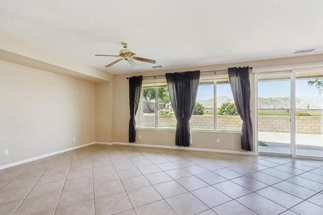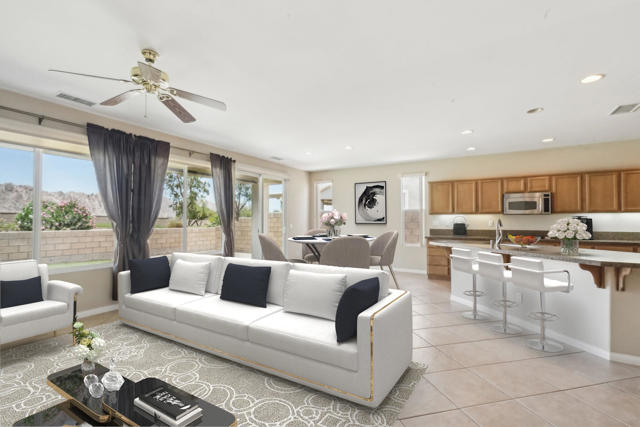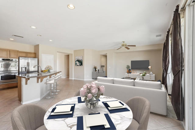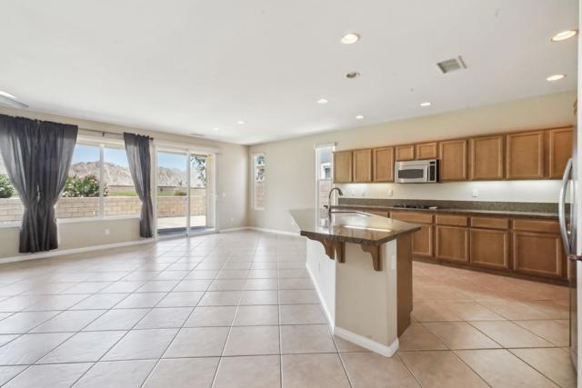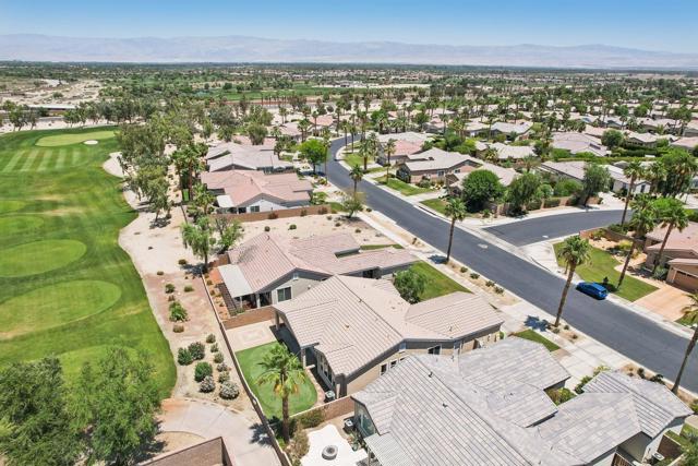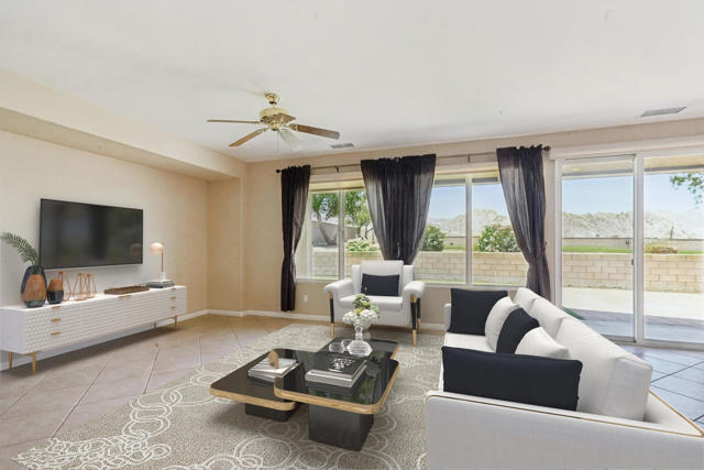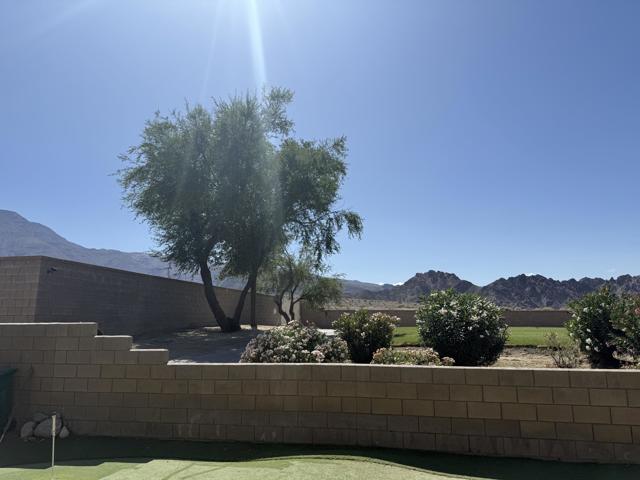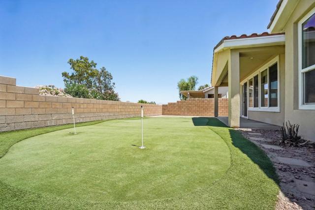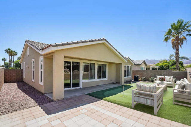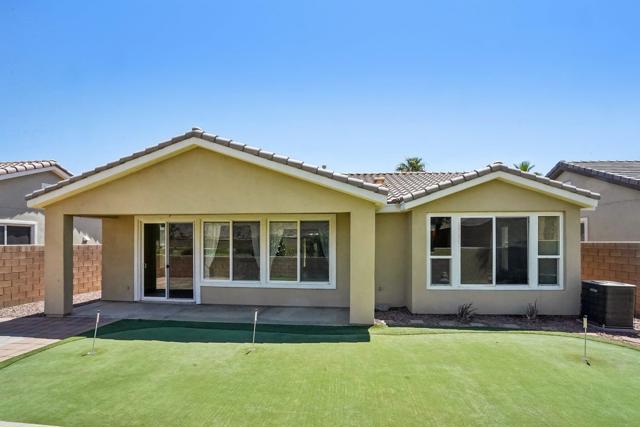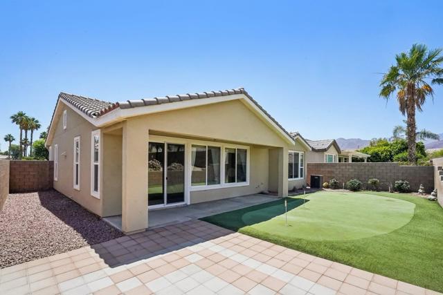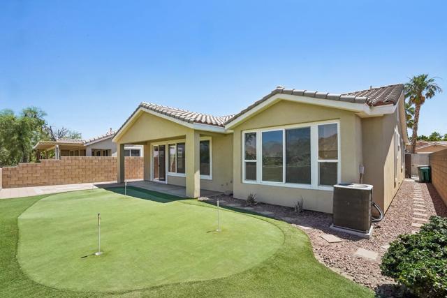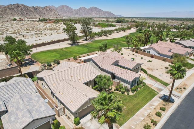 On the Golf Course with Mountain Views!!!! Presenting the highly sought-after Monterey floor plan, this beautifully appointed single-family residence is ideally situated adjacent to the 8th tee box of The Golf Club at La Quinta. Offering 1,693 square feet of refined living space, the home features 2 bedrooms, 2 bathrooms, and a versatile den/office that can serve as a third bedroom. The open-concept great room is enhanced by tile flooring, recessed lighting, a media niche, custom window treatments, and an abundance of natural light. The chef's kitchen is equipped with stainless steel appliances, built-in double ovens, a gas cooktop, microwave, dishwasher, newer refrigerator, pantry, and a prep island with bar seating. The spacious primary suite includes a bay window, en suite bath with dual vanities, large shower enclosure, and a generous walk-in closet. The guest bedroom offers privacy and access to a nearby full bath. Additional highlights include an interior laundry room with newer washer/dryer included, extensive cabinetry and utility sink, a covered patio with awning, and a backyard putting green perfect for entertaining or practicing your short game--all set against the vibrant backdrop of a scenic No. 8, par-3 hole.