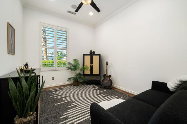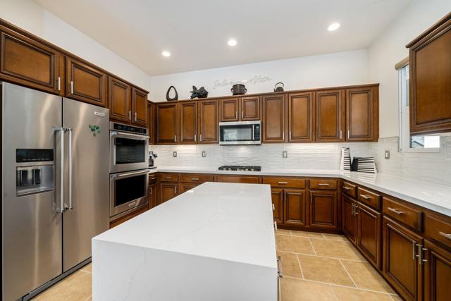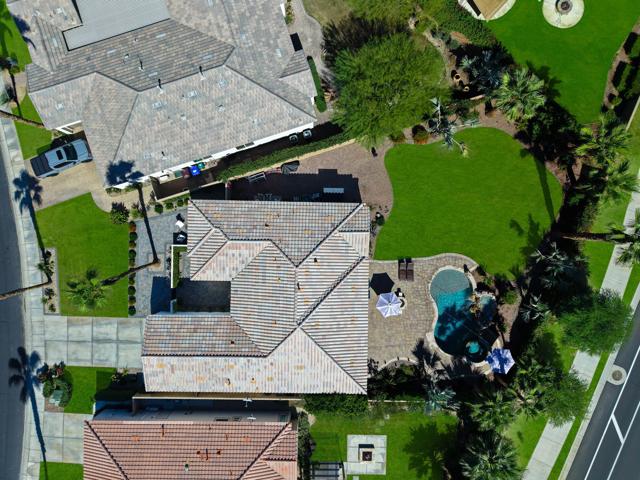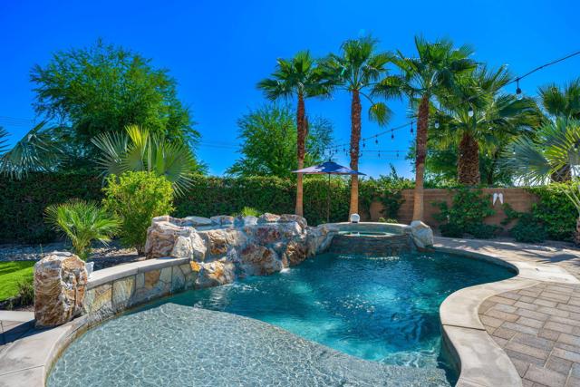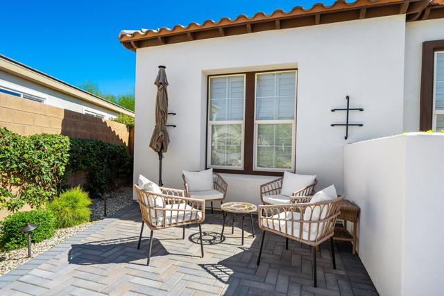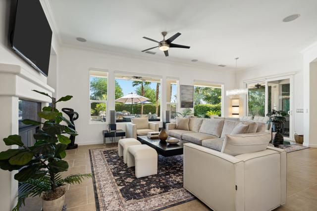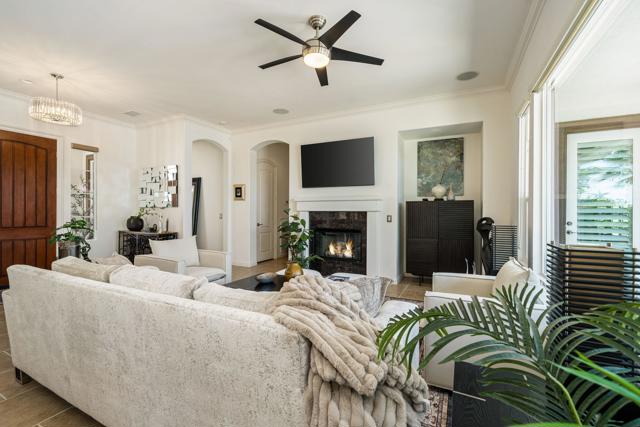 Exquisitely furnished Monarch plan with 10' ceilings situated on a spacious 12,623 sq. ft. lot within the resort-style 55+ community of Trilogy La Quinta. This single-level residence offers ample square footage of refined interior living space, featuring 3 bedrooms and 2 bathrooms. The home welcomes guests with an extended driveway, wrought-iron entry gate, and an elegant front courtyard enhanced with pavers to enjoy the 180-degree mountain sunset views, an expanded entry area, and ambient landscape lighting. The great room impresses with a granite-encased fireplace, designer chandeliers in the entry and dining areas, an entertainment niche, surround sound, crown molding, arched doorways, and custom window coverings. Additional upgrades include LED recessed lighting throughout and upgraded ceiling fans and light fixtures. The dining area flows seamlessly into the chef's kitchen, beautifully appointed with quartz countertops, a glass tile backsplash, breakfast bar, reverse osmosis drinking water system, upgraded KitchenAid stainless steel appliances, built-in double ovens, microwave, refrigerator, waterfall-edge prep island, 5-burner gas cooktop, pantry, and abundant cabinetry with brushed nickel hardware. The generous primary suite offers a bay window with plantation shutters, high-grade tile flooring, French door access to the backyard, newer countertops, sinks, faucets, and valves, dual vanities, a walk-in closet, and a large floor-to-ceiling tiled shower with glass enclosure. Guest accommodations are conveniently located near a full bath featuring quartz counters and a tile-enclosed tub/shower combination. The resort-style backyard is an entertainer's dream, showcasing a free-form Pebble-Tec pool, cascading spa, dramatic rock waterfall, paver decking, misting system, covered patio, fire pit, backyard up-lighting, and lush professional landscaping--all enhanced by a Pentair pool control system with Wi-Fi capability. Additional highlights include fresh interior and exterior paint, and a finished two-car garage featuring a 25,000 BTU mini-split A/C unit, insulated Wi-Fi-enabled garage door, upgraded motor and track system, premium roof-mounted storage, and an extended four-foot bay. This stunning property offers the epitome of luxury desert resort living--schedule your private showing today.