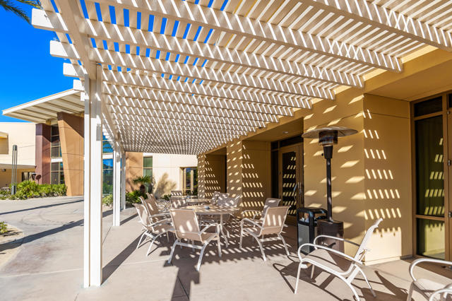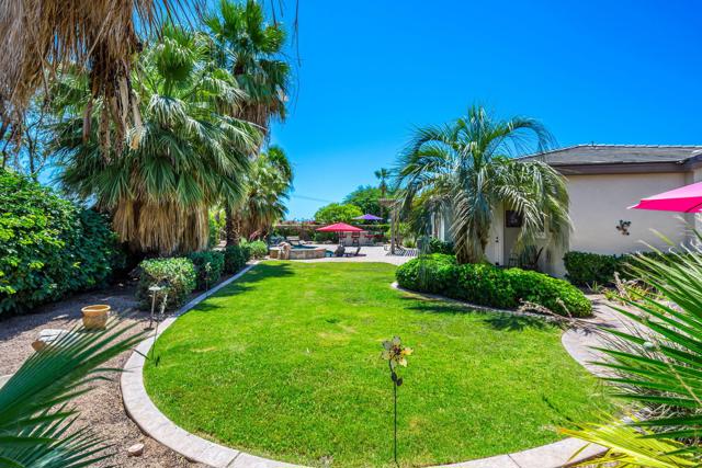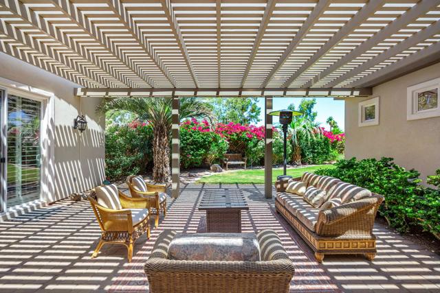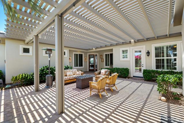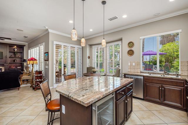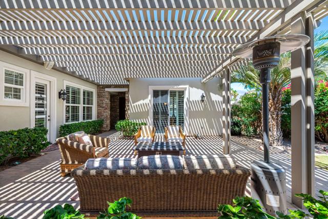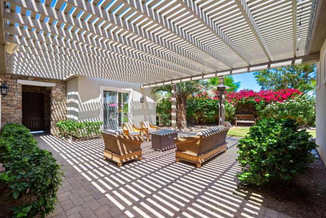 A rare and exceptional Trilogy at La Quinta Mesquite Model Pool and Spa Retreat. At 2,784 SQ FT the property boasts two Casitas on a beautifully landscaped 16,553 SQ FT estate-sized lot, just across from the Trilogy Golf Course. A hidden gem, the park-like sanctuary features lawns and pathways that wind around the home offering a variety of covered and open areas from which to play, relax and entertain. With 4-bedrooms, 4- baths, a great room, formal dining room, large office, gourmet kitchen, multiple covered patios, a two-car plus additional single-vehicle garage, the home offers plenty of room for all your most desired lifestyle needs. Guest will love the privacy of the detached Casita with full bath and kitchenette with mini-frig, sink and upper and lower cabinets with a microwave. The additional attached Casita also has a privacy entry off the courtyard, but is an extension of the main home. The property features an extraordinary backyard retreat, with mature palms, custom pavers, an oasis styled salt water pool and spa with rock waterfalls, a professional BBQ station with a bar and seating area for dining and entertaining, all wrapped into a park-like setting of brightly colored and textured desert flowers and trees. Behind the tall solid-wood front entry door, is a stone and stucco foyer that leads you to a private expansive open-air courtyard with a Pergola cover that extends between the detached Casita and main home for comfy year-round outdoor living. The main home foyer opens to a spacious great room with lofty 10-foot ceilings, arched doorways, tile on-point, crown molding, and picture windows with plantation shutters open to the backyard's park-like views. The elegant great room features handsome wood-crafted built-ins with a gas-log fireplace and surround sound for a movie theater experience. A spacious gourmet kitchen showcases quality stainless appliances, including a double-oven, an abundance of cabinet and countertop space topped with slab granite and a custom tile backsplash, a center-island with seating and pendant lighting, and a bright breakfast area. The formal dining room features a built-in breakfront with lots of storage, and is the perfect place for making new memories. A separate office off the great room is perfect for telecommuting or as a library or study. The guest bedrooms and baths are located in a separate wing from the primary bedroom.