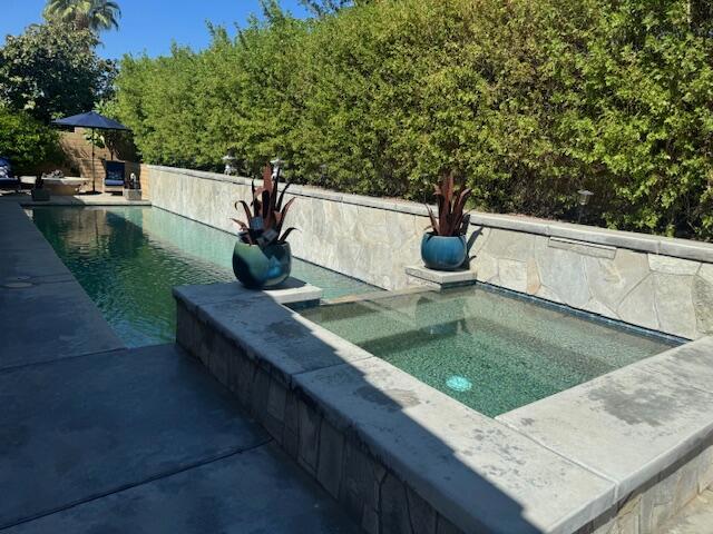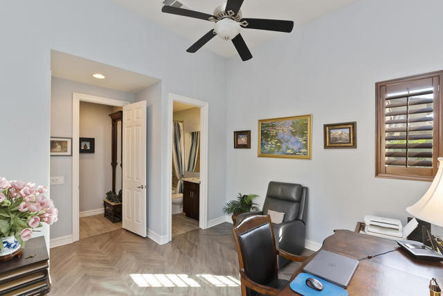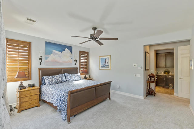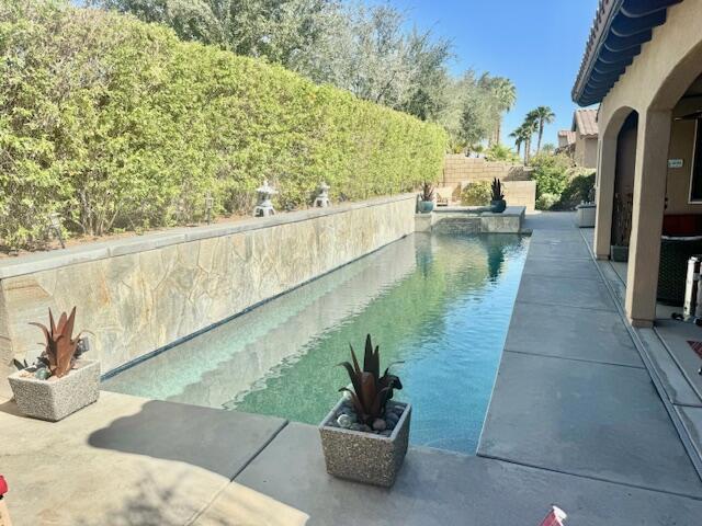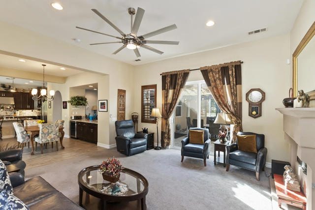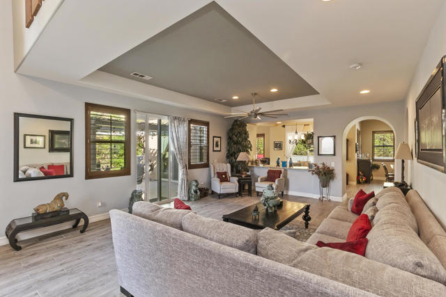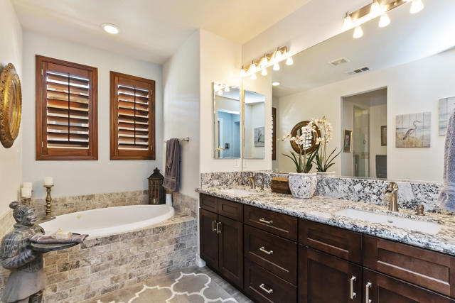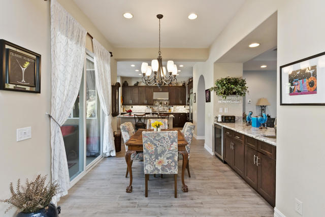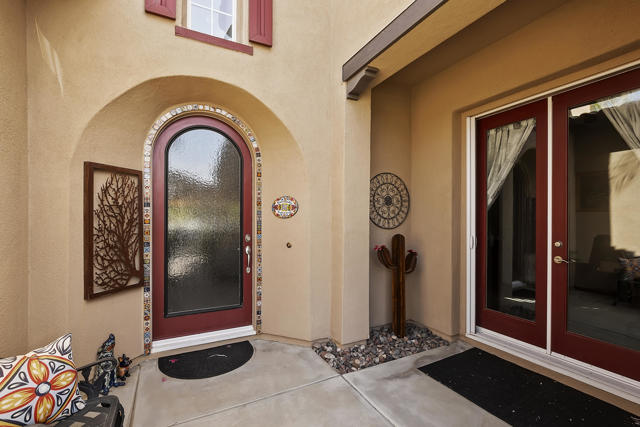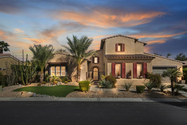 This gorgeous upgraded and updated home is hitting the market again with a much more attractive price. Same charm, same beauty, just a better deal.! If you are looking for perfection, this beautiful 3/3, just under 2800 square foot home in the gated Rancho Santana community ,is located minutes away from the Indio Polo Grounds, Old Town La Quinta, Shopping and Dining. The open floor plan home features wood like ceramic tile floors, custom window treatments, gorgeous granite counters through the house, and upgraded appliances. The low maintenance front and very private rear yard offers a large salt water, pebble-tec lap pool and spa and fountain. The private side yard patio has a patio cover that is host to seasonal table grape vines growing over it. A beautiful patio fountain provides the ambiance to enjoy morning coffee or evening cocktails under the vines! Other upgrades and amenities include, but are not limited to gourmet kitchen with upgraded granite counters, walk in pantry, a skylight in the laundry room, wet bar and wine fridge in the dining area, and canned lighting throughout the house. All ensuite bedrooms are separate from each other which affords the utmost in Privacy, The garage is a full 3- car garage!The washer and dryer, and TV console in family room, remain with the house. Low HOA fees!!