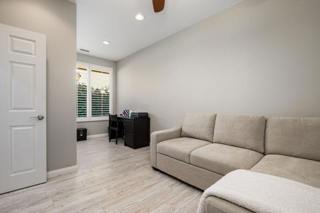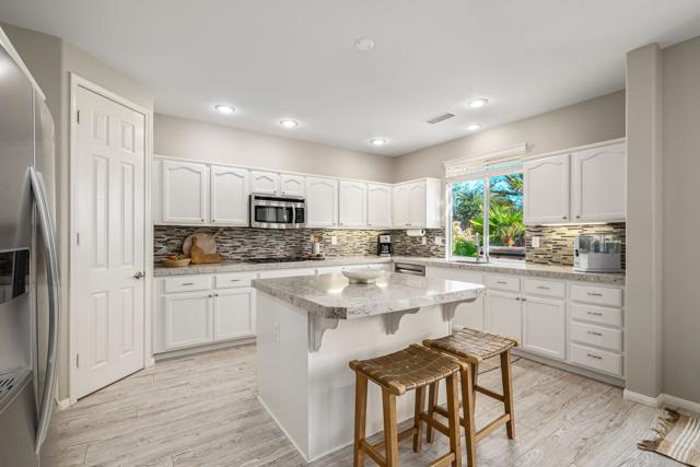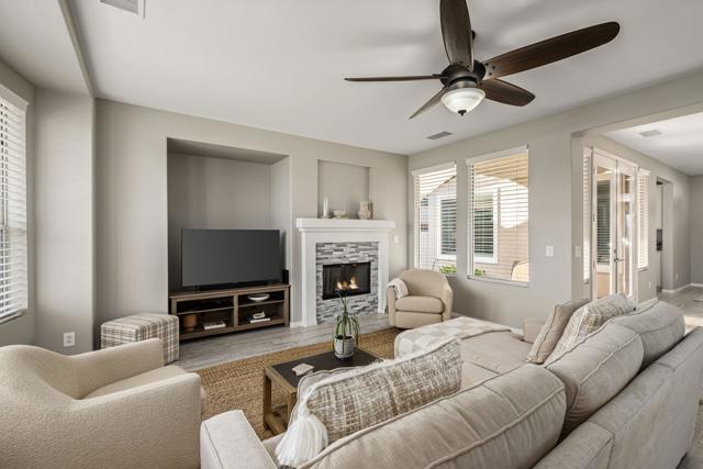 Exquisitely upgraded Maree plan located behind the private gates of the prestigious Trilogy La Quinta, a premier 55+ resort-style community. Perfectly situated on the 12th fairway of The Golf Club at La Quinta, this stunning residence showcases spectacular southern mountain, golf course, and spa views. Offering 1,771 sq. ft. of beautifully designed open-concept living space, the home features 3 bedrooms, 2 bathrooms, dual patios, and an abundance of natural light throughout. The charming Tuscan facade and custom glass-etched entry door set the tone for the refined interiors, where plank flooring flows seamlessly through the great room highlighted by a sleek tile-encased gas fireplace with mantel and media niche. The adjacent dining area opens to a chef's kitchen appointed with stainless steel appliances, built-in double ovens, microwave, prep island with bar seating, dazzling quartz countertops, custom tile backsplash, crisp white cabinetry, and a convenient pantry. The spacious primary suite is a private retreat with plantation shutters, a generous walk-in closet, and a spa-inspired en suite bath featuring dual vanities, quartz counters, and a stunning floor-to-ceiling tiled shower with frameless glass enclosure. Perfect for hosting guests, the additional bedrooms offer comfort and flexibility, complemented by a separate laundry room for convenience. The entertainer's backyard is an absolute showpiece, boasting a pergola-covered patio, a luxurious in-ground Pebble Tec spa with Tuscan stone surround and dual water descents--all framing the breathtaking panoramic golf and mountain views that define desert resort living at its finest.