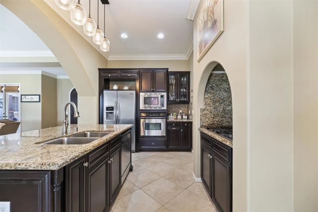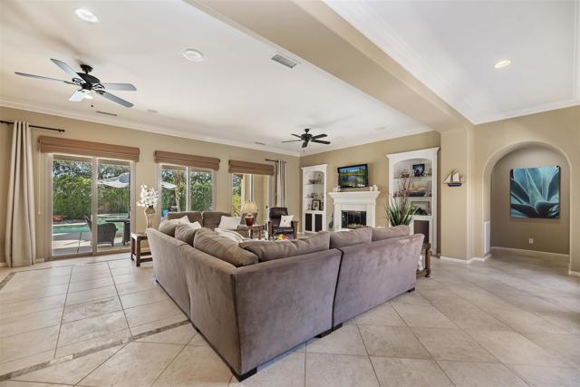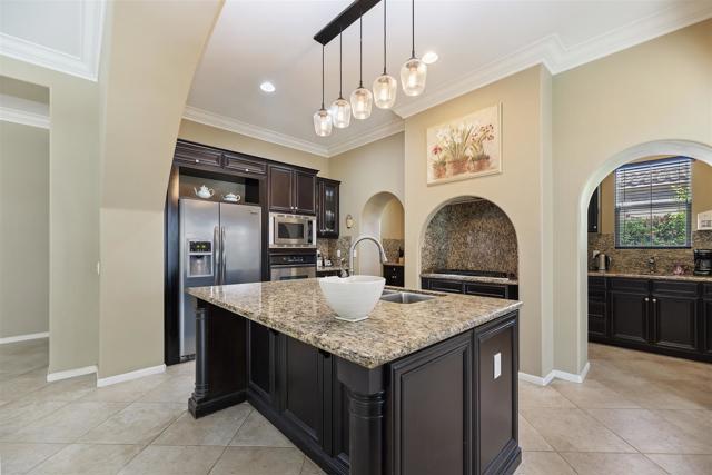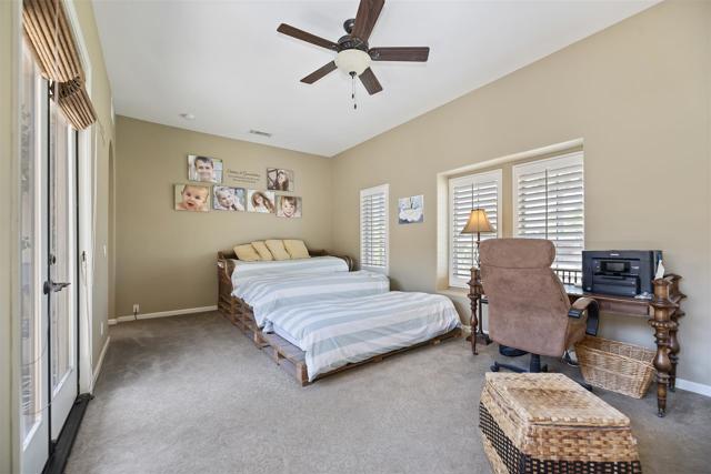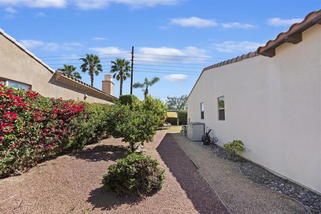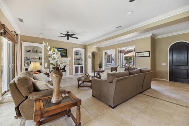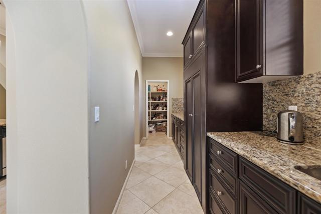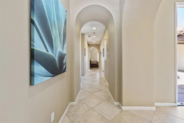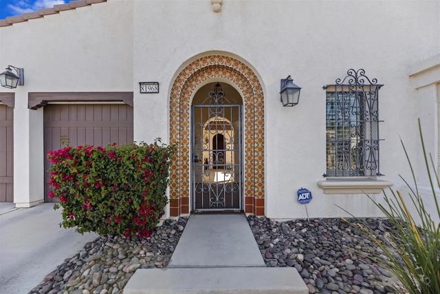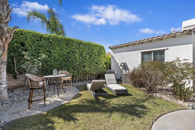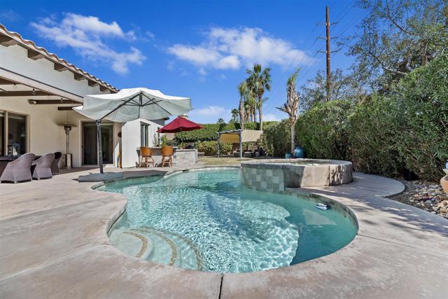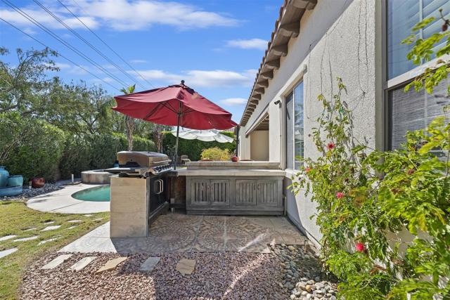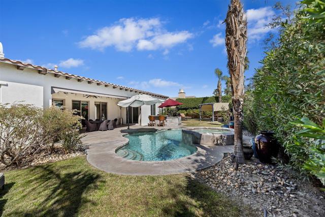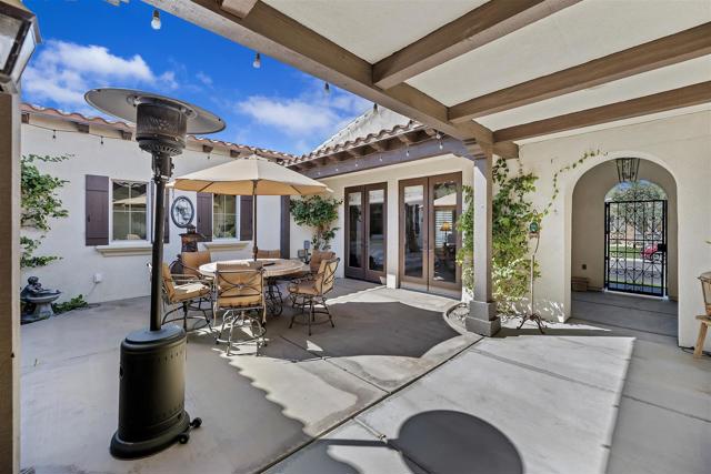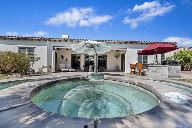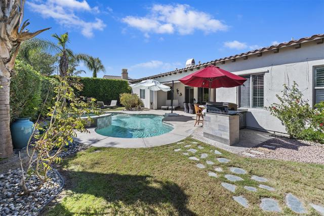 As you walk through the secure locked gate of this Santa Barbara style home you'll enter a spacious courtyard with a beautiful table that sits 6. You will see that the home is an open floor plan. You then walk through the front door into the great room with sliding glass and French doors and see the pool. The private backyard with it's pool/spa, pergola, built-in BBQ, covered porch all on a large lot with fruit trees and lawns for relaxation in both sun and shade. This is what desert living is all about 365 days a year. The chef will enjoy preparing meals in the gourmet kitchen with a center island breakfast bar, plus a huge butler's pantry with many additional cabinets, counter space, wet bar and even a walk-in pantry. This is all part of the great room facing a fireplace with built-in cabinets on both sides. The luxurious master suite features dual vanities, a soaking tub plus a separate shower and large walk-in closet. The huge bonus room is plenty big for multiple beds, an office area and even an additional sofa all exiting out to the locked gated courtyard. We hope you come see this special place in The Estates of Carmela. OH! And don't miss stopping by the community park with its playground and possibly run into a neighbor for a friendly chat.