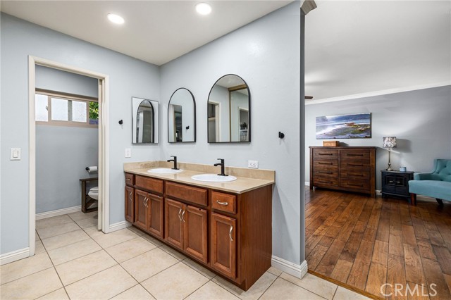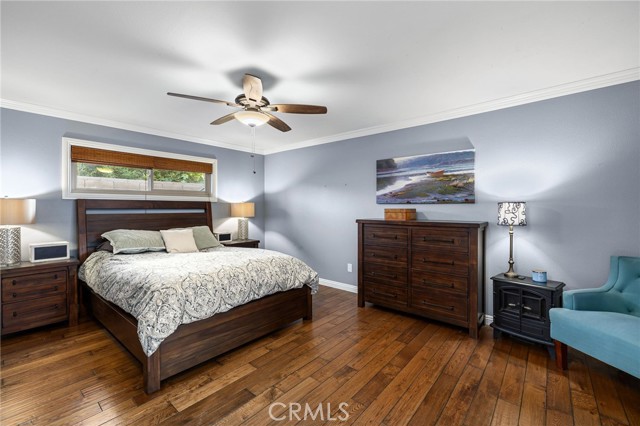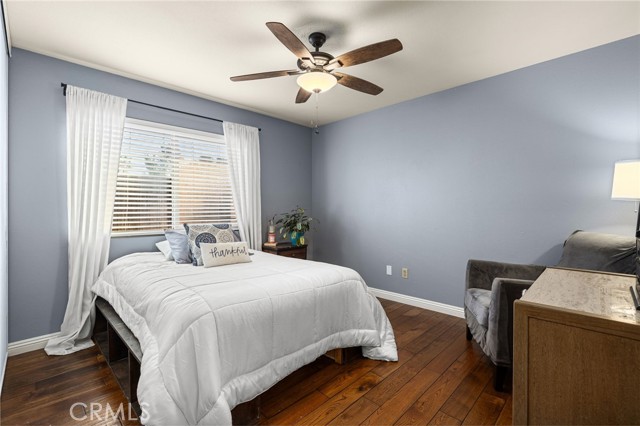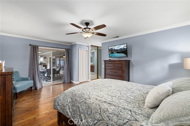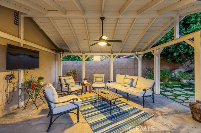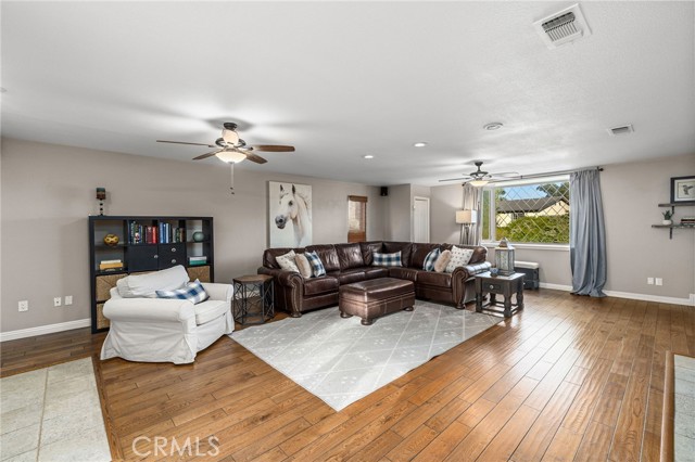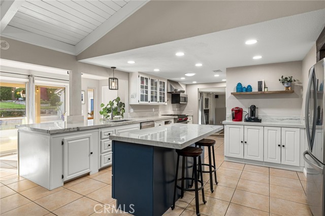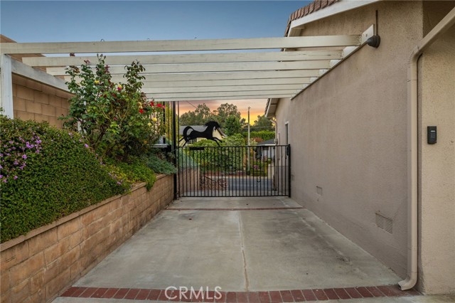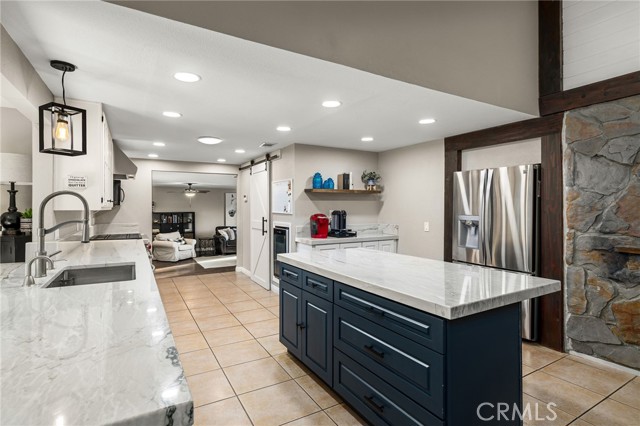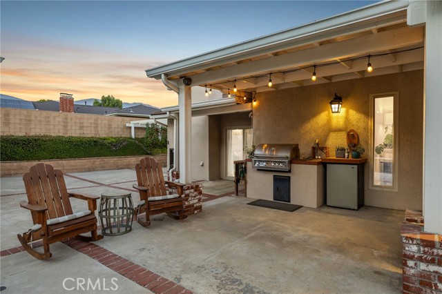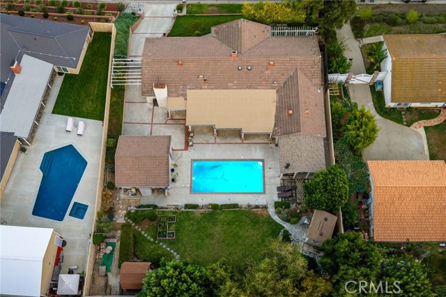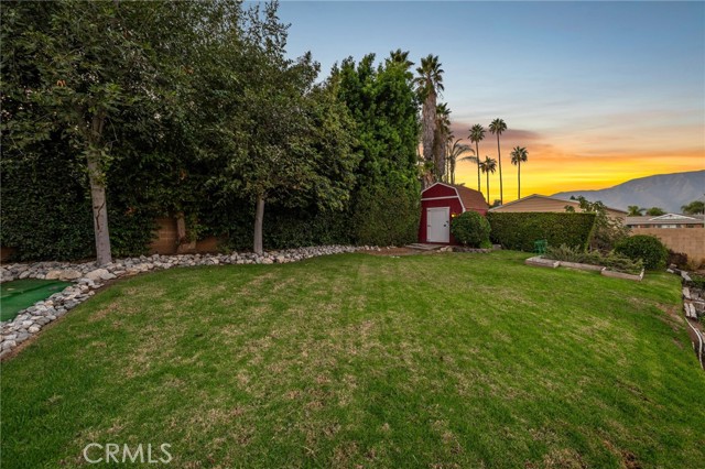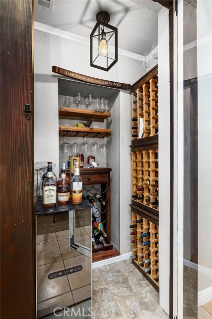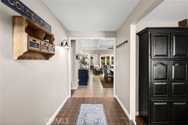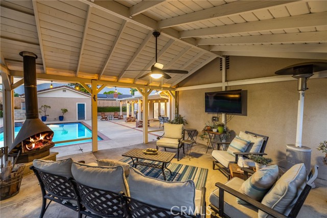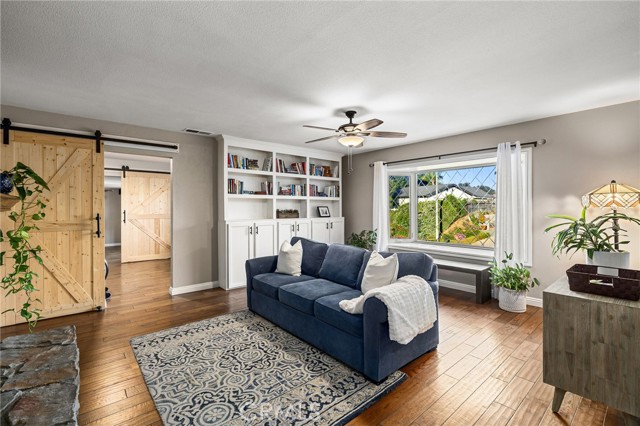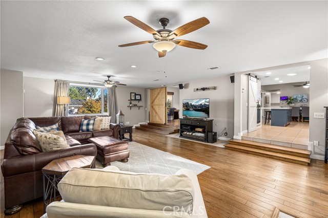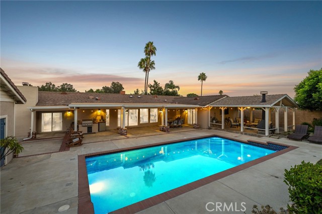 Sprawling Single-Story Pool Home in the Private Live Oak Neighborhood of La Verne. Set on an elevated lot in the highly desirable Live Oak enclave, this meticulously maintained single-story pool home offers exceptional privacy and expansive indoor-outdoor living. The manicured front yard features lush ground cover, mature privacy hedges, and trees, all surrounding a spanning front porch that welcomes you inside. Step into a bright living room with hardwood flooring, a dramatic floor-to-ceiling stone fireplace, a large bay window, and a sliding barn door that opens to a versatile gym or home office. The spacious kitchen and dining area showcases a vaulted open-beam ceiling with tongue-and-groove detail, a second stone fireplace, and a custom built-in wine cabinet. The remodeled kitchen includes classic white cabinetry, quartzite countertops, stainless steel appliances including a Wolf range with pot filler, a center island with bar seating, and a barn door that opens to a walk-in pantry. The oversized family room, open to the kitchen, features hardwood flooring, recessed lighting, a large picture window, sliding glass doors to the backyard, and a second barn door connecting to the gym/office. The bedroom wing includes a primary suite with hardwood floors, crown molding, a ceiling fan, a private slider to the backyard, and an primary bathroom with tiled floors, dual sinks, two closets, and a walk-in shower. Three additional bedrooms share an updated hallway bathroom with dual sinks, a walk-in shower, and a separate soaking tub. A dedicated laundry room offers a sink and storage cabinetry. The private backyard is an entertainer’s dream, featuring a sparkling pool with brick coping, multiple covered patios including one with a built-in barbecue and another with a pitched roof, a large grassy area with gardens, storage sheds, a gated driveway leading to a detached two-car garage.
