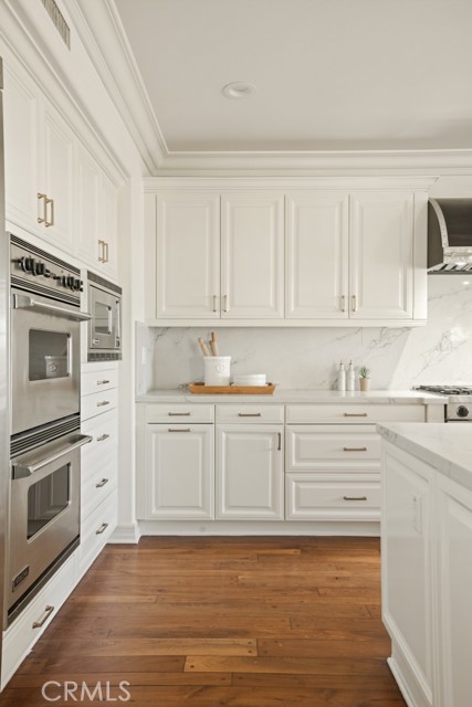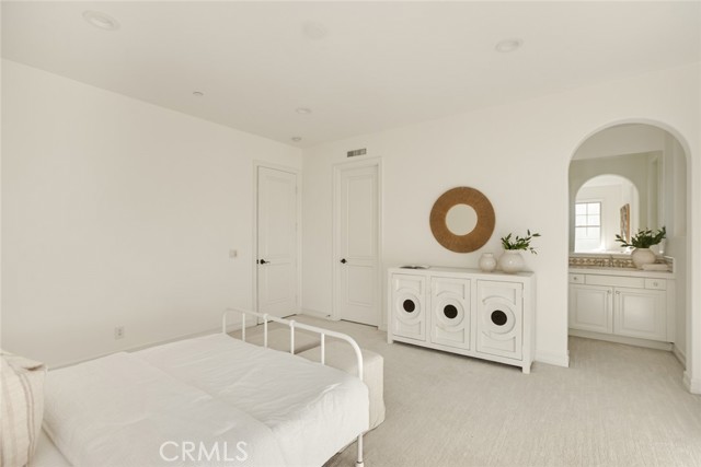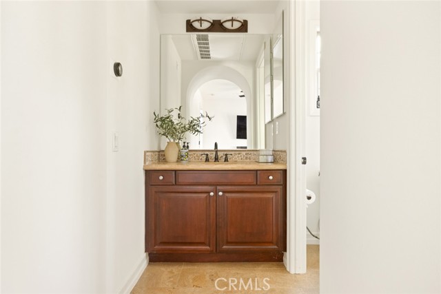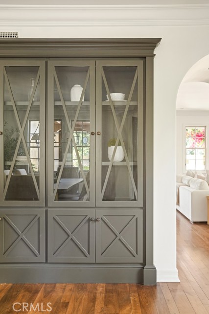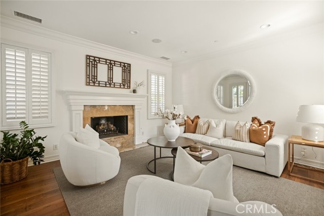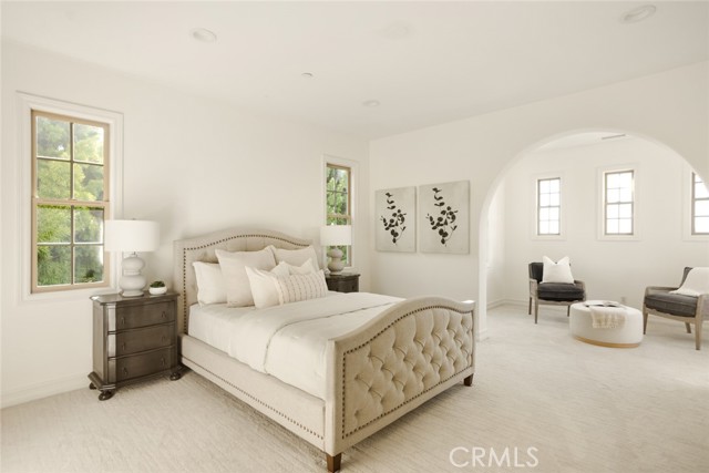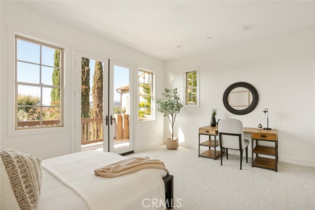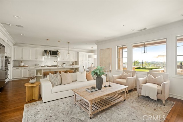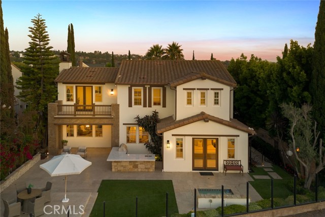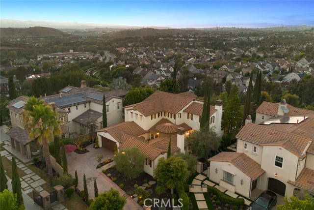 Panoramic evening light, sunset and valley views provide an ever-changing backdrop for exquisite luxury living at this magnificently upgraded Ladera Ranch estate. Located in Alisal at the end of a tree-lined cul-de-sac street behind the guard-gated entry of Covenant Hills, the home reveals its outstanding interaction with outdoor living spaces. Guests are welcomed beyond a custom arched trellis, down a long custom-finished driveway, and through a gated entry courtyard with enchanting tile wall feature. Indoors, a quest for ageless design that transcends trends and grows richer over time is immediately apparent. A rotunda foyer with inlaid tile medallion flows effortlessly to a formal living room with stone fireplace, and a formal dining room with built-in cabinetry and French doors leading to a private fireplace-warmed courtyard. Approximately 4,442 square feet, the impressively sized residence showcases a family room with fireplace, courtyard access and a seamless transition to the professionally upgraded kitchen, where new heights of culinary perfection are easily reached. Enjoy a generous island with seating, extensive white cabinetry including a built-in pantry in the breakfast nook, quartz countertops with full backsplash, a French door to the backyard, and a full suite of stainless-steel Viking appliances, including a double oven, built-in refrigerator and a six-burner cooktop with grill and matching hood. Five ensuite bedrooms and five- and one-half baths include a casita with separate entrance. The main-floor primary suite presents panoramic views, French doors opening to the backyard, and a large walk-in closet. Rivaling premium hotels, the primary bath hosts a jetted tub, separate shower, individual vanities & picture-frame mirrors. A secondary ensuite bedroom w/ view balcony awaits upstairs, where an oversized bonus room features a built-in media center and a walk-in kitchen with wet bar, granite countertops and Viking appliances. Hardwood flooring, luxurious high-end carpet in select living areas, dramatic archways, plantation shutters, upgraded lighting fixtures, and custom crown molding lend an air of sophistication throughout the residence, which also features an attached three-car garage. Gorgeous views complement a reimagined backyard, where a spa, custom walk-in BBQ bar, water-saving turf & tiled patios enhance outdoor entertaining. Covenant Hills’ private clubhouse, miles of scenic trails, & top-rated schools are just moments from home.