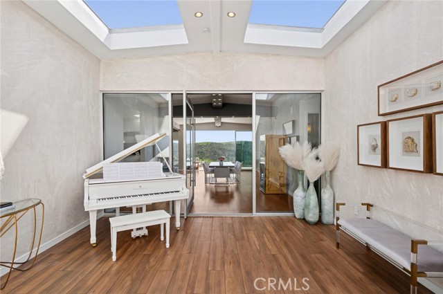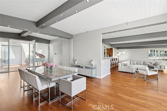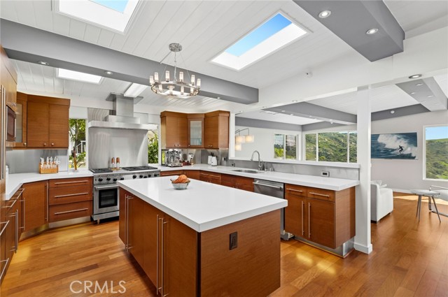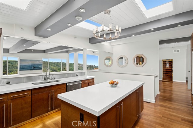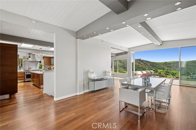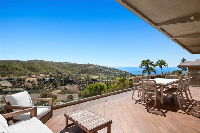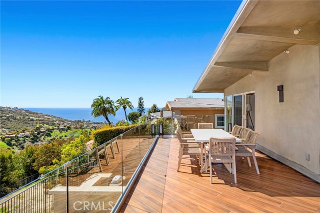 Discover coastal luxury at its finest with this stunning 5 bedroom, 4.5 bathroom contemporary residence in Laguna Beach. This breathtaking home seamlessly combines luxury with modern design, offering sweeping canyon and ocean views. Spanning 3,809 square feet, this architectural masterpiece blends indoor-outdoor living with elegance. Step through the grand foyer, illuminated by natural light, into an open-concept main level. Upon entry, you’re greeted by stunning Brazilian Walnut hardwood floors and high beamed ceilings creating an inviting ambiance. The gourmet kitchen is a chef’s dream featuring Caesarstone Quartz countertops, a commercial-grade gas stove and a Viking refrigerator. The main floor is home to the luxurious primary suite with its own private balcony, oversized walk-in closet, and a spa-like 5-piece ensuite bathroom. Two additional guest bedrooms and a full bath complete the main level, while the open living and dining areas are perfect for entertaining. Expansive glass sliders frame breathtaking vistas and ocean breezes into the main level. Downstairs, you’ll find two bedrooms complete with ensuite bathrooms and walk-in closets. Additionally, there is a versatile space that could serve as an office, gym, or additional living room. This level leads to a flat backyard designed for outdoor entertaining. The property also features a multi-car circular driveway with space for 5 additional cars and a two-car garage with direct access for added convenience. With its unmatched style, stunning views, and ideal location, this Laguna Beach gem offers the ultimate coastal lifestyle. Located just minutes from Laguna Beach’s pristine coastline, world-class dining, shopping, and entertainment, this home offers the perfect blend of tranquility and accessibility.