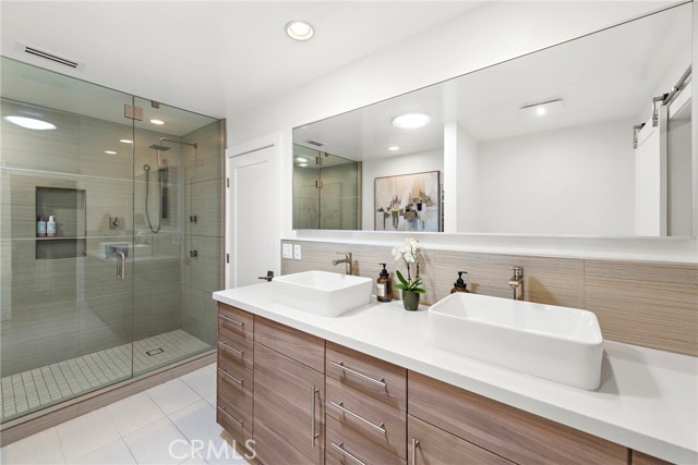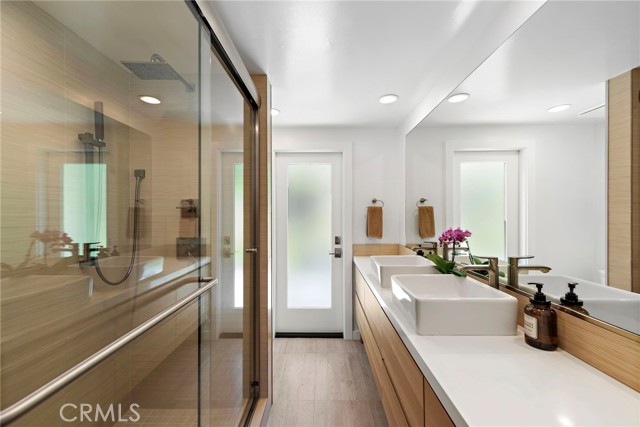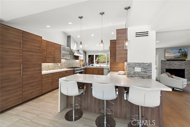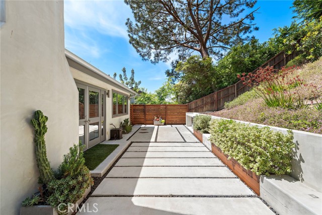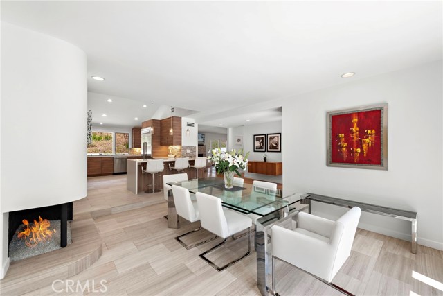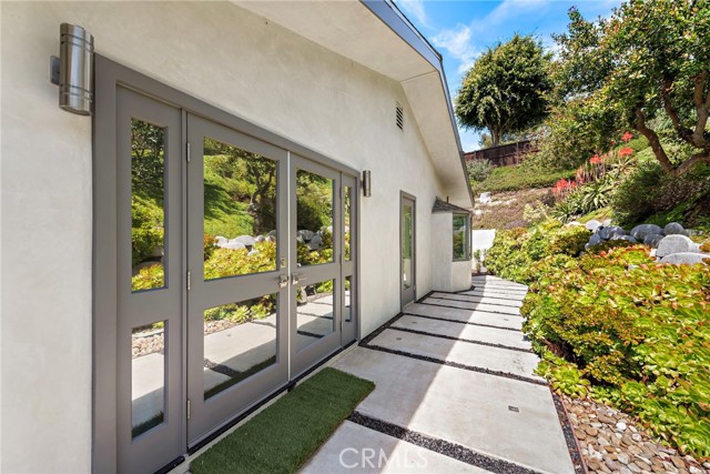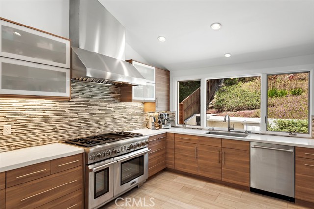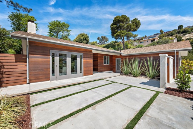 Incredible opportunity for a Single Level home in Laguna Beach that is completely remodeled with sophisticated modern amenities and impeccable upkeep. Situated on a private lot of approximately over 9,300sf with wonderful indoor, outdoor access and landscape views through all rooms of the home. A fusion of quality sourced materials were utilized throughout. Starting with the solid Redwood outdoor privacy entry gate, which leads to a large front flat patio and custom front door. The open living, dining and kitchen spaces flow seamlessly for entertaining and every day living. Crystal gas burning fireplaces and oversized glass paned French doors adorn the living and formal dining spaces. The Chef’s kitchen comes complete with Thermador Professional six burner range, double oven and built-in refrigerator/freezer. Quartz countertops and bar seating with modern glass pendant bar lighting. Oversized stainless steel sink and fixtures, Porcelain linear tiled backsplash. Custom kitchen cabinetry with soft close drawers, doors and pantry pull outs. The separate bedroom wing consists of a primary suite and two additional bedrooms with bath. The primary bedroom features a high ceiling with skylight, reclaimed wood accent wall and French doors that look out to a lush side garden. The primary en suite bathroom has oversized shower, separate tub and walk-in closet. Both bathrooms have dual Kraus vanities, Porcelain tiled showers and flooring. The home also has French Oak engineered hardwood flooring and Limestone tiling throughout the main rooms. Plentiful natural light is enjoyed throughout this floor plan, enhanced by dual paned windows, French doors and skylight tubes. Systems of central heat, air, ducting, tankless water heater, water softener have been updated. The attached two car garage allows easy access from parking to home interior with minimal entrance steps. The added convenience of an office nook creates a getaway home work space. Exterior enhancements include stucco and Redwood sided building exterior. Spacious front, side and rear patio areas. Redwood decking, crystal gas firepit and gas plumbed for barbecue connectivity. The private back slope and front planters have been updated with native, colorful plantings and landscape lighting. Conveniently located on the loop that is Bern Drive in lower Top of the World. Close to award winning LBUSD schools, Alta Laguna Park and just minutes down Park Avenue the heart of downtown.