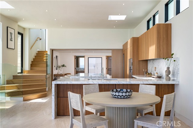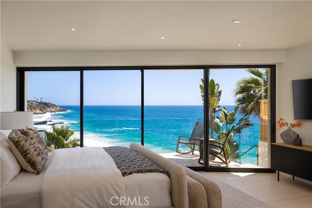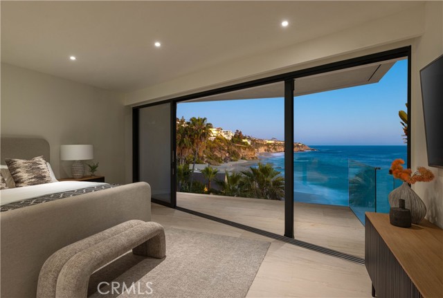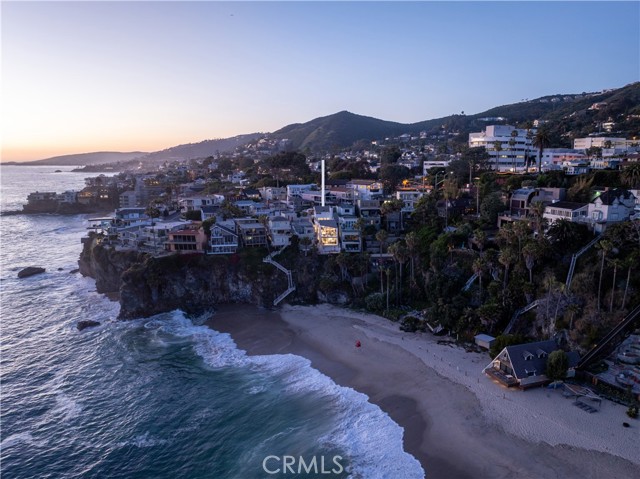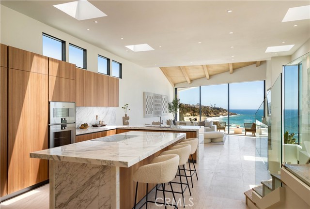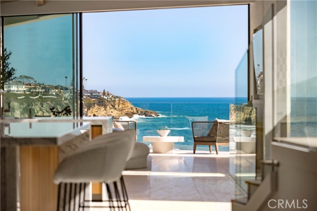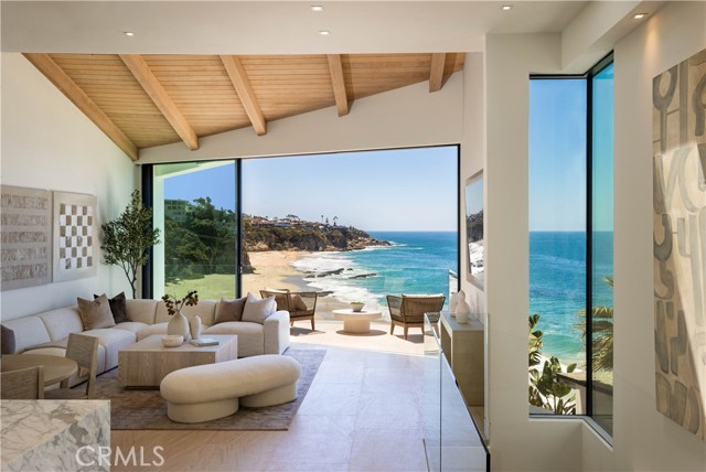 Set on an oceanfront bluff overlooking one of Laguna Beach's most scenic coves, this beautiful contemporary home has just undergone a spectacular two-year remodel. Limestone floors and neutral woods anchor the design of the light and open plan. High volume ceilings and floor-to-ceiling glass flood the home with light and ocean vistas. The open-concept main level includes the kitchen, dining, and living areas - which are ideal for entertaining. The living room opens to its own private terrace overlooking the beach. It has a unique view orientation that enjoys looking almost straight down the shore. There is a third bedroom suite on this level as well. This suite enjoys a private location, but can also easily be opened to the main living area to be used as a den, office, or other personal use space. The private and spacious master suite occupies an entire floor to itself and opens to its own private oceanfront terrace. The top floor is occupied entirely by a large guest suite. The kitchen is detailed with imported Italian cabinetry, marble counters, and full suite of Gaggenau appliances. The baths throughout the home are lined with Italian marble and custom millwork and cabinetry. Outside, the private terraces all connect to a private stairway that leads to the sand below. There are few off-the-highway oceanfront locations in South Laguna Beach that are more appealing than Circle Drive, and the beach below is less traveled than the beaches to the north. This is an idyllic setting sure to provide years of enjoyment for its next fortunate owner.