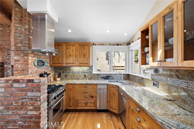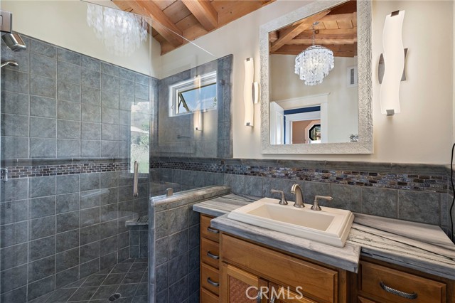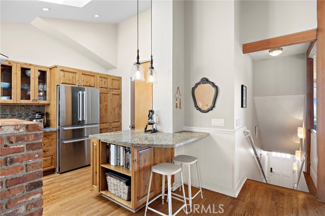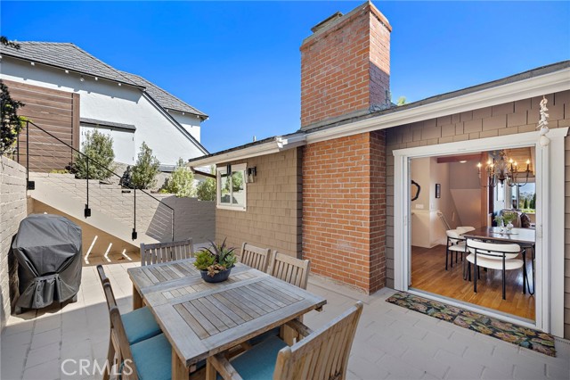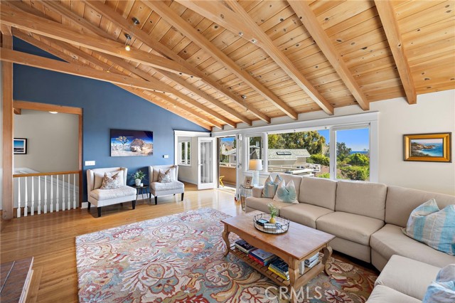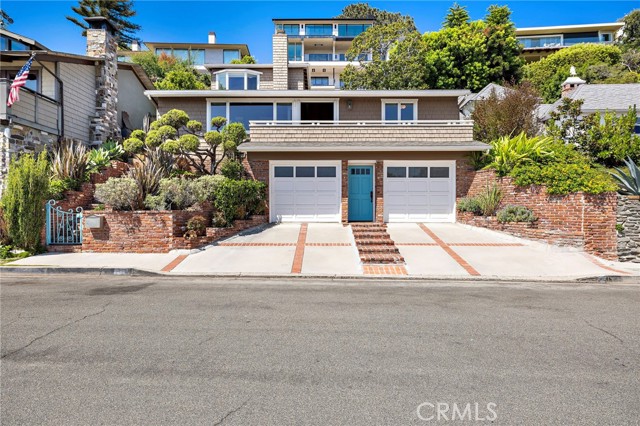 Nestled in the coveted Tree Streets of North Laguna, this beautifully appointed residence offers sweeping ocean and Catalina Island views from nearly every angle. With three en suite bedrooms and a layout designed for seamless indoor-outdoor living, the home blends classic charm with elevated coastal style. The main living room is warm and inviting, featuring soaring wood-beamed ceilings, oak flooring, a floor-to-ceiling brick fireplace, and oversized windows that frame the breathtaking views. Just off the living room, an expansive balcony provides the perfect setting for sunset watching or morning coffee by the sea. Open to the living space, the kitchen and dining area are designed with both style and function in mind—featuring high-end stainless appliances including a Viking stove, granite countertops with a breakfast bar, a second brick fireplace, and vaulted ceilings with a skylight providing abundant natural light. French doors from the dining area lead to a terraced garden oasis complete with multiple sitting areas, an upper deck with incredible views, and mature landscaping that includes lemon, orange, olive, and magnolia trees. All three bedrooms are en suite, with beautifully finished bathrooms. The primary suite stands out with its ocean views that make every morning feel like a retreat. Located in sought-after North Laguna, just blocks from world-renowned beaches, art galleries, upscale dining, and boutique shops, this home offers the best of Laguna Beach living in one of its most desirable neighborhoods.