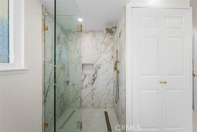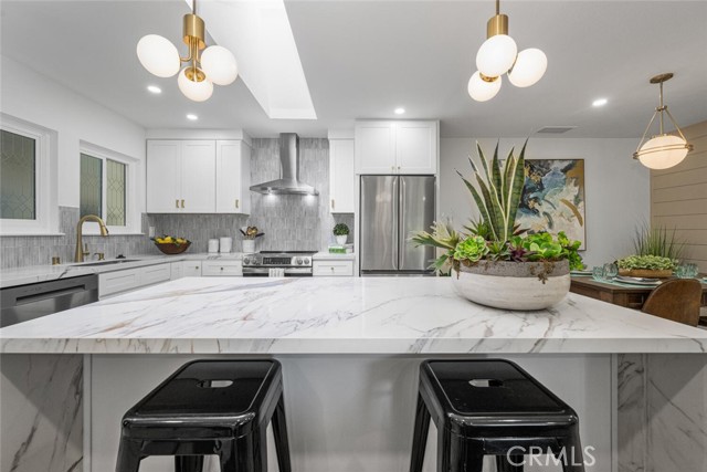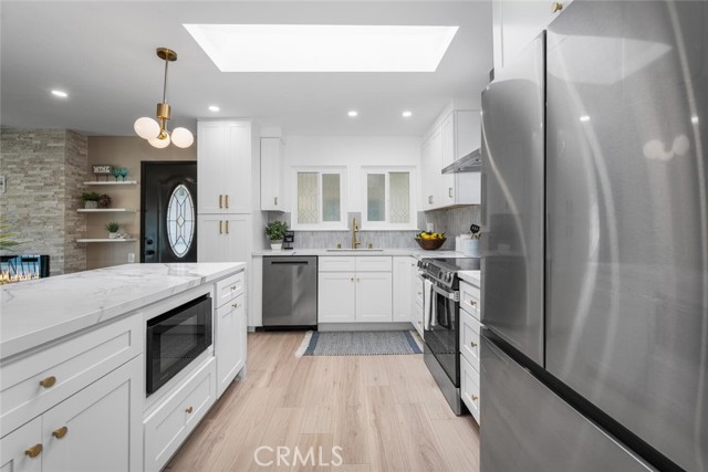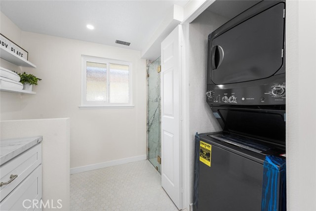 Seller motivated and willing to contribute towards closing costs! Welcome to this beautifully reimagined top-floor Casa Contenta model home, located in the desirable Third Mutual of Laguna Woods! Step inside to discover a stunning open-concept living space featuring recessed lighting and a custom floor-to-ceiling stone electric fireplace that serves as a striking focal point. Expansive dual-pane sliding doors bring the outdoors in, creating a serene, treehouse-like ambiance with an exceptional sense of privacy—no neighbors in sight. Natural light floods the home through a dramatic skylight that spans the width of the kitchen. The kitchen itself is a true showstopper, thoughtfully updated with sleek quartz countertops, stainless steel appliances, Shaker-style cabinetry, pendant lighting, and an oversized island with a breakfast bar—perfect for entertaining. Adjacent to the kitchen is a dedicated dining area accented by stylish custom lighting fixtures, ideal for hosting dinner parties or casual meals. Down the hallway, you'll find a beautifully updated guest bathroom featuring a new vanity, a fully tiled roll-in shower, and a glass enclosure. The unique floor plan includes a private primary suite, complete with a luminous white bathroom boasting quartz counters, a tiled floor, and a low-threshold glass-enclosed shower. Additional highlights include high-quality laminate flooring throughout, central air conditioning, and an in-unit washer and dryer for your convenience.This home is ideally situated within Laguna Woods, allowing residents to take full advantage of its amenities. Laguna Woods Village residents are privileged to enjoy a 27-hole championship golf course, a 9-hole executive par 3 course, pickleball and tennis courts, lawn bowling, gyms, clubhouses, swimming pools, horse stables, gardening centers, an art studio, a world-class wood shop, computer workrooms and classes + over 200 clubs and organizations!
