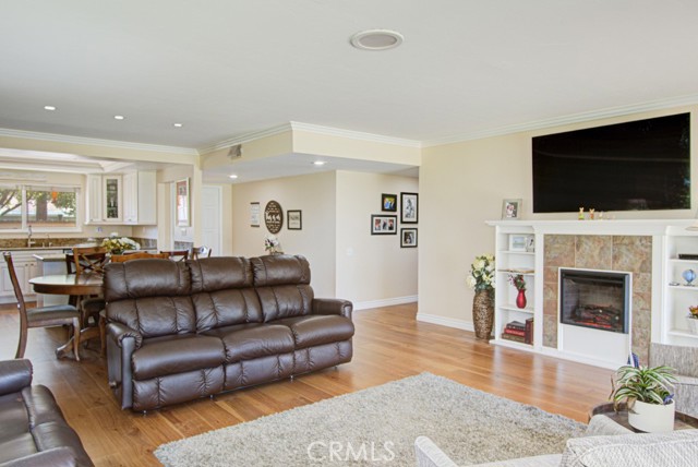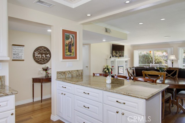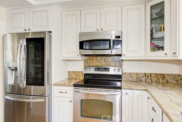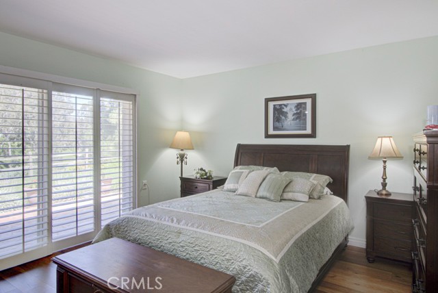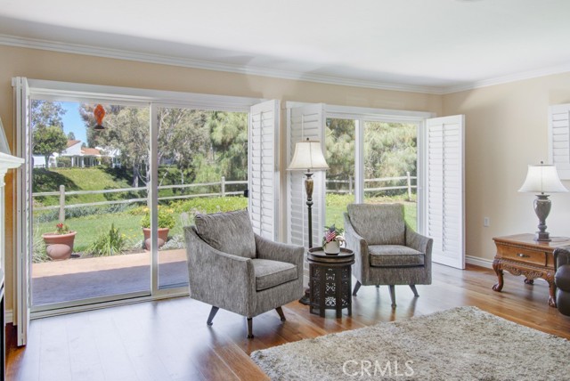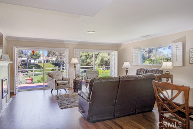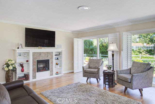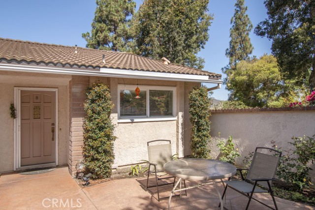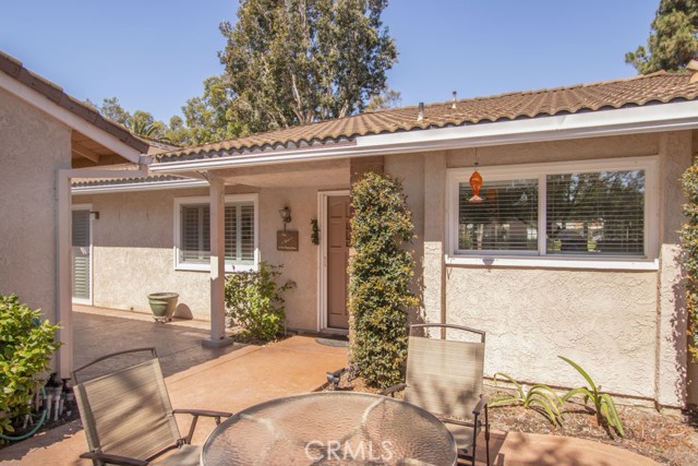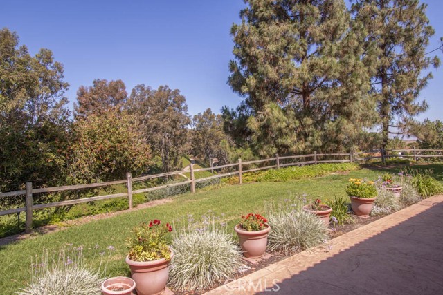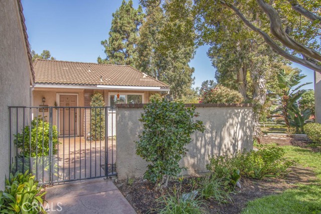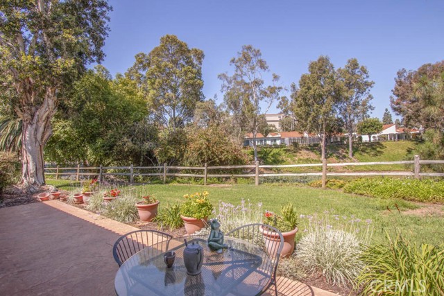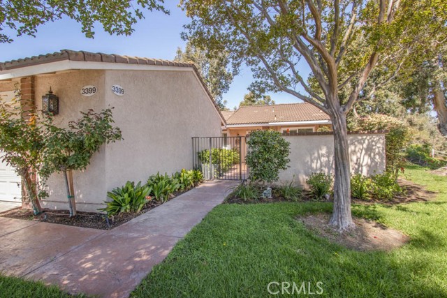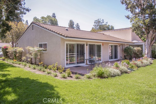 Lovely remodeled single-level, end-unit, three-bedroom, two-bath ANDALUZ residence in the Laguna Woods senior community. Situated at the end of a quiet cul-de-sac, this property is far from busy roads and noisy highways. The large front courtyard is beautifully landscaped with rose bushes and features an irrigation drip system. This is an ideal setting for outdoor entertaining, dining and relaxing. The spacious living room easily accommodates large furnishings. A bonus window as well as a solar tube has been added to the living room to allow more natural sunlight to enter. The living room also features direct access to the open rear patio. This patio looks onto a lawn and split rail fence and boasts a gorgeous panoramic view of endless trees. The highly upgraded kitchen features granite countertops, stainless steel appliances, cabinets with soft-close drawers, tasteful underlighting and a window that overlooks the front courtyard. The kitchen’s corner cabinets have stylish etched glass doors. The kitchen island comfortably seats up to three. There are two guest bedrooms (one with front patio access). Either of these guestrooms could serve as a home office, workout room, arts and crafts studio or any number of other uses. Additional upgrades throughout the home include smooth ceilings, crown molding and baseboards, recessed lighting, plantation shutters and dual-pane windows. There is attractive engineered wood flooring throughout the home and tile in both bathrooms. The oversized two-car garage contained additional built-in storage as well as washer/dryer hookups. The driveway can accommodate an additional vehicle and there is also guest parking in the cul-de-sac. Do not miss this exceptional property!