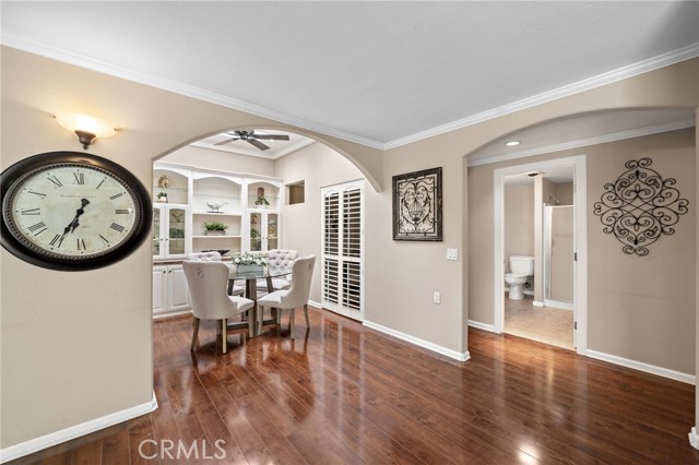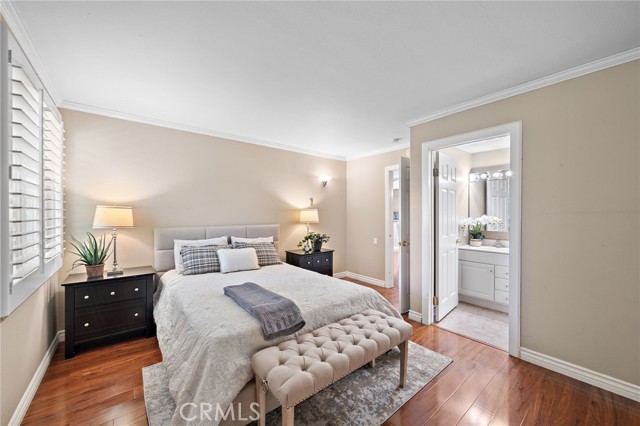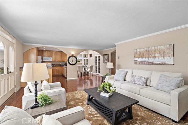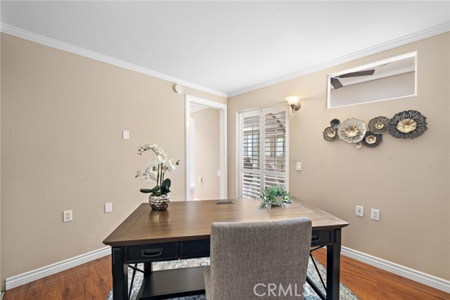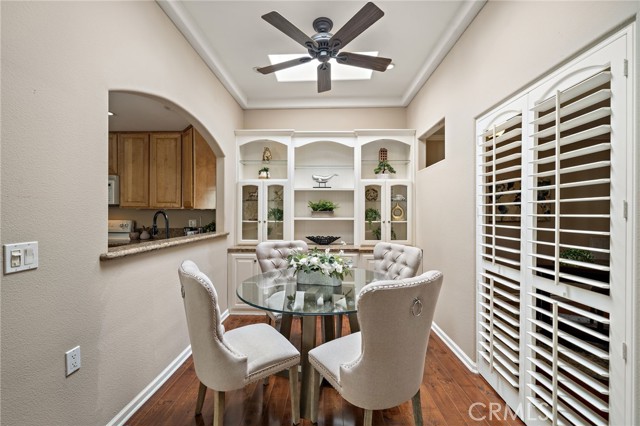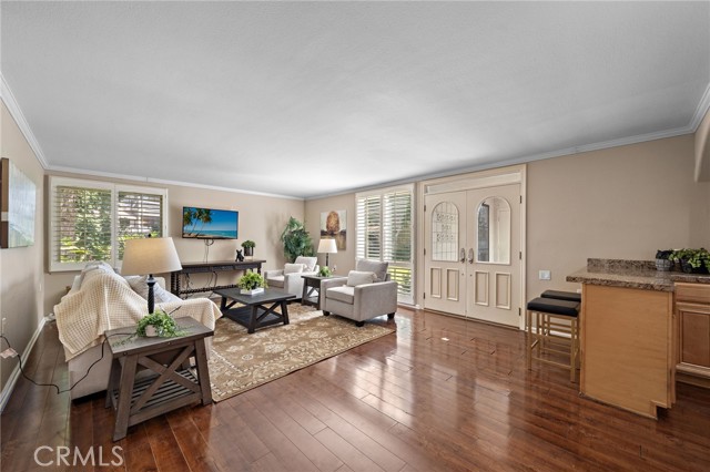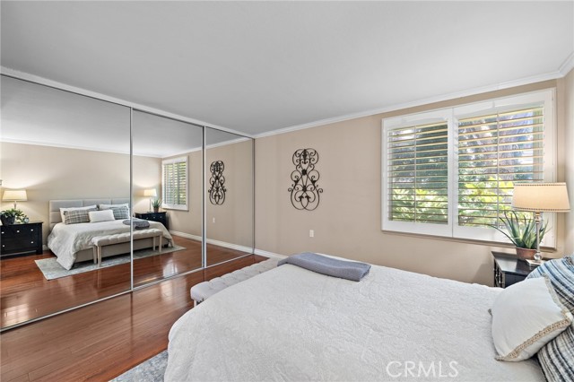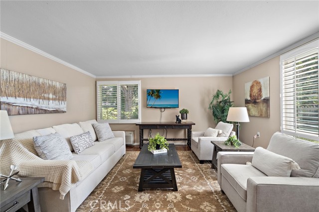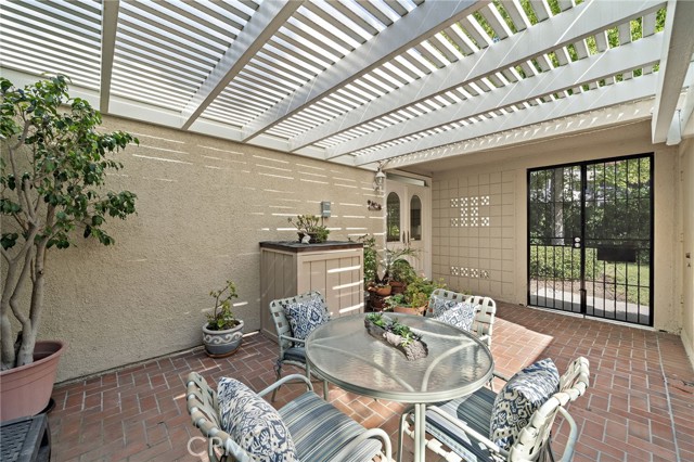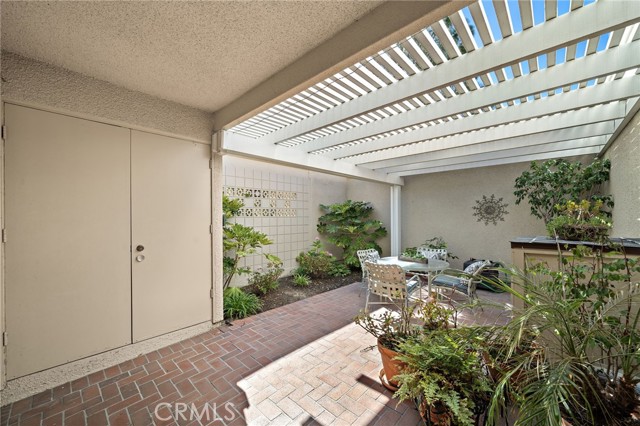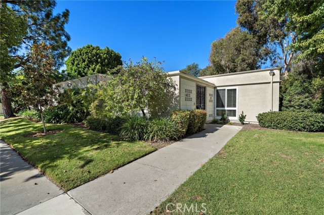 Private and quiet location for this Madrid coop in the premier age 55 and over community of Laguna Woods. While relaxing in privacy on your private patio, you have a view of a grassy area, beautiful trees, plants and flowers. Some of the features include: SINGLE STORY - NO STEPS - NO STAIRS - END UNIT - NO ONE ABOVE or BELOW - INSIDE LAUNDRY - WOOD LOOK FLOORING - REMODELED KITCHEN - WHITE VINYL WINDOWS - SMOOTH CEILINGS - SHUTTERS - CROWN MOLDING - SKYLIGHTS. As you enter through a beautiful inlaid glass front door, you find plenty of space in the living room. The kitchen has been remodeled with granite counters, a bar and looks on to the dining room. The dining room has beautiful built in cabinets and a skylight. The primary bedroom has a large window looking on to the outdoor area, mirrored closets and an en-suite bathroom with a tiled shower/tub. The second bedroom is the perfect size for an office, craft room, den or guest room. The hall bathroom is large with a stall shower. Laguna Woods is one of the most prestigious 55+ communities in Orange County with: bus system around the community & to area shopping, restaurants, medical facilities; 5 pools & 4 hot tubs; golf, tennis, library, 7 clubhouse, 200+ clubs, 3 fitness centers, theater, horse back riding/stables, garden centers, basketball, card rooms, billiards, bocce ball, Emeritus classes & more!