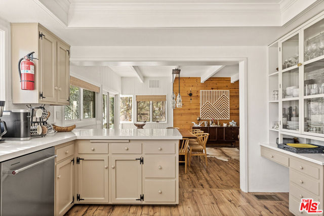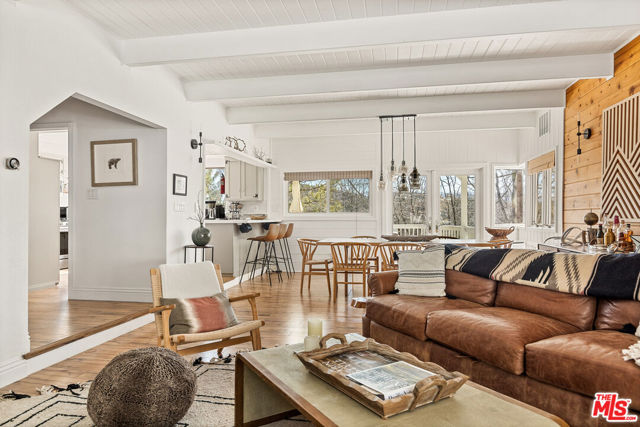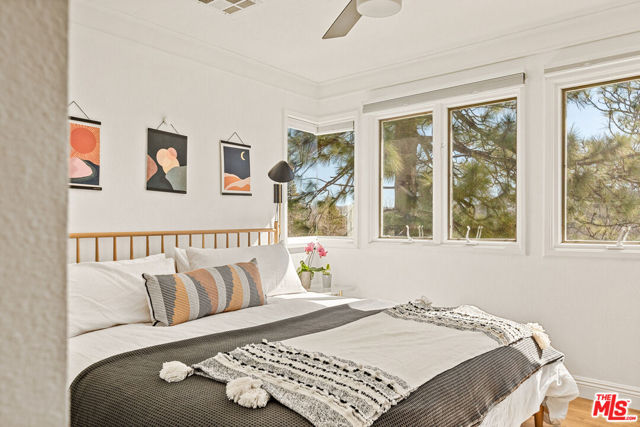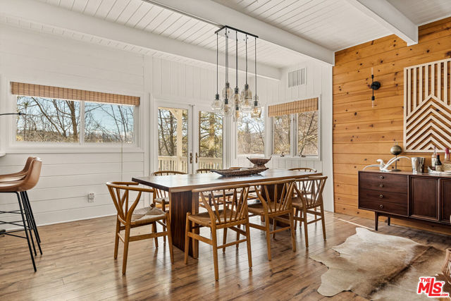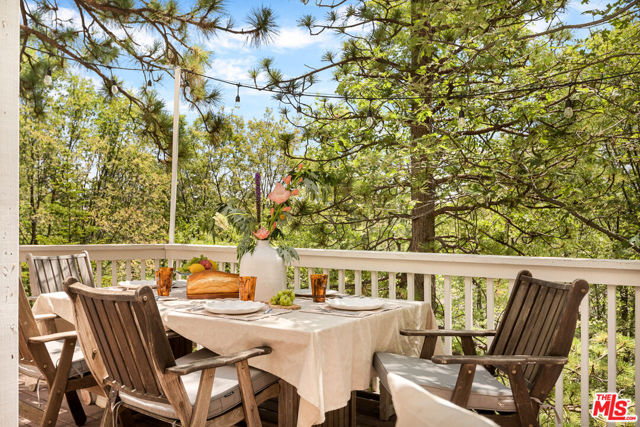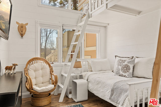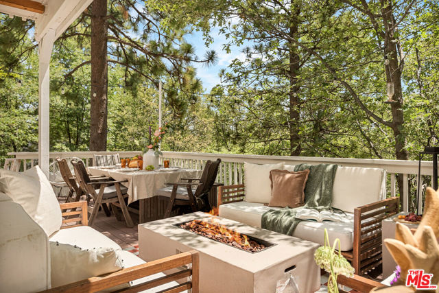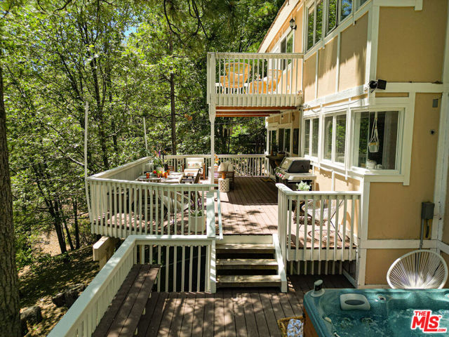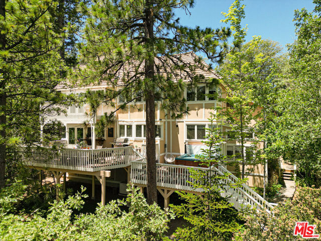 This extremely spacious and stylish 5 bedroom, 4 bathroom mountain home in Lake Arrowhead Woods offers the perfect blend of comfort, style, and convenience. With level entry access, lake rights, and over three spacious levels, this turnkey property is currently a successful short-term rental and offers incredible potential as a vacation getaway, investment opportunity, or full-time residence. Located in the desirable North Bay area just minutes from Tavern Bay Beach Club, the UCLA Conference Center, and a 10-minute drive to Lake Arrowhead Village, you'll be ideally positioned to enjoy all that the mountain lifestyle has to offer. This 3 level home was recently remodeled, and comes fully furnished with an eclectic blend of new and antique decorator pieces. The main level features an expansive open-concept living and dining area with a wood-burning fireplace, a large updated kitchen perfect for entertaining, a bedroom, fully renovated bathroom, dedicated office, and laundry room. Step outside to the generous 2 level deck with lounge seating, a dining area, fire pit, and hot tub, perfect for relaxing or hosting under the stars. The second floor showcases the grand primary suite with fireplace, a lovely light filled sitting area, a remodeled bathroom featuring designer finishes, fixtures, and custom marble vanity, an upper loft with storage, three closets, and a private balcony to view the picturesque treetop views and mountains. This 2nd floor level also has two additional bedrooms, a renovated bathroom with Kohler soaking tub, and a spacious A-frame media game-room with pool table. The lower level includes a separate bedroom and bathroom, accessible via a second interior staircase or its own private entrance - ideal for guests, in-laws, or rental flexibility. Additional amenities and features of the home include a whole house Generac generator, alarm/video camera system, tankless water heater with back up water heater, 3 floor zoned hvac with Nest thermostats, and ample level entry parking, including RV space. Whether you're looking for a high-performing short-term rental, a second home for family getaways, or a full-time residence in the mountains, this modern rustic gem delivers space, charm, and flexibility in one of Lake Arrowhead's most sought-after neighborhoods.