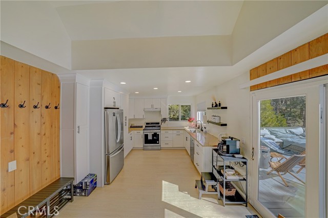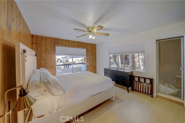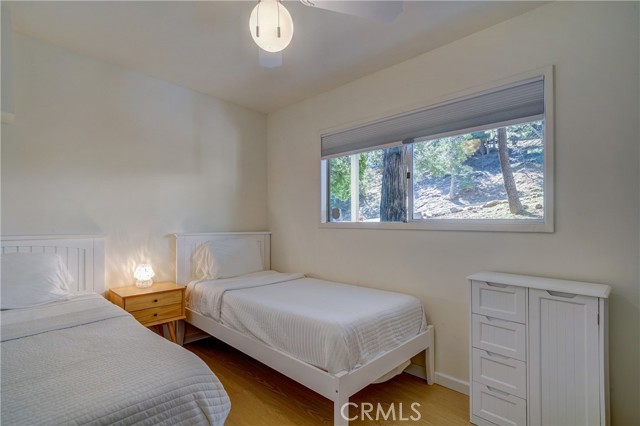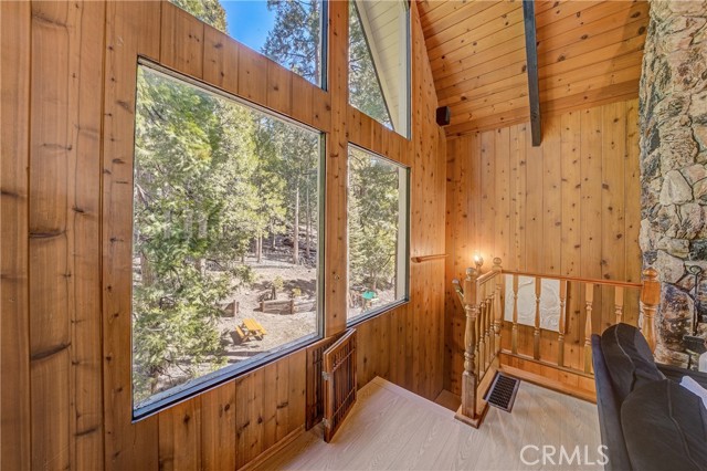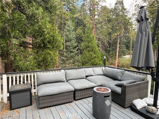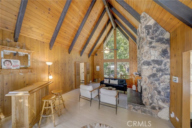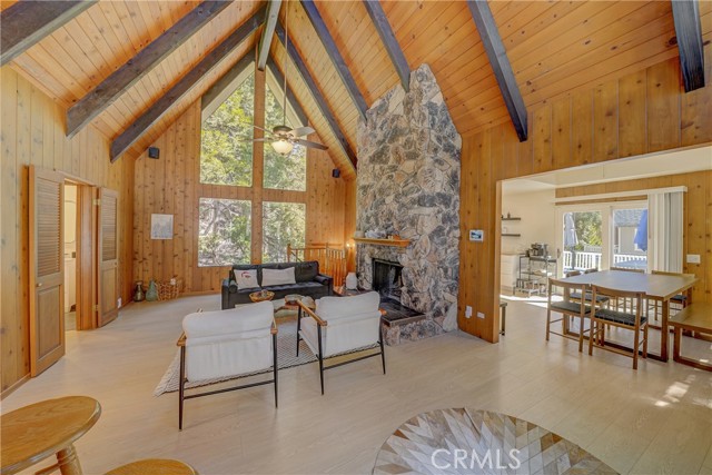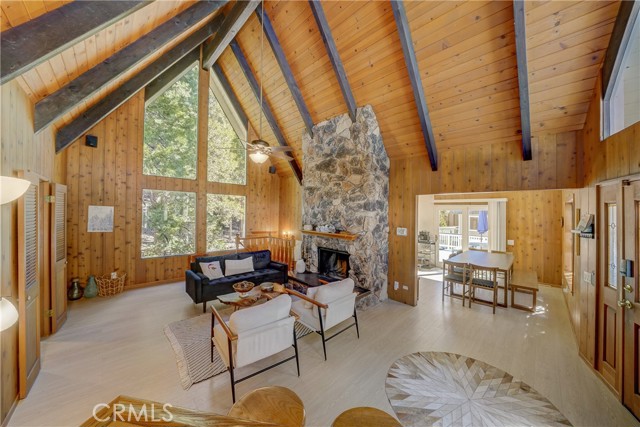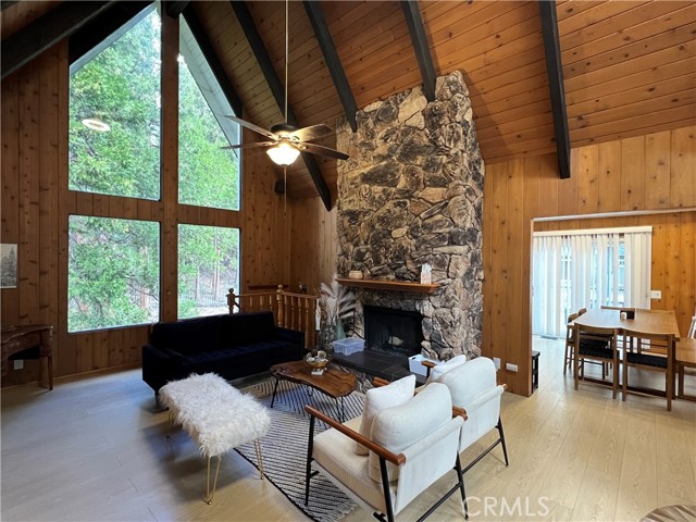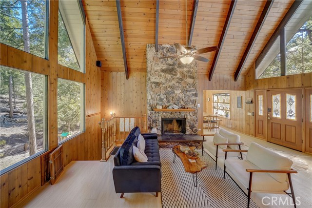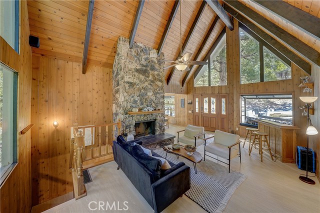 This 4-bedroom, 3-bath Thunderbird home offers level entry, a warm and inviting living room with a striking stone fireplace, and soaring vaulted ceilings with expansive windows. Remodeled kitchen, outfitted with stainless steel appliances. The main-level primary suite provides comfort and convenience, while the lower level features two spacious bonus rooms, additional bedrooms, and baths—perfect for guests, family, or flexible use. Step outside to your private backyard with a seasonal stream, ideal for peaceful mornings or al fresco entertaining. Oversized decks, ample parking, and a generous lot backing to untouched open space add to the sense of privacy and relaxation. This turn-key property is ready for you to move in and start enjoying the Lake Arrowhead lifestyle, complete with access to the private lake—your perfect mountain escape awaits.