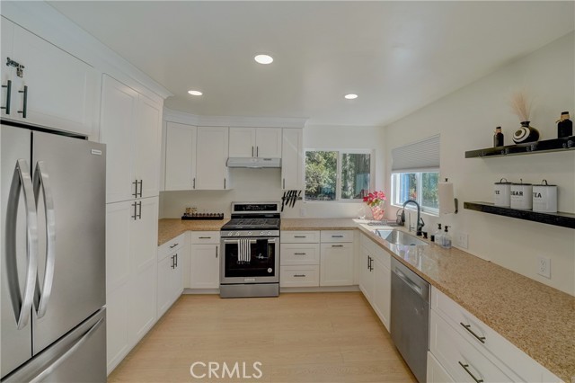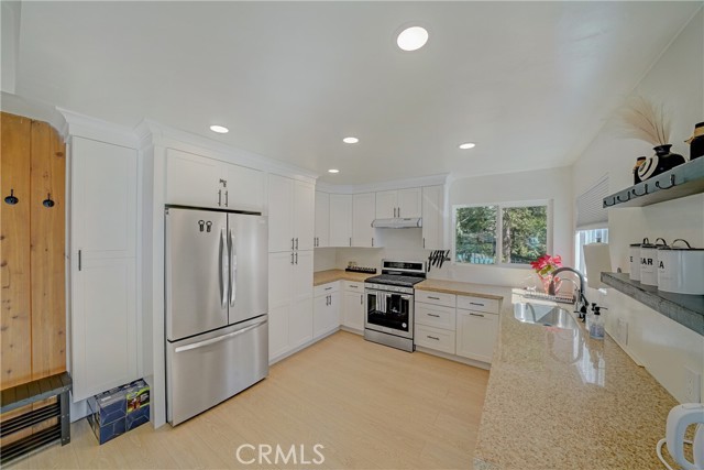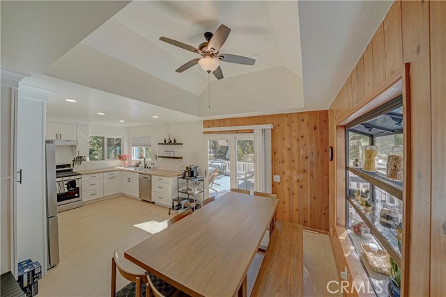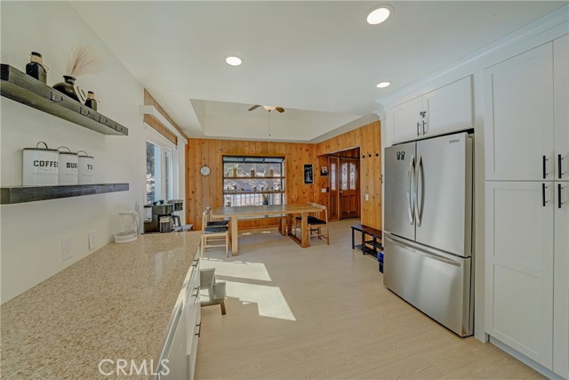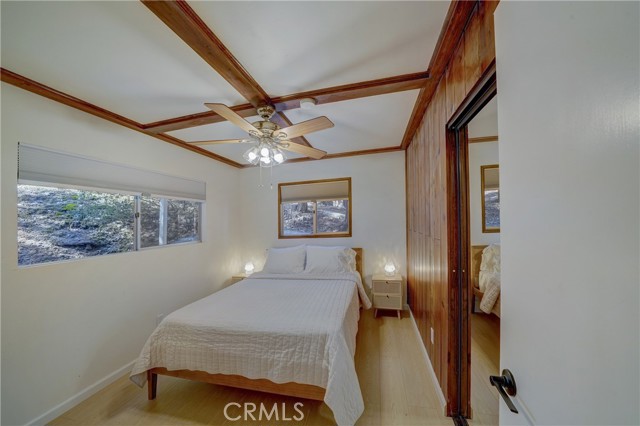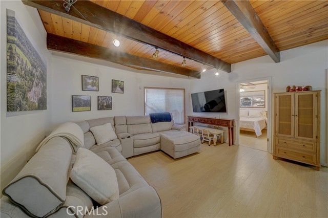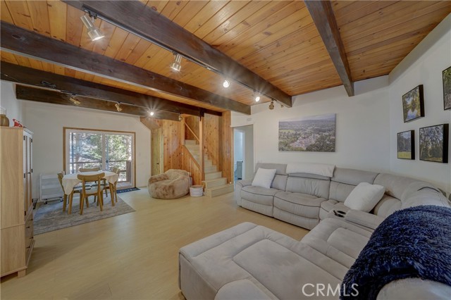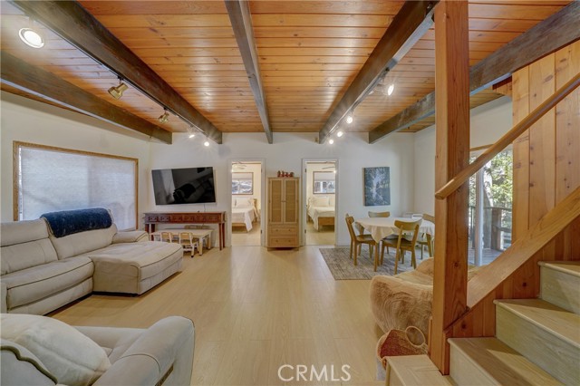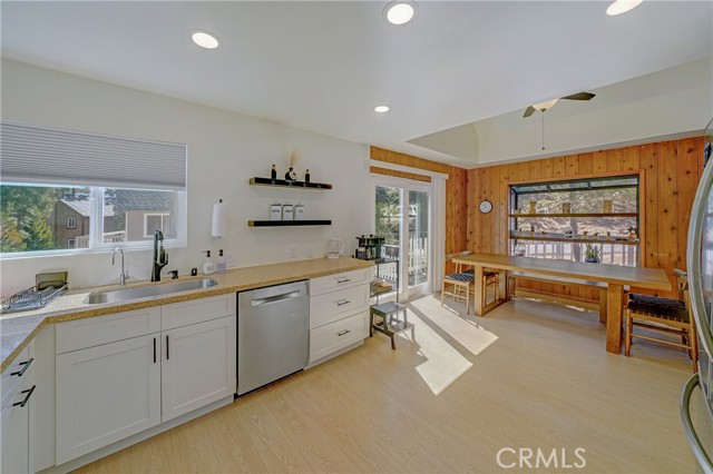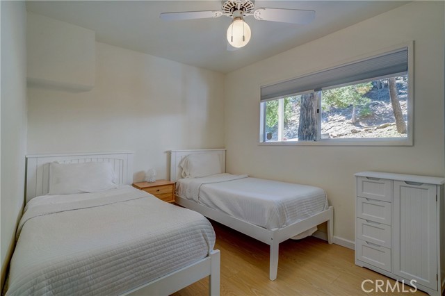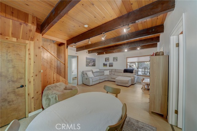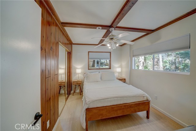 This 4-bedroom, 3-bath Thunderbird home offers level entry, a warm and inviting living room with a striking stone fireplace, and soaring vaulted ceilings with expansive windows. Remodeled kitchen, outfitted with stainless steel appliances. The main-level primary suite provides comfort and convenience, while the lower level features two spacious bonus rooms, additional bedrooms, and baths—perfect for guests, family, or flexible use. Step outside to your private backyard with a seasonal stream, ideal for peaceful mornings or al fresco entertaining. Oversized decks, ample parking, and a generous lot backing to untouched open space add to the sense of privacy and relaxation. This turn-key property is ready for you to move in and start enjoying the Lake Arrowhead lifestyle, complete with access to the private lake—your perfect mountain escape awaits.