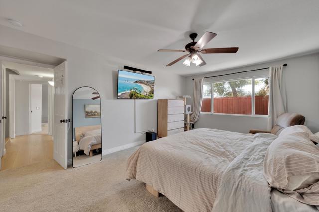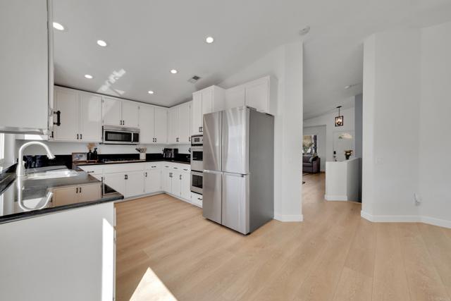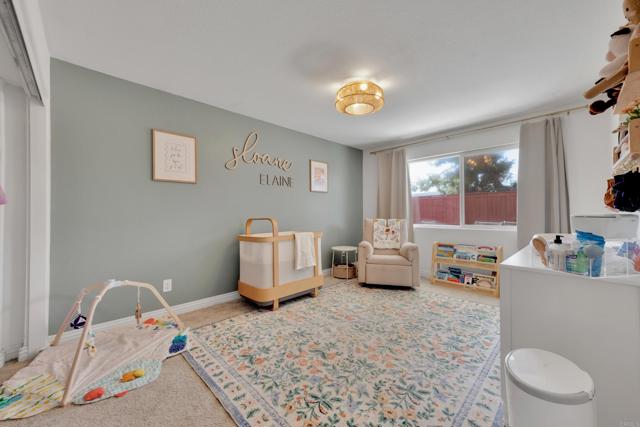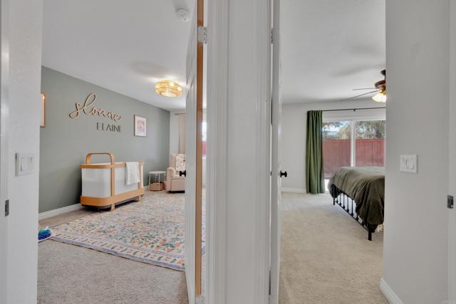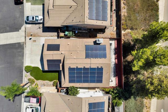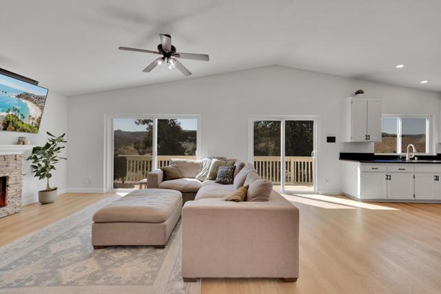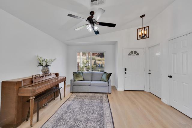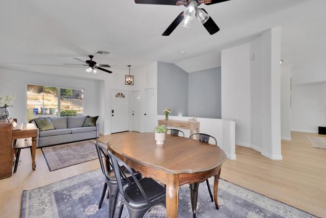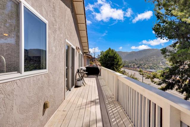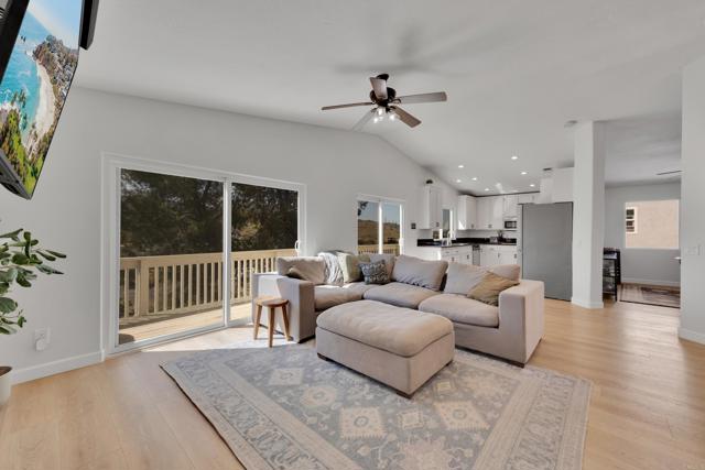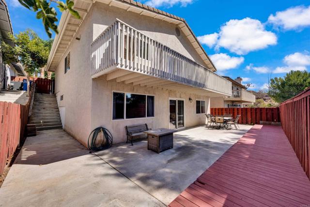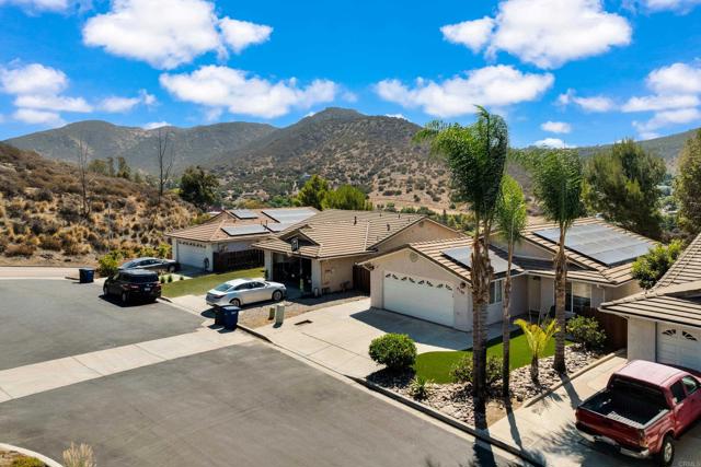 This home is loaded with modern upgrades, including newer laminate flooring throughout the living areas, a Vivint smart home system, energy-efficient solar panels, and a NEMA 14-50 EV charging outlet—perfect for electric vehicle owners. Step inside to a bright and airy main floor, featuring a spacious Living Room with vaulted ceilings that create an inviting ambiance. Adjacent to the Living Room is the open-concept kitchen and Family Room which provide the perfect space for entertaining or relaxing with loved ones, all while enjoying picturesque views of the surrounding hills. Just off the Family Room, step out onto a large deck that takes full advantage of the views. The kitchen features granite countertops, stainless appliances, and ample space for all your culinary adventures. A main-floor bedroom and full bathroom offer flexibility for guests, a home office, or multi-generational living. Downstairs, you'll find three generously sized bedrooms and two full bathrooms, including a primary suite complete with a large walk-in closet and a private ensuite bathroom. Each bedroom is oversized, providing a comfortable and relaxing retreat for all. The lower level also opens to a covered patio and fenced backyard, offering additional outdoor living space perfect for gatherings, play, or relaxation. Located on a private Cul-De-Sac just minutes from Lake Jennings, freeway access, and endless recreational opportunities, and approximately 30 minutes to both beaches and mountains, this home offers both convenience and an exceptional quality of life.