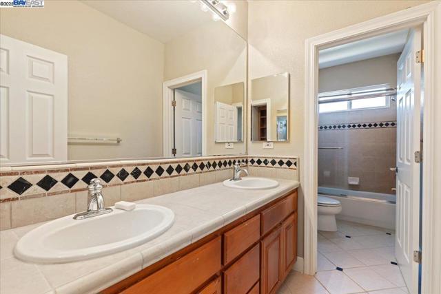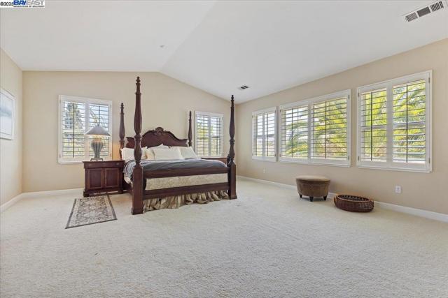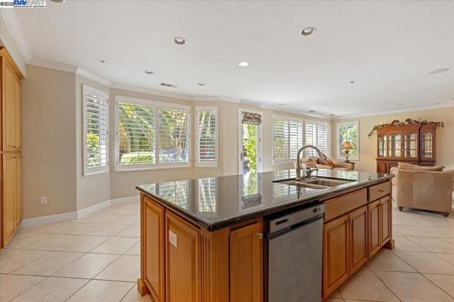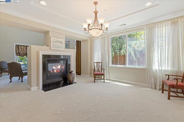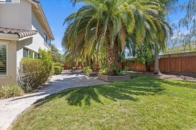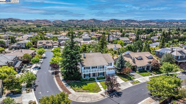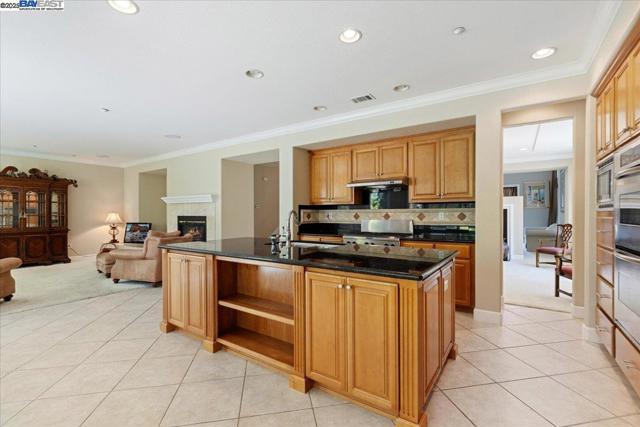 Welcome to this northeast facing South Livermore home located in the heart of the South Livermore Valley! Bright and open entry leads to living room with high ceilings and large formal dining room with double sided gas fireplace. There is a bedroom and full bath plus half bath downstairs. The kitchen has expansive counter space and is highly upgraded with slab granite counters with tumbled marble trim in the back splash, large center island, , stainless steel kitchen aid appliances including built-in refrigerator and loads of cabinet and pantry space. The sunny breakfast nook and kitchen are open to the spacious family room with raised hearth with marble finish. Upstairs are 4 bedrooms plus bonus room with access to large balcony. The master suite has large his and hers closet, master bath with marble tile finish and separate jetted tub. Upgrades include plantation shutters, surround sound in the family room, and crown molding. The backyard is private and has shaded areas plus spacious lawn for kids to play or future pool. Dont miss this rare opportunity to own a well appointed home located in the heart of the South Livermore Valley.