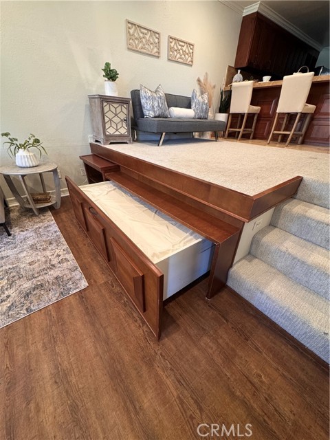Price Improvement! Welcome home to a light filled, beautifully upgraded studio with an inviting view of the pool, spa and tranquil lagoon. This stylish space lives larger than expected and is packed with thoughtful upgrades throughout. Heated Travertine flooring welcomes you in the entry, kitchen and bath. The kitchen and bath both feature custom solid wood cabinetry paired with granite counters, offering a refined, timeless look. The spacious walk in closet includes built in organizers, cabinets and a cozy seating area that maximizes both storage and comfort. A cleverly designed hidden roll out bed adds flexibility, and the convenience of inside laundry with a stacked washer and dryer makes daily living effortless. The monthly Homeowners Association dues include twenty four hour guarded gate security, earthquake flood and fire insurance, gas, water, trash and access to eighteen acres of beautifully maintained, resort style amenities. Monthly HOA is six hundred twenty eight dollars, plus an additional SCFC fee of one hundred twenty six dollars. The home is located in Key 20. Marina Pacifica is a premier waterfront community offering six pools, relaxing spas, a clubhouse with a fitness center and lush landscaping throughout. You are just a short stroll to Naples, the local Farmers Market, the Marina Pacifica Mall and the impressive new retail village at Second and PCH. The Passport shuttle also stops just outside the community for easy access to Belmont Shore, downtown Long Beach and the METRO line into LA.