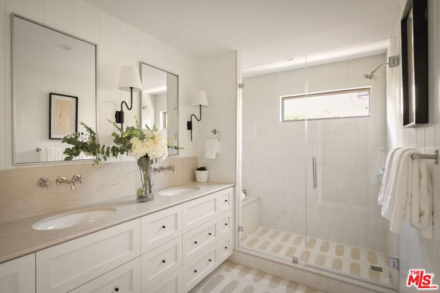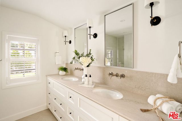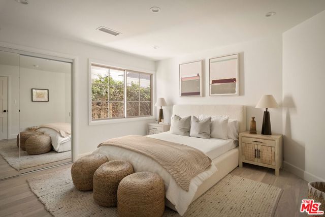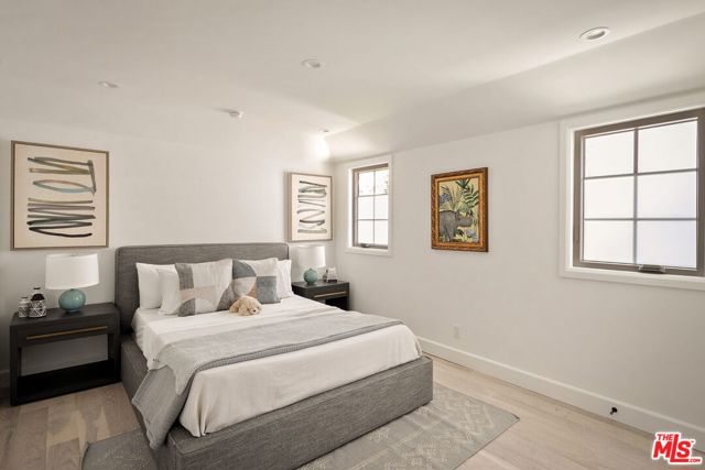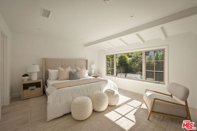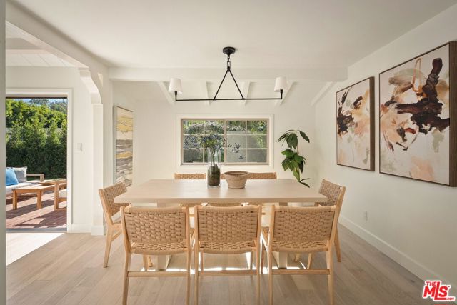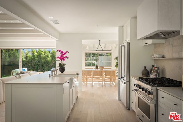 Completely transformed in 2025, this Westwood residence has been rebuilt as a turnkey sanctuary of light, style, and sophistication. Inside, a flowing open layout is framed by large windows, beamed ceilings, and white oak floors that infuse every space with warmth and airiness. The living room centers around a gas fireplace and opens effortlessly to the backyard through expansive sliding glass doors, creating the ideal setting for indoor/outdoor living. The adjoining kitchen is both beautiful and functional, with white shaker cabinetry, stone countertops, a generous seated island, and a walk-in pantry. Premium Viking appliances add convenience for the avid cook or entertainer, while the window-lined dining area offers a sunlit setting for casual meals or lively gatherings. The serene primary suite provides a private retreat with a walk-in closet and a spa-like bathroom featuring dual vanities and a glass-enclosed shower adorned with designer tile. Down the hall are three additional bedrooms, one suited as a home office, and two stylish bathrooms. Outside, the fully fenced backyard invites long afternoons in the California sunshine. Dine al fresco on the brick patio, unwind on the lawn, and enjoy the ease of a custom home that's been thoughtfully crafted for modern living. With a new pull-through driveway, dedicated laundry area, and all-new systems and finishes, every detail has been designed for comfort and peace of mind. Set on a desirable corner lot just moments from Brentwood Village, The Getty, and the boutiques and dining along San Vicente Boulevard, this home captures the essence of refined Westside living.