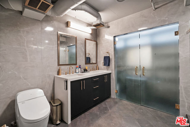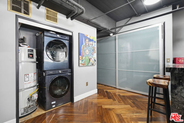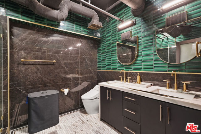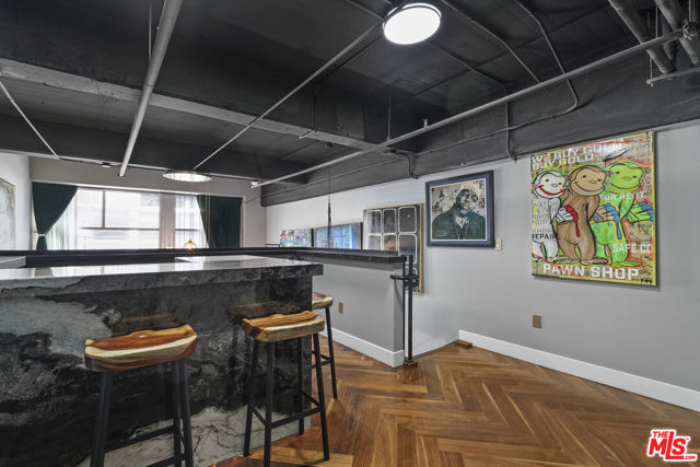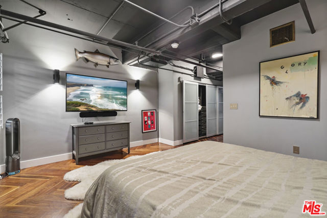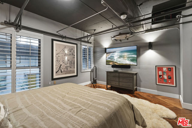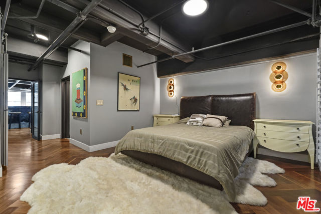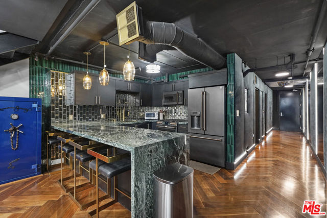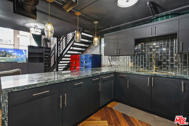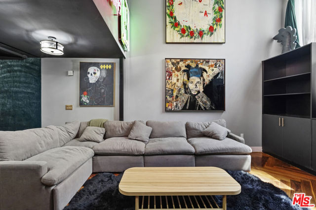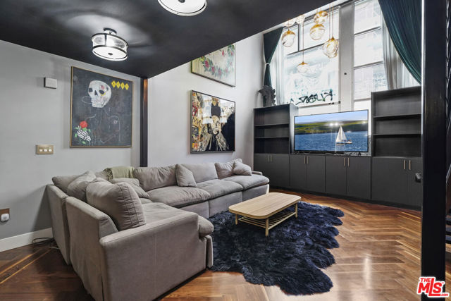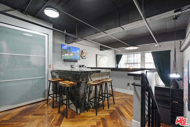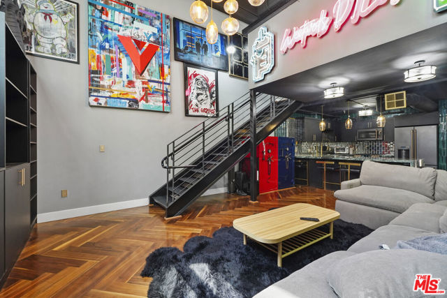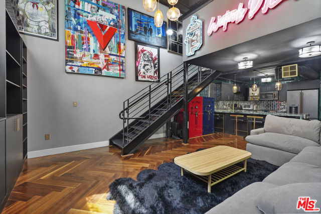 Urban Luxury Living at Flower Street Lofts! Experience elevated city living in this stunning 2-story, ground-level loft at the sought-after Flower Street Lofts, nestled in the heart of South Park, Downtown Los Angeles. Spanning appx 1,420 SF, this versatile live/work space showcases an expansive open floor plan with soaring 20+ foot ceilings and a meticulous $300K remodel featuring sophisticated, high-end finishes. Step through a dramatic entry adorned with velvet accent walls and custom LED lighting, flowing seamlessly into herringbone walnut flooring throughout. The first level offers a bedroom with built-in storage and a Murphy bed, a stylish bathroom with a large shower and extra storage space, and a gourmet kitchen featuring super matte black custom cabinetry, striking green marble countertops, and premium stainless steel appliances. Upstairs, the spacious primary suite includes custom-organized closets, a luxurious bathroom with double shower heads and sleek vanity, an in-unit washer and dryer, and a newly added custom bar- ideal for entertaining. Amenities include two secured parking spaces (one covered and one uncovered) in the adjacent structure accessed via a fourth-floor bridge. The HOA covers Spectrum package with high-speed internet, basic cable plus HBO Max and Showtime, building insurance, and water. Located just steps from LA Live, Crypto.com Arena, Whole Foods, and Ralphs, this property offers an unbeatable combination of style, comfort, and convenience, with easy freeway access and exciting new developments underway in preparation for the 2026 World Cup and 2028 Olympics.