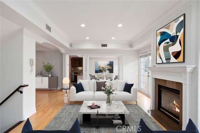 If you’ve ever dreamed of the soaring vertical elegance of a Manhattan penthouse with the calm charm of Brentwood, welcome home. Rising four dramatic stories, this front-facing 4-bedroom 4-bath condo feels more like a luxury brownstone than a traditional LA condo. From the moment you enter, this architectural showpiece impresses with an expansive main-level living room flooded with natural light, a 20-foot-ceiling primary suite with its own private loft and direct access to a sprawling rooftop deck, and yes, a rare 4-car parking arrangement, practically unheard of on the Westside. A sun-splashed open layout welcomes you with soaring ceilings, rich hardwood floors, and three sets of French doors opening to a beautiful balcony that invites fresh air and golden LA sunshine to flood the home. The living room is anchored by a warm fireplace and flows effortlessly into a formal dining area and a chef’s kitchen that checks every box: Viking stainless steel appliances, granite counters, and abundant cabinetry. Upstairs, prepare to be wowed. The primary suite is a sanctuary with soaring 20’ ceilings, luxurious black walnut floors, dual walk-in closets, and a spa-like en-suite bath featuring marble vanities, a soaking tub, and separate glass shower. But it doesn’t stop there — a private loft retreat opens to your own sun-drenched rooftop deck — the perfect place to unwind, entertain, or stargaze over Brentwood. The additional bedrooms are flexible, stylish, and perfect for family, guests, a home office, or creative studio. Just steps from San Vicente’s vibrant dining, upscale boutiques, and beloved Sunday farmers market, this residence delivers the ultimate Brentwood lifestyle. Whether you're drawn to its elegant design, unbeatable location, or simply the lifestyle it promises — this one is not to be missed.