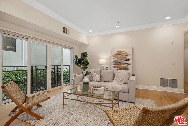 This refined elegant building is located near renown shops and restaurants in the heart of Brentwood. The luxurious single story condo features a formal entry leading to an expansive, light-filled living room/dining area lined with high ceilings, crown moldings, hardwood floors and a stone fireplace. The gourmet kitchen is equipped with custom made cabinets, granite countertops and stainless steel appliances. The primary bedroom offers a peaceful retreat with ample closets and a private balcony. The large ensuite bath has a spa-like tub, separate glass enclosed shower and double sinks. The second and third bedrooms have large closets and an adjoining bath, and provide versatile spaces that can accommodate guests or can be used as home office, hobby rooms or fitness areas. In unit laundry, AC, and plantation shutters throughout. Two assigned parking spaces in a secure garage.