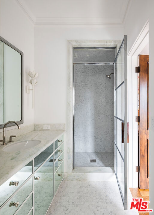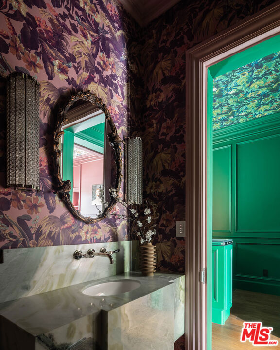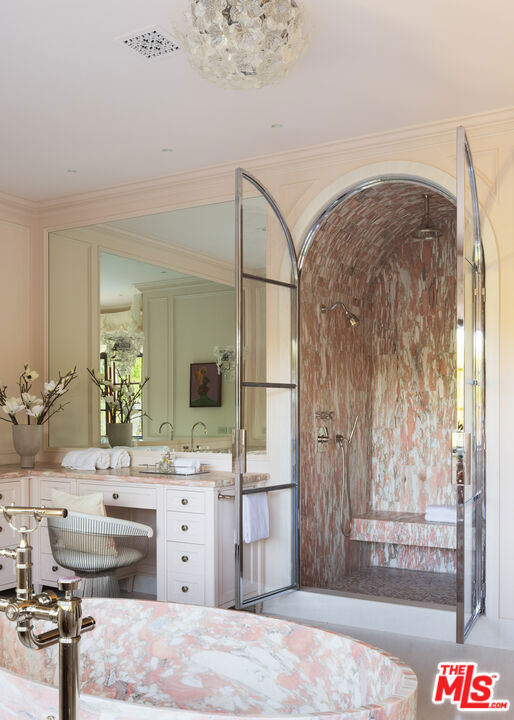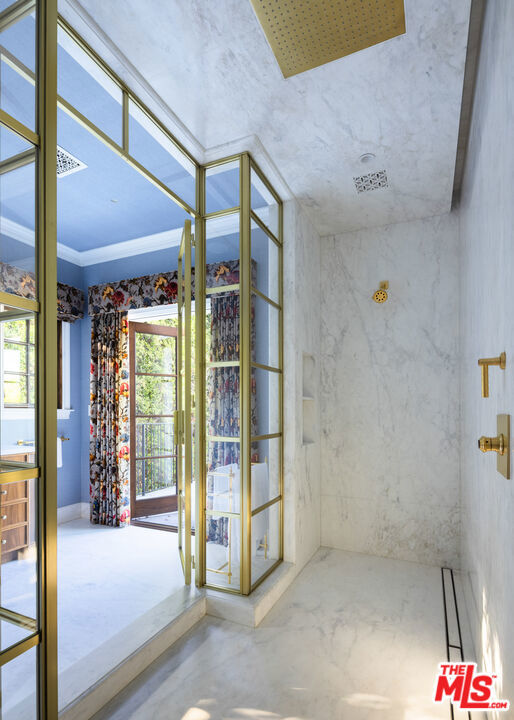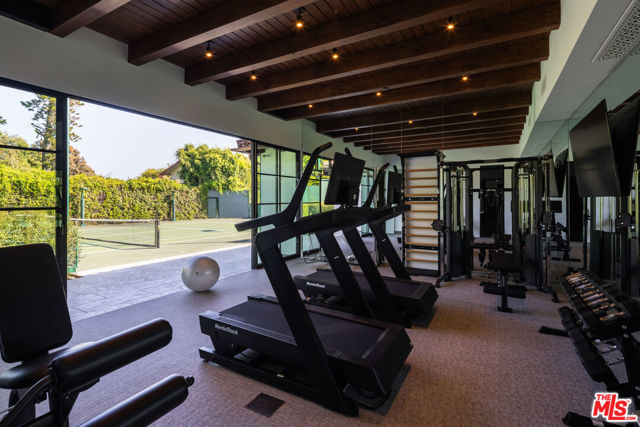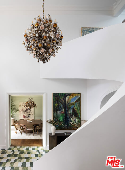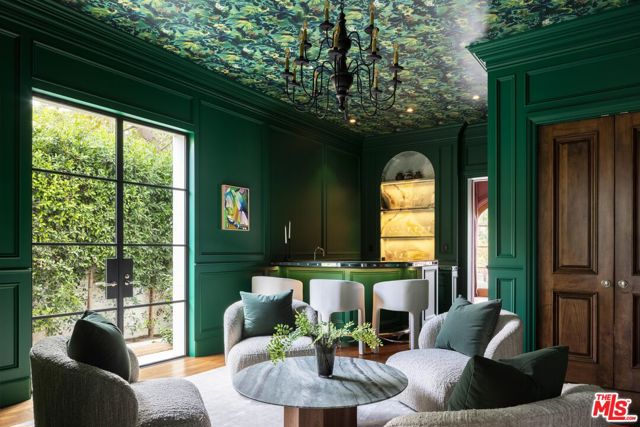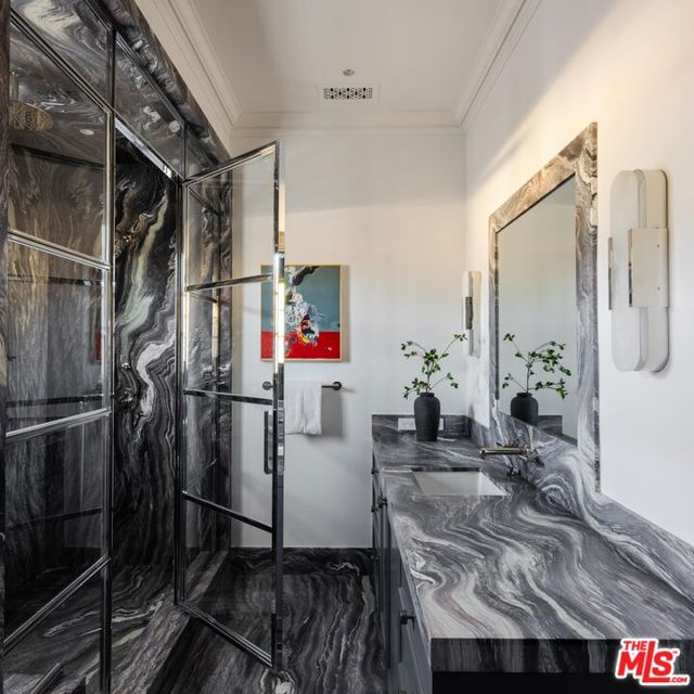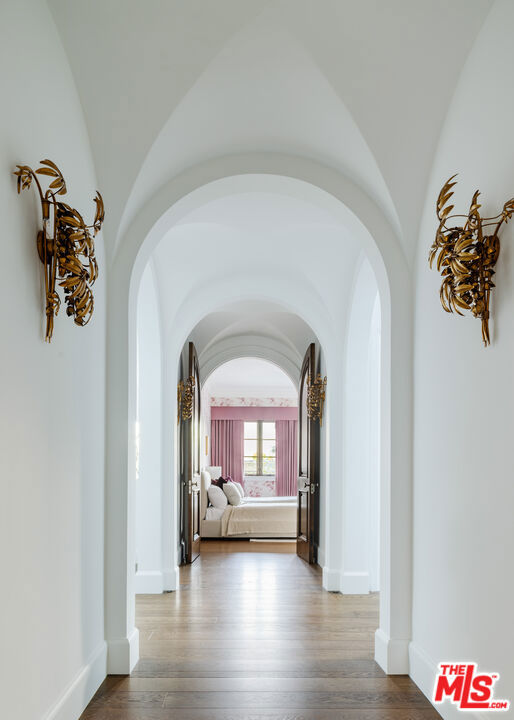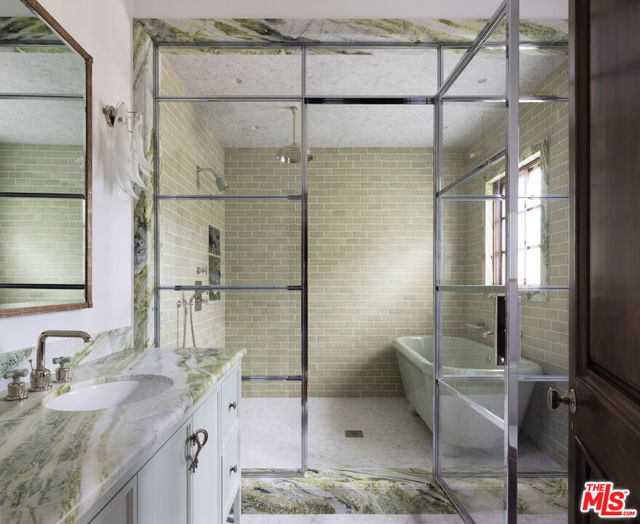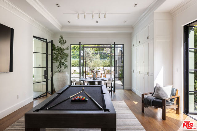 Behind the gates of a private cobblestone motor court in the heart of Brentwood Park stands The House of Hanover. Timeless European architecture reimagined through a contemporary lens this is the result of a three-year collaboration between AY Architects, Rattigan Construction, and Coppel Design. Spanning nearly 12,000 square feet entirely above grade, the residence reflects uncompromising craftsmanship at every turn. Dramatic ceiling heights and voluminous interiors unfold through a sequence of elegant spaces framed by arched passages, wide-plank wood floors, and black steel windows and doors accented with Nanz New York hardware. The Italian chef's kitchen crafted by Officine Gullo Firenze is a statement in precision and beauty, showcasing hand-finished stainless steel cabinetry, an eight-burner range, and Gaggenau dual ovens and refrigeration. Formal and informal living rooms, a pub lounge, game room, library and dining salon together create a seamless flow ideal for both grand entertaining and intimate living. Upstairs, five generous en suite bedrooms reveal an artful interplay of pattern and stone, featuring House of Hackney wall coverings and exquisite natural marbles. The primary suite is a private sanctuary with dual baths clad in Norwegian Rose marble and custom walk-in dressing rooms, each designed with couture-level detail. Beyond the main residence, the grounds evoke a private resort with a resort-sized pool with Badu swim jet, north-south tennis court and a spectacular entertainer's pavilion complete with raised-beam ceilings and a full bar overlooking the tennis court. Additional amenities include a detached professional gym, state-of-the-art theater, pool changing room with outdoor shower, full outdoor kitchen with bbq and pizza oven and a three-car garage with built-in storage. Throughout, every fixture and finish tells a story of connoisseurship: lighting by Paul Ferrante, Mechini, I Borbone and Murano chandeliers, plumbing by Sherle Wagner and THG, Crestron home automation, solar system and a backup generator for seamless comfort and effortless lifestyle. The House of Hanover represents the rarest form of Los Angeles luxury, a one-of-one estate of timeless character and contemporary grace.