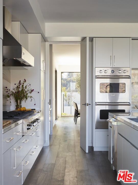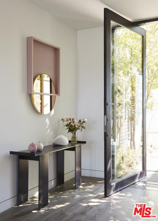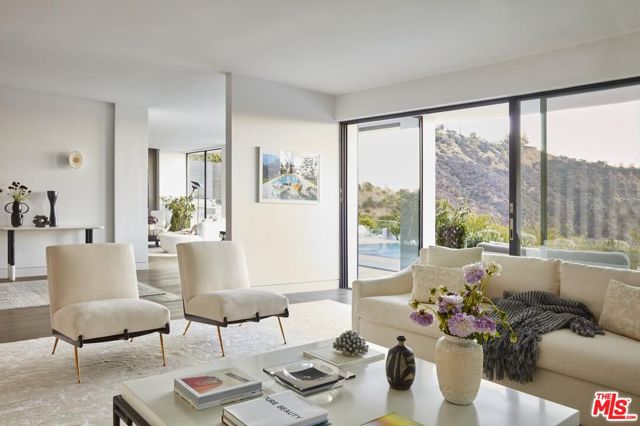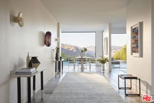Located at the top of Stone Canyon Road, just minutes from the Hotel Bel-Air, this beautifully designed Mid-Century Modern home offers stunning views of the Stone Canyon Reservoir. Designed by renowned NYC designer Sara Story, the interiors combine modern elegance with timeless sophistication, creating a space that is both stylish and cozy. A formal art-gallery entrance leads to a bright, open floor plan with floor-to-ceiling Fleetwood doors, seamlessly connecting the indoor living spaces to a zero-edge pool and expansive glass-edged deck. The living and great rooms flow effortlessly outside, maximizing the home's indoor-outdoor lifestyle. A fire pit on the deck offers a relaxing space to take in the views, while the outdoor BBQ area is perfect for entertaining. The formal dining room features city lights views alongside an impressive glass wine room, while a first-floor screening room delivers a state-of-the-art home theater experience. A private office offers a serene workspace. The chef's kitchen is equipped with Viking appliances, Walker Zanger exotic marble countertops and backsplash, and a barbecue bar for outdoor cooking. The primary suite boasts stunning blue water views and a luxurious bath finished in Sea Pearl Quartzite. Upstairs, three additional bedrooms offer flexibility - one is perfectly suited for use as a gym or wellness space - while a first-floor guest suite ensures privacy and comfort for visitors. Arlo, Nest, and Sonos systems are integrated throughout, enhancing both convenience and functionality. A true Bel-Air retreat, this home offers breathtaking views, seamless indoor-outdoor living, and exceptional design.