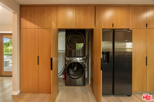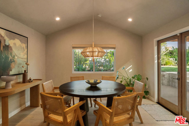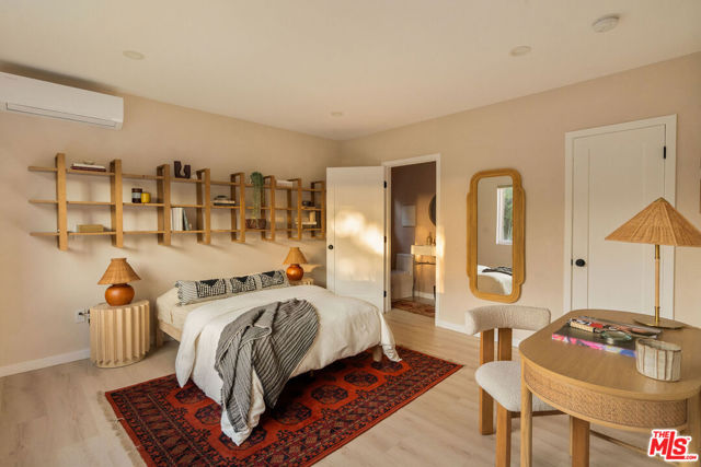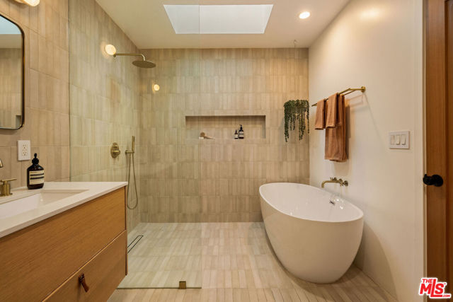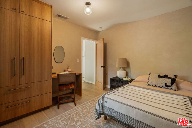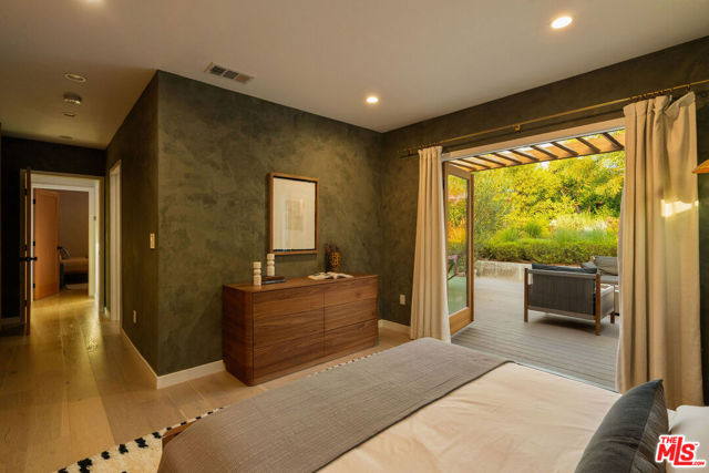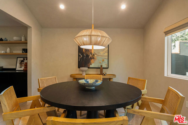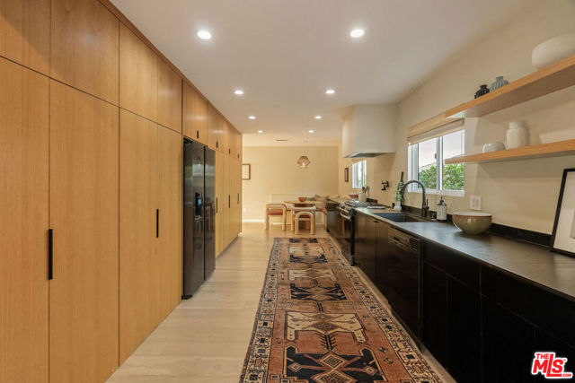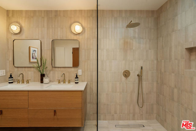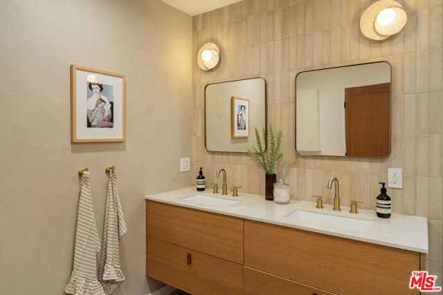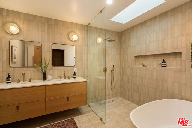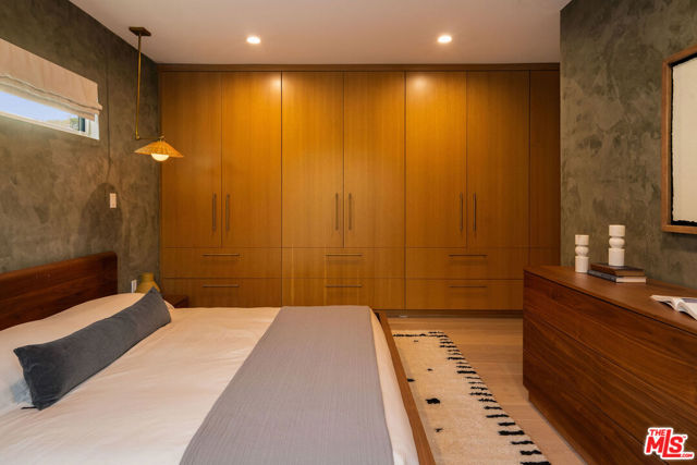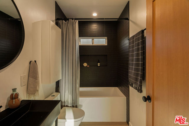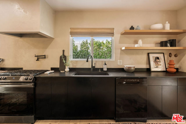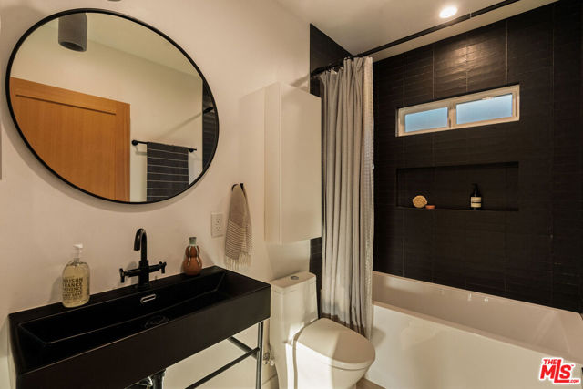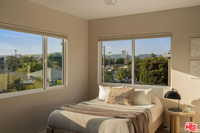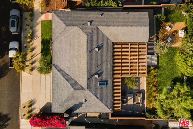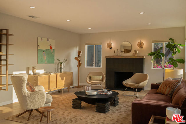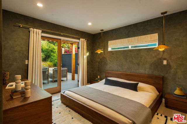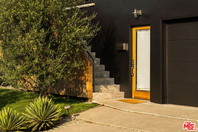 Striking Mid-City Design Retreat. Welcome to this meticulously reimagined home, tucked away on a quiet cul-de-sac. Ascend a private stairway to the main level where a 3-bedroom, 2-bath residence unfolds, complemented by a versatile 1-bedroom, 1-bath lower-level studio.The exterior makes a bold statement with a matte black faade softened by a warm white oak slat wall and framed by a stately olive tree. Inside, sunlight fills the generous living room, where a fireplace, custom Burrow shelving, and designer sconces set a refined tone. Roman clay walls bring texture and depth throughout, while automated shades and curated lighting enhance each space with ease.The kitchen blends beauty and function with flat-panel cabinetry, black leathered stone countertops, and high-end stainless appliances. A custom banquette anchors the breakfast nook, while the main dining spacecomplete with vaulted ceilings and French doorsflows seamlessly to the garden and expansive deck.Bedrooms are thoughtfully placed for privacy and comfort, with one enjoying city views at the front and two overlooking the tranquil backyard, including a dreamy primary suite. The ensuite is a true escape with a freestanding soaking tub, dual vanities, and a skylit walk-in shower. A second bath with soaking tub completes the sleeping quarters with warmth and style.Outdoor living takes center stage with a custom pergola, generous dining terrace, lounge and firepit area, and a sprawling 1,000 sq ft deckperfect for stargazing, entertaining, or quiet evenings at home.The downstairs studio continues the home's design language with Roman clay walls, kitchenette, and full bath, offering flexibility for guests, work, or creative pursuits.Upgrades include newer HVAC, tankless water heater, Nest thermostat, Ring security system, and a MyQ WiFi-enabled garage opener. All of this is minutes from Culver City and West Adams, home to beloved spots like Jurassic Magic Coffee, Tartine, Miz La La, Cento, Vicky's, and Damn I Miss Paris. With DTLA, Culver City, and the beach all within 15 minutes, this home seamlessly blends inspired design with modern convenience in one of LA's most vibrant neighborhoods.