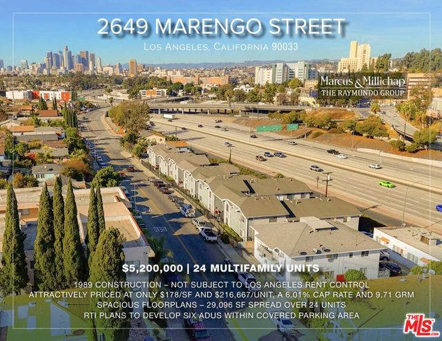 Constructed in 1989, the property is not subject to Los Angeles rent control and features an outstanding unit mix, with 75% of the units holding two, three, or four bedrooms. Available for only $178 per square foot, the property features spacious floorplans that average approximately 1,200 square feet per apartment. The sprawling lot features ample parking, with approximately 46 covered and open parking spaces atop the concrete driveway. Each of the three apartment groupings contains its own on-site laundry room, helping to provide additional cash flow to the owner. Many of the unit interiors have been updated with wood laminate flooring, and select units feature recessed lighting, new kitchen countertops, walk-in closets, and upgraded bathrooms. Shovel-ready plans have been approved and permits have been issued for six potential ADUs, which would be constructed within the existing covered parking areas (Buyer to verify). Implementing this ADU plan could add significant value to the asset, while simultaneously boosting annual income as the new ADUs could potentially generate more than$100,000 in annual revenue for the new investor. The property is conveniently located less than a half-mile from the LAC + USC Medical Center and the Keck School of Medicine campus, a major employer for the surrounding area. Tenants also enjoy convenient access to the 5, 10, 60, 101, and 710 Freeways, which are each within approximately two miles of the property. Downtown Los Angeles, Dodger Stadium, Crypto.com Arena, and L.A. Live are all within a 10-minute drive from the building, while tenants can easily travel to the trendy Arts District for its new dining and entertainment options.