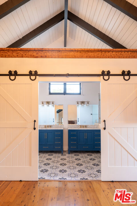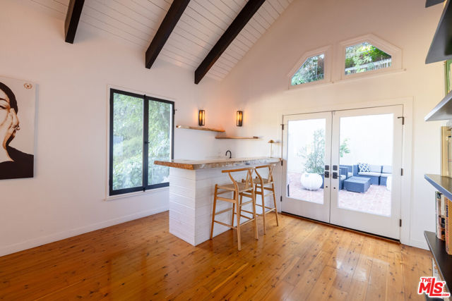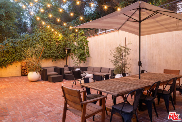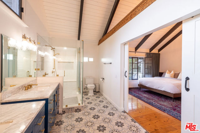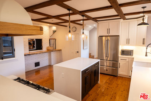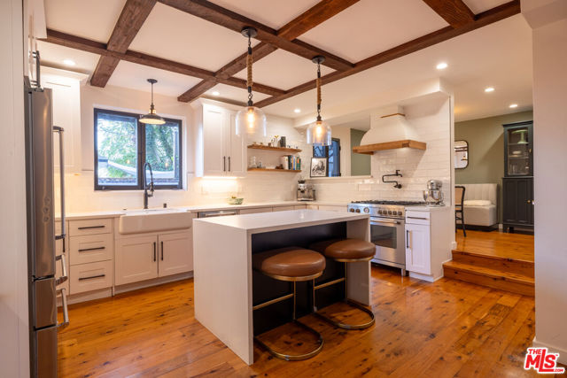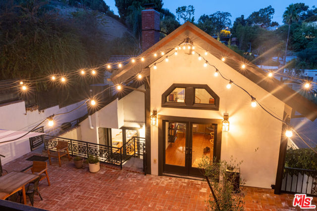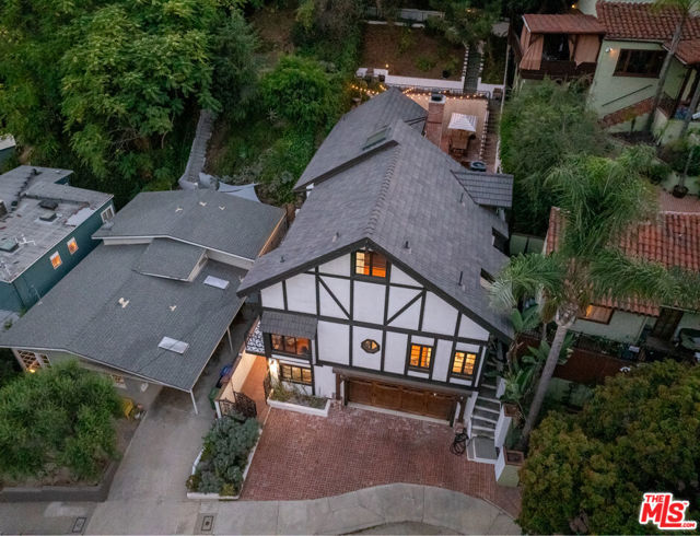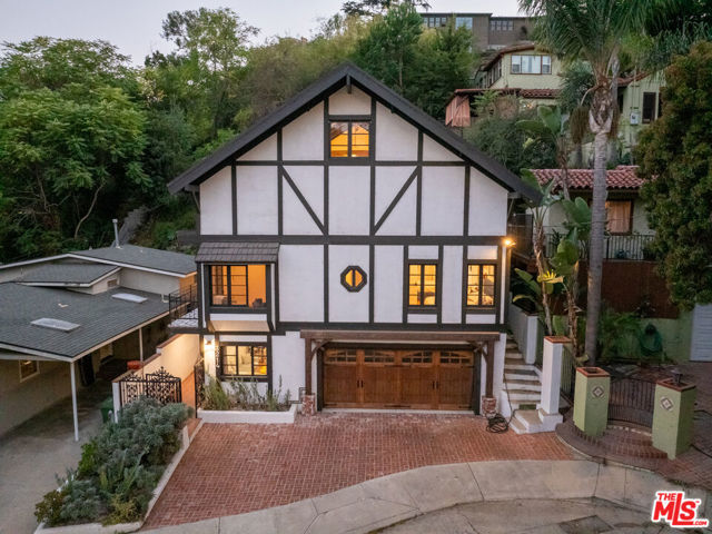 Tucked at the end of a quiet cul-de-sac just steps from the Silver Lake Reservoir and neighborhood favorites like LA Mill along Silver Lake Blvd, this 1939 English Tudor delivers major storybook vibes with modern upgrades throughout. The designer kitchen brings the heat with Bertazzoni appliances, a statement center island, farmhouse sink, and its own fireplace. The adjoining dining room shares the open fireplace and is drenched in natural light perfect for anything from low-key dinners to full-on dinner parties. A breezy atrium opens to a tranquil sitting area ideal for morning coffee or winding down at dusk. The living room brings all the drama with timber-beamed vaulted ceilings and a classic wood-burning fireplace. The terraced backyard is built for entertaining with multiple patio levels and lush privacy. Upstairs, the primary suite is pure magic vaulted ceiling, balcony views, and a dreamy ensuite that feels straight out of a boutique hotel. Cypress floors, flexible layout, seamless indoor-outdoor flow, this one checks every Silver Lake box.